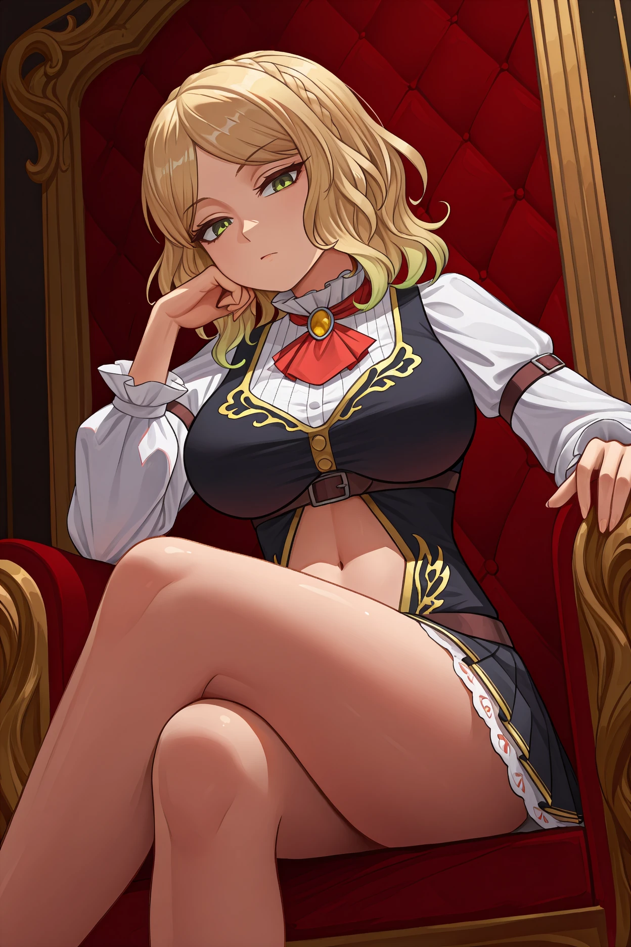 Demon King:carledk, belt buckle, brooch, brown belt, center opening, crown braid, lace-trimmed dress, gold trim, midriff, short dress, multiple belts, navel cutout, pleated dress, red ascot, white blouse, arm belt, white sleeves, stomach cutout, long sleeves, pinafore dress, sleeveless dress, black dress, yellow gemstone, frilled shirt collar, pleated shirt, scoop neck,