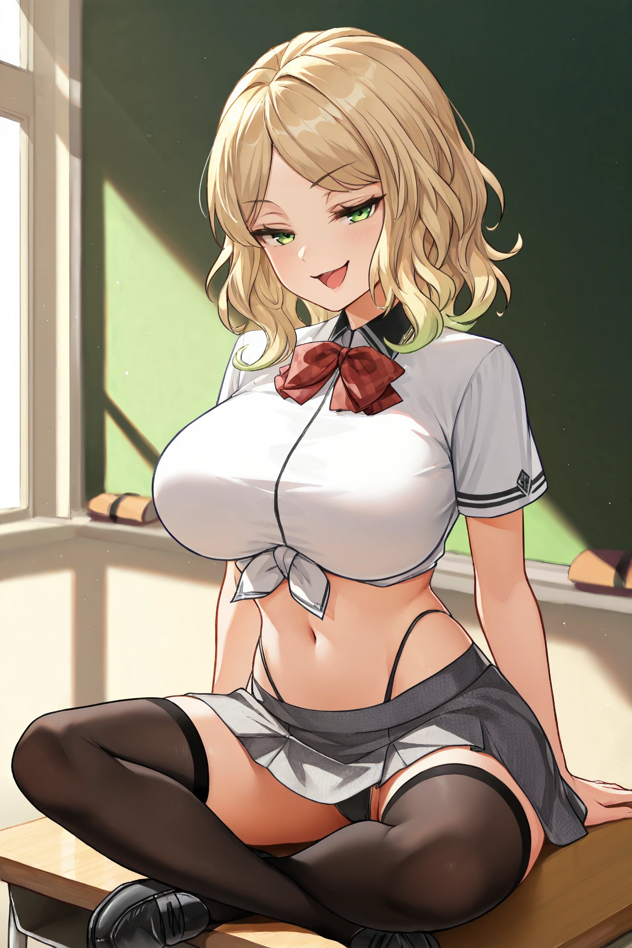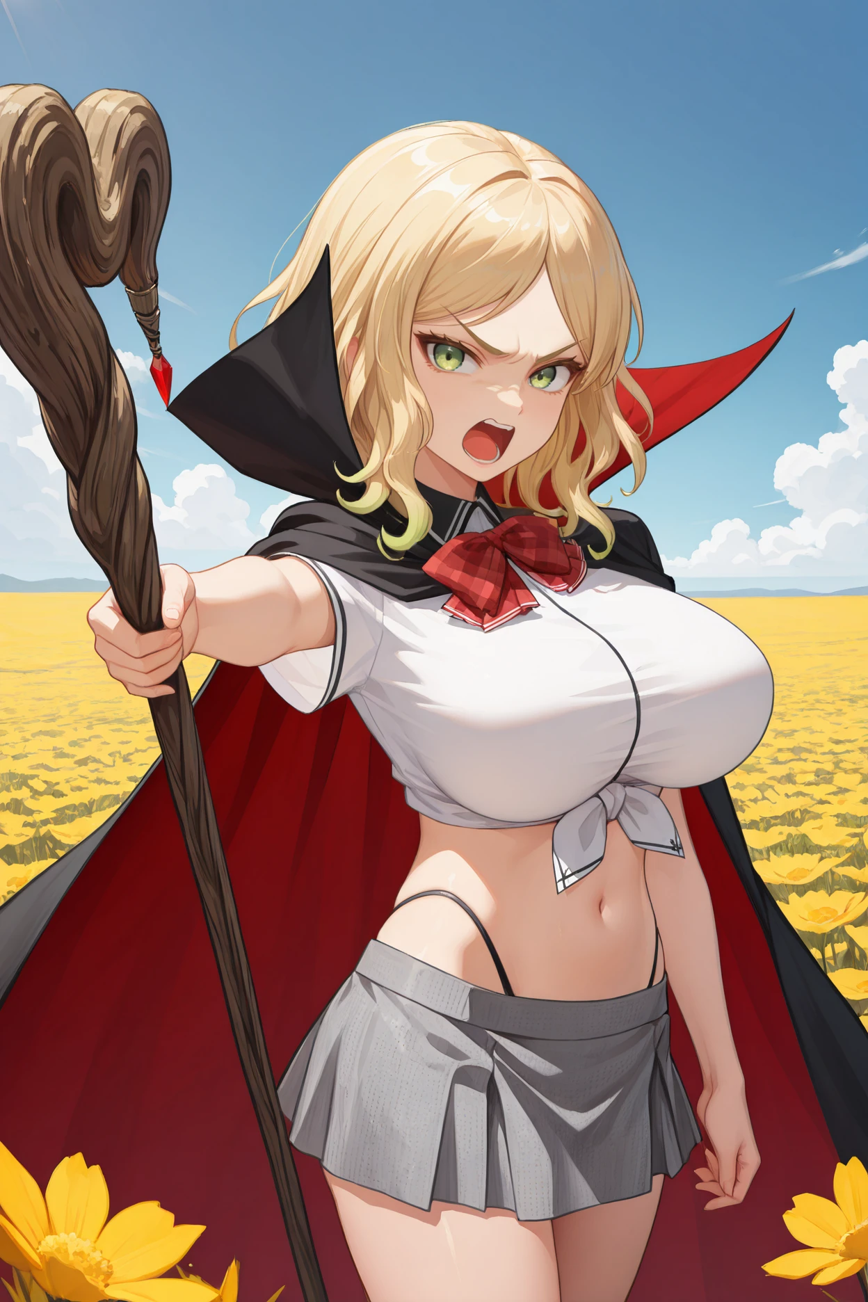 School: carlesch,black panties, checkered skirt, collared shirt, cowboy shot, front-tie top, grey skirt, impossible shirt, large breasts, miniskirt, red bowtie, white shirt, wing collar, highleg panties, string panties, contrast collar, plaid bowtie, short sleeves, black trim,stomach,navel,