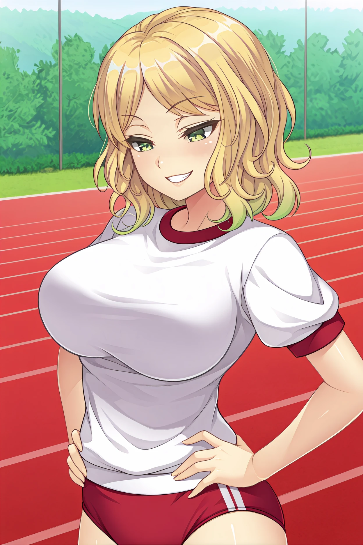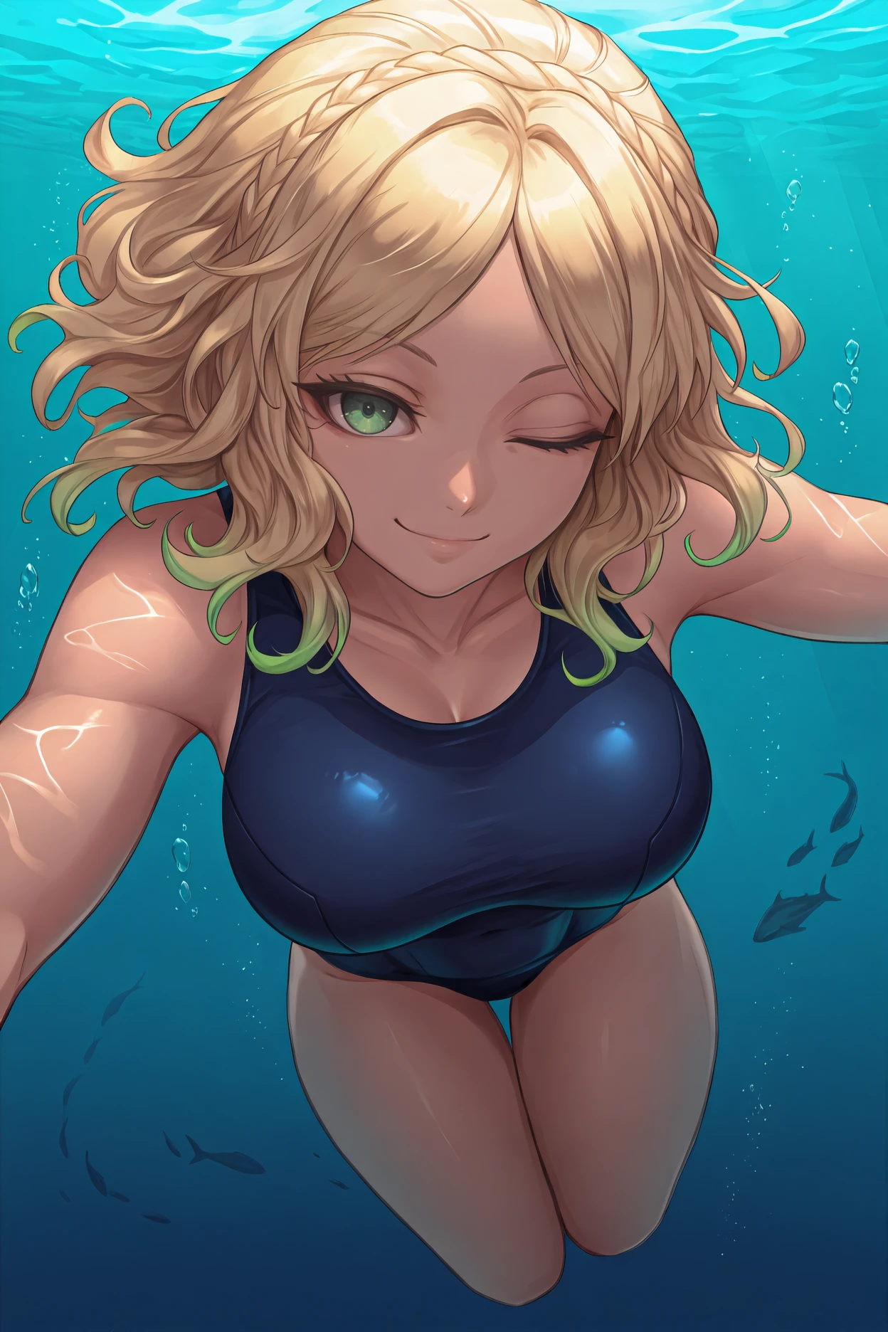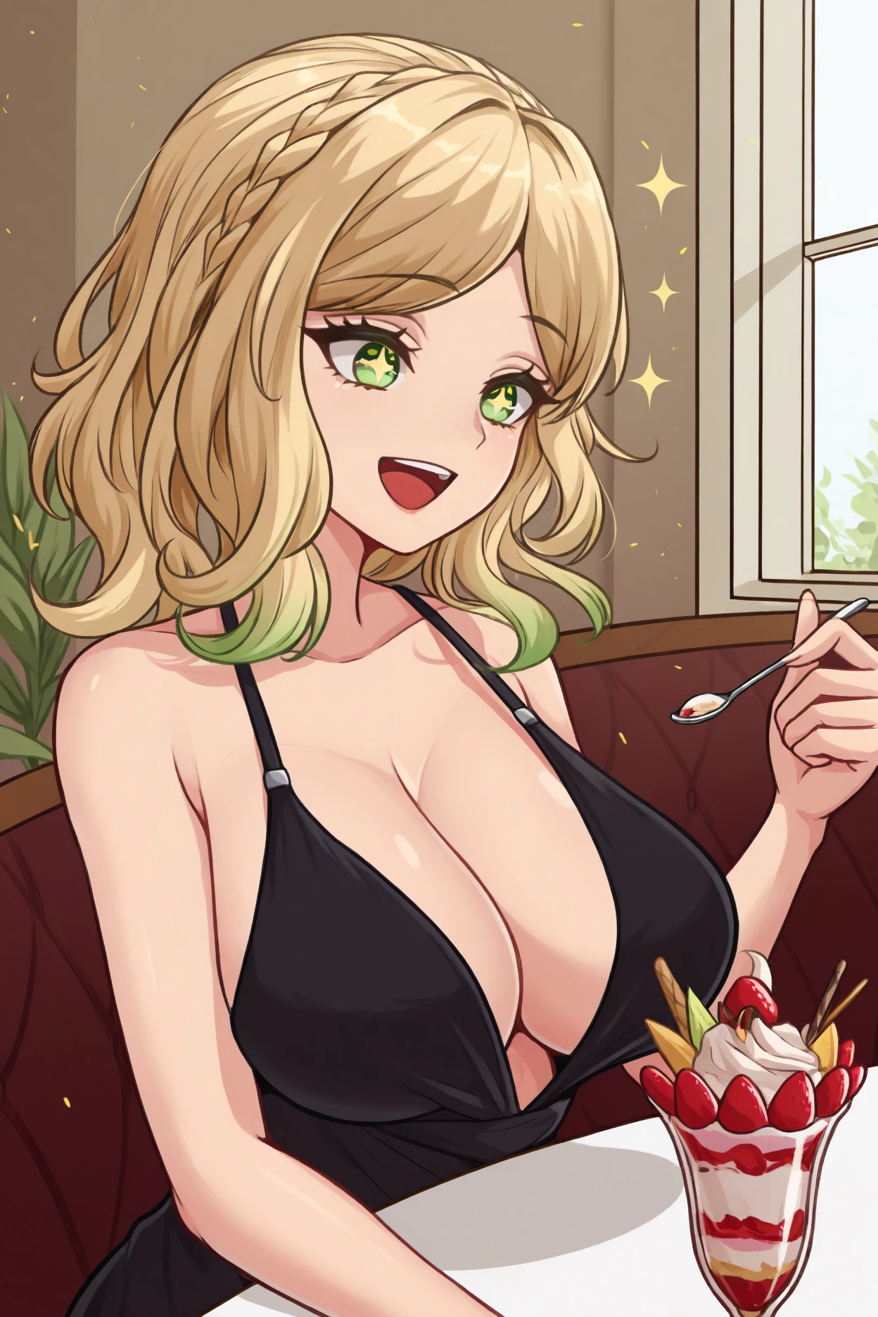 Base Appearance:blonde hair,gradient hair, green eyes, green hair, large breasts, medium hair,multicolored hair, parted bangs, wavy hair,