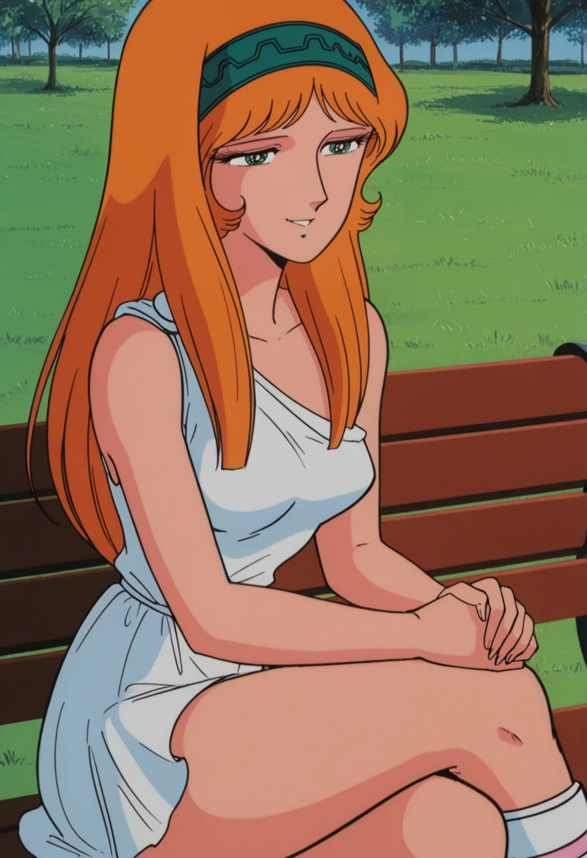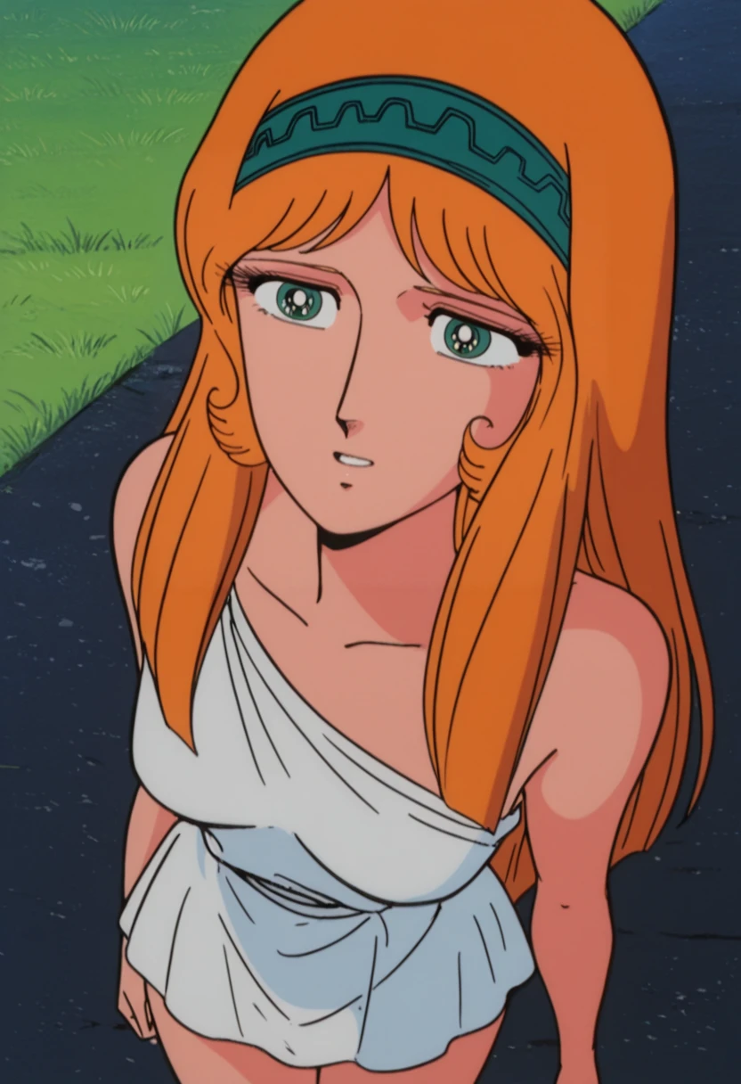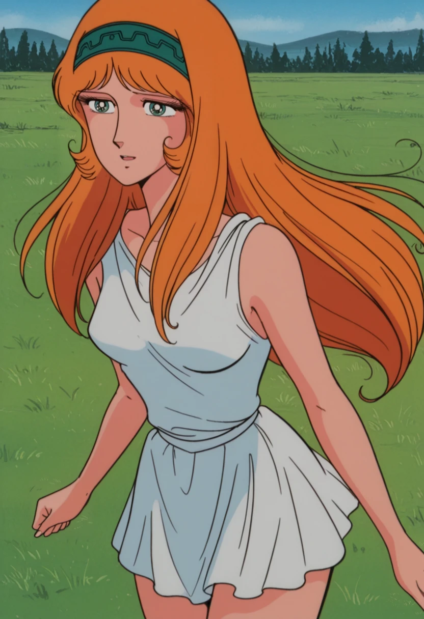 AmiaHuman, retro artstyle, 1970s \(style\), 1girl, solo, brown hair, long hair, green eyes, green hairband, large breast, curvy, large hips, white dress, bare shoulders, 1 shoulder strap, greco-roman clothes, short dress, skirt, sleeveless, white sandals, sandals with ties,Kyoko Kodaka (Amia´s Host)