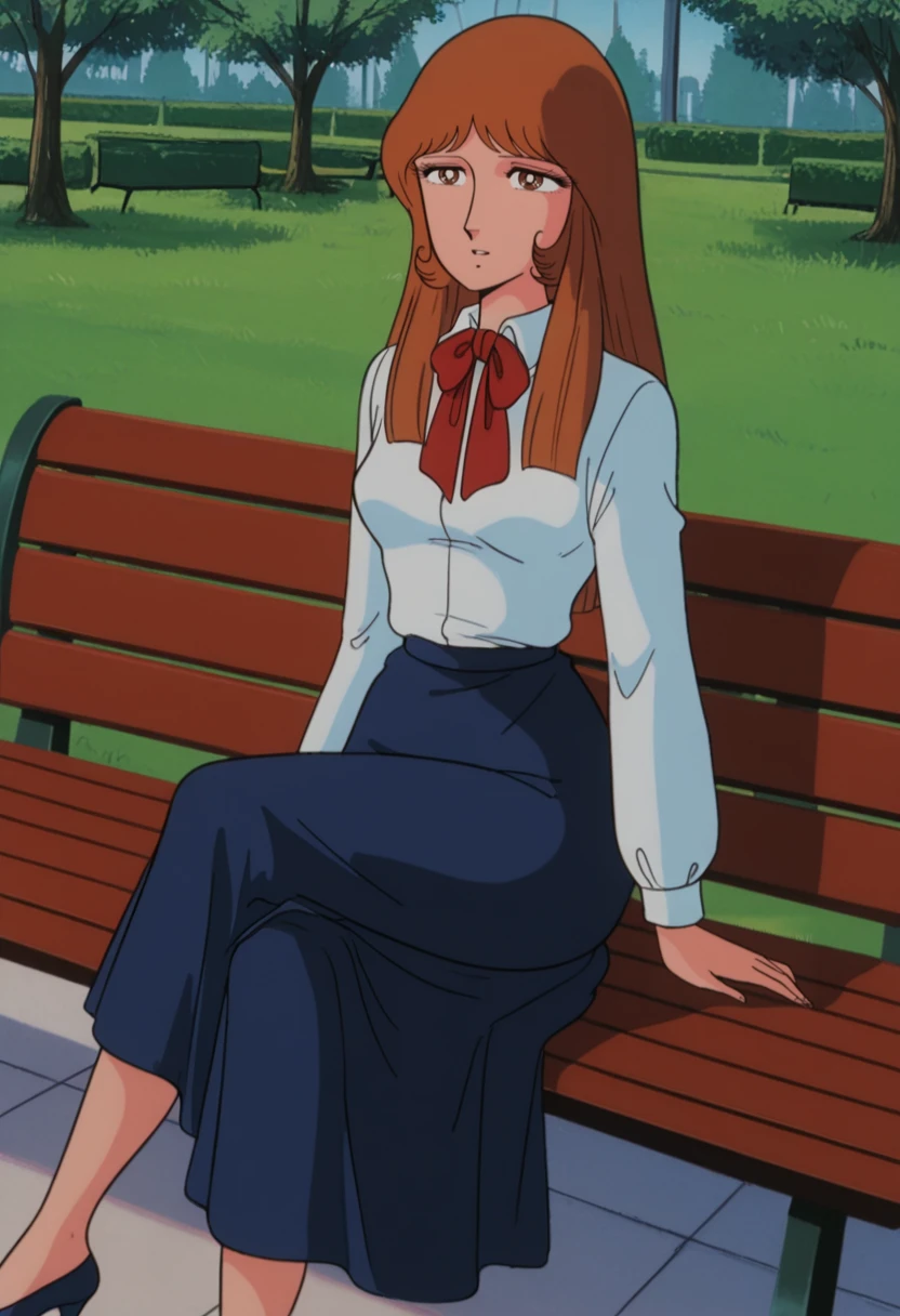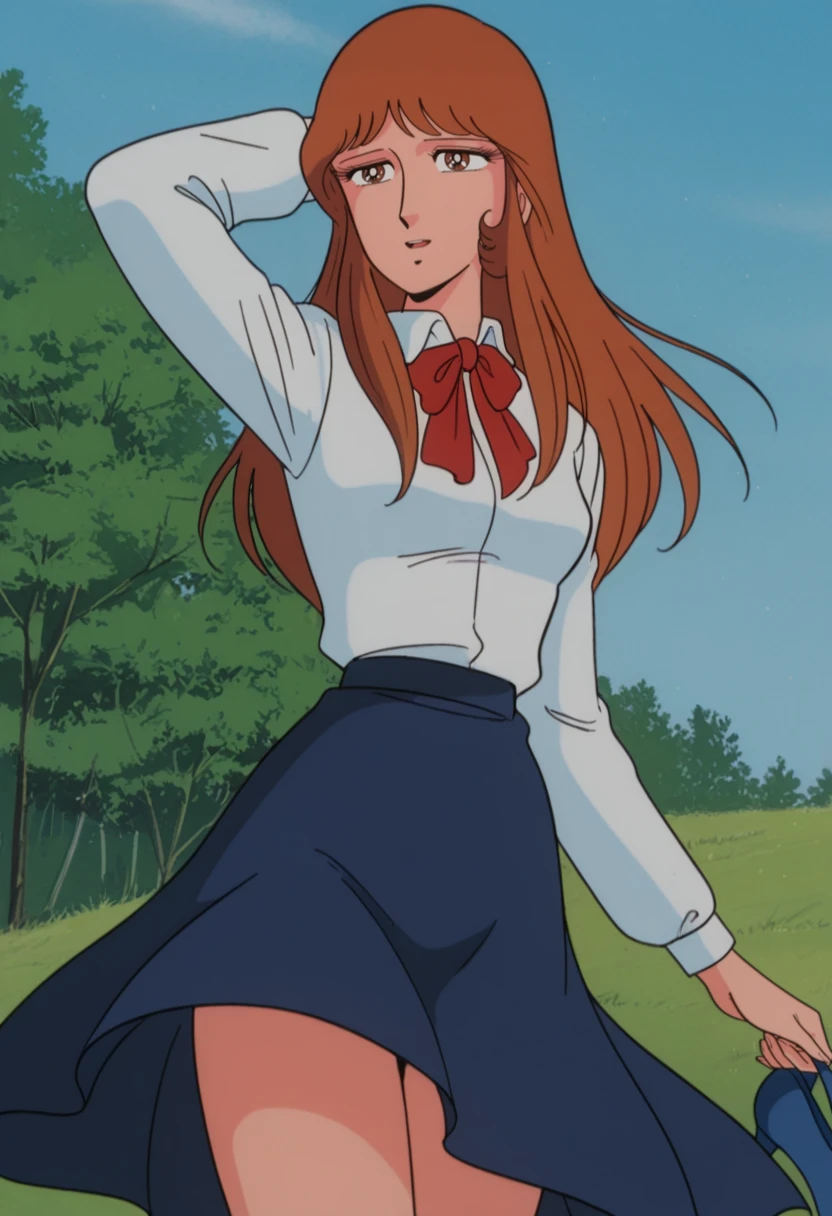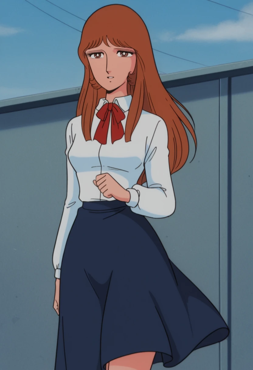 KyokoAmia, retro artstyle, 1970s \(style\), 1girl, solo, dark brown hair, long hair, brown eyes, large breast, curvy, large hips, white shirt, collared shirt, long sleeves, red bowtie, blue skirt, long skirt, heels, blue shoes, Amia Ultra Warrior