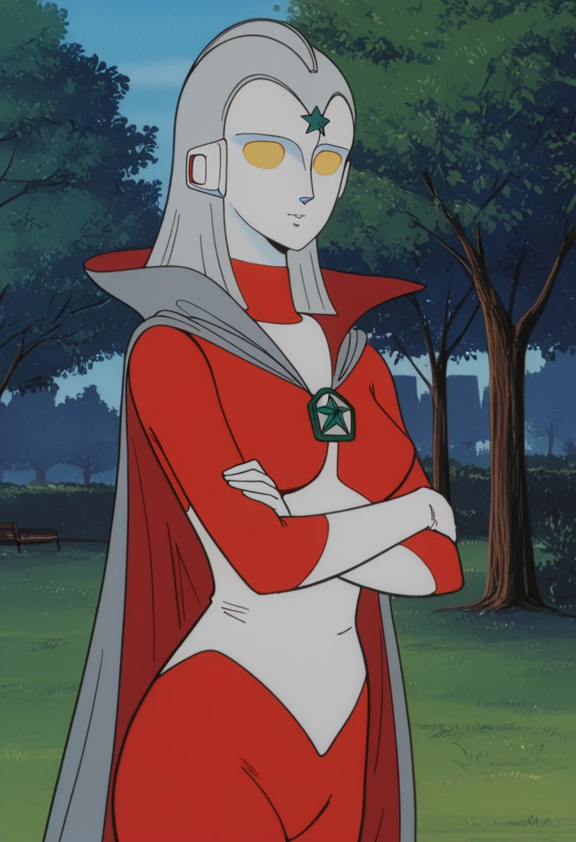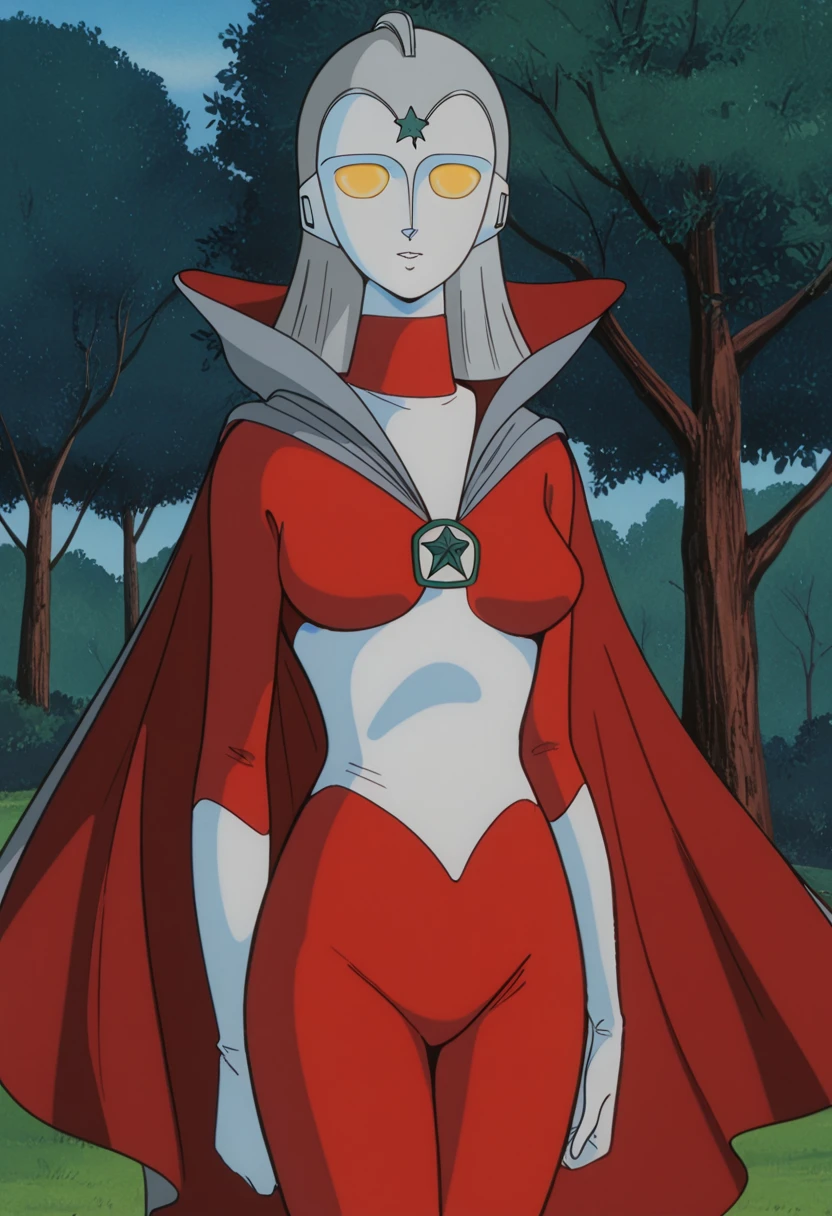 AmiaUltra, retro artstyle, 1970s \(style\), 1girl, solo, alien, grey hair, star \(symbol\) forehead mark, yellow eyes, no pupils, large breast, curvy, large hips, colored skin, white skin, red cape, red and white bodysuit, star \(symbol\) brooch, white knee boots,Optional Lingerie Outfit: