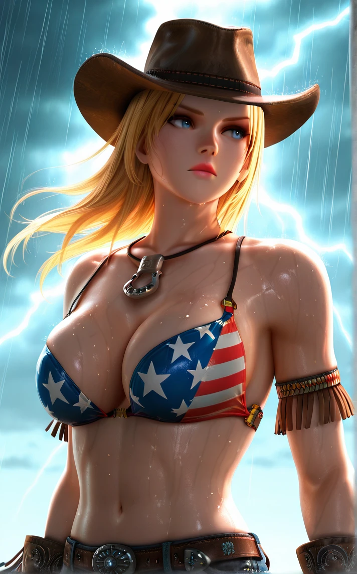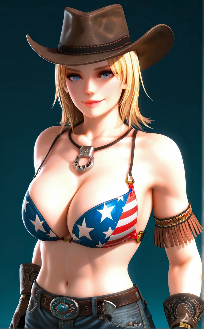 Main_FlagPrintBikiniHat_Tina_ownwaifu, 1girl, 3d, blonde hair, blue eyes, eyelashes, jewelry, large breasts, lips, nose, cowboy hat, brown headwear, short hair, necklace, long hair, cleavage, american flag bikini, bare shoulders, flag print, navel, star (symbol), belt, brown gloves, denim, star print, collarbone, jeans, lipstick, makeup, midriff, pants, american flag print, armlet, multicolored hair, pink lips, two-tone hair, armband, fringe trim, leather gloves, parted bangs, toned, belt buckle, brown belt, buckle, pendant, print bikini, spaghetti strap,