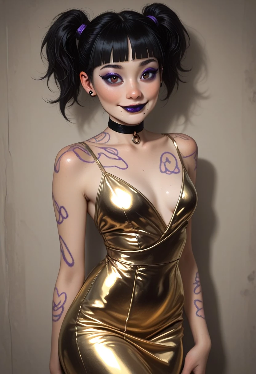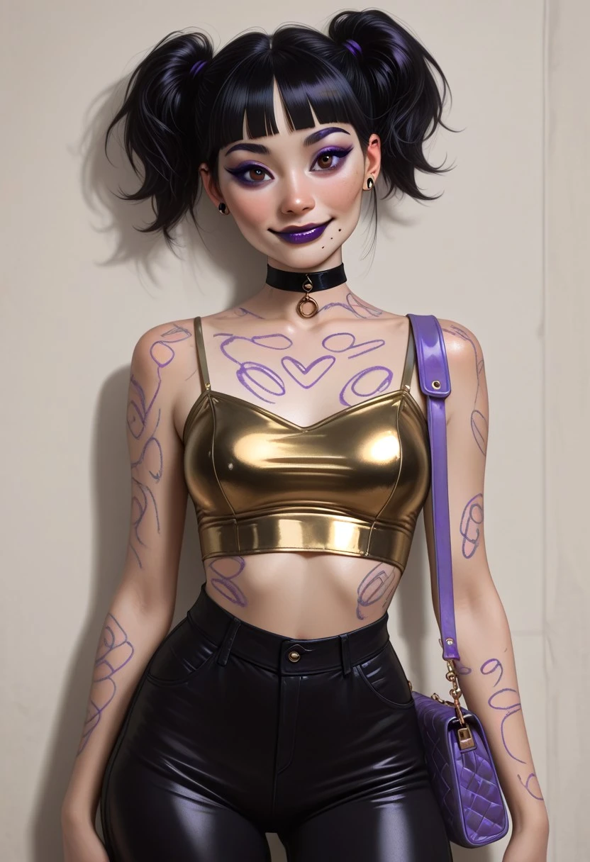 black hair, blunt bangs, short twintails, brown eyes, purple eyeshadow, eyeliner, smudged lipstick, asymmetrical smudge, mole under mouth, single mole, scribbles on skin, doodles on skin, ear piercing, choker