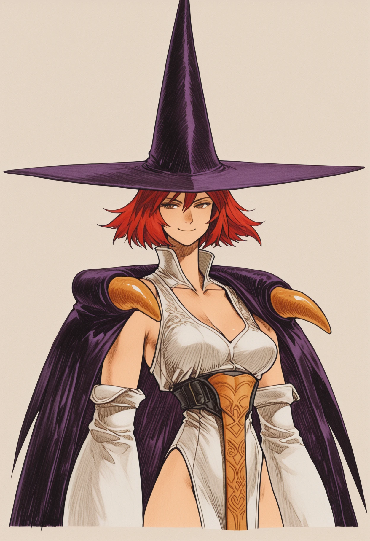 tessatabasa, 1girl, blue eyes, red hair, short hair, messy hair, hair between eyes, high collar, cape, detached cape, witch hat, pointy hat, wide brim, puffy detached sleeves, bare shoulders, large breasts, cleavage, belt, high belt, pelvic curtain, puffy pants, pants tucked in, boots, fingerless gloves, bridal gauntlets, necklace, gem, pointy footwear, As always, I hope you enjoy this lora, and if you are, then please consider dropping a gen or two below. It helps me keep these models coming!