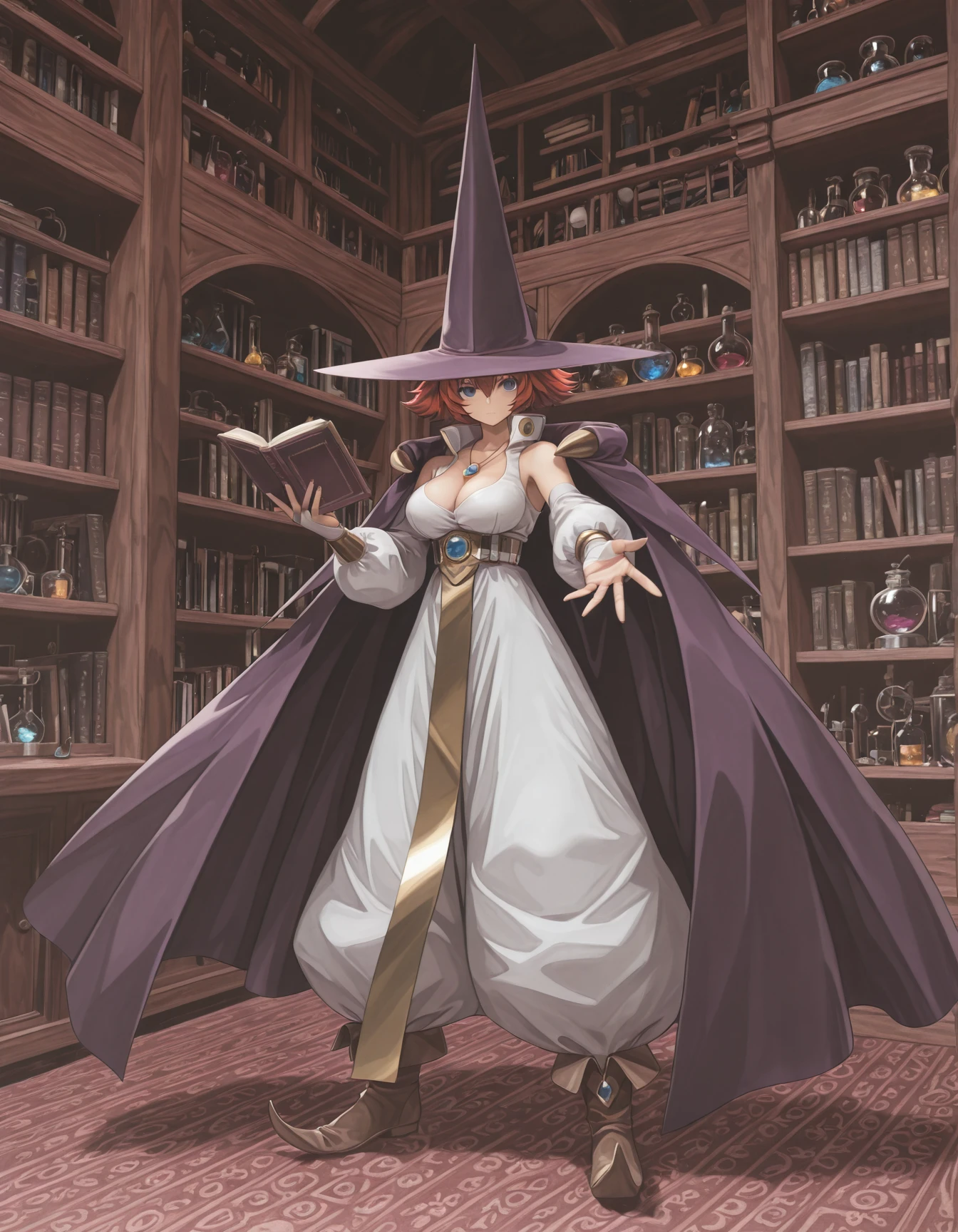 1girl, red hair, short hair, messy hair, hair between eyes, high collar, cape, detached cape, witch hat, pointy hat, wide brim, puffy detached sleeves, belt, high belt, pelvic curtain, puffy pants, pants tucked in, boots, fingerless gloves, bridal gauntlets, necklace, gem, pointy footwear, shoulders, blue eyes,