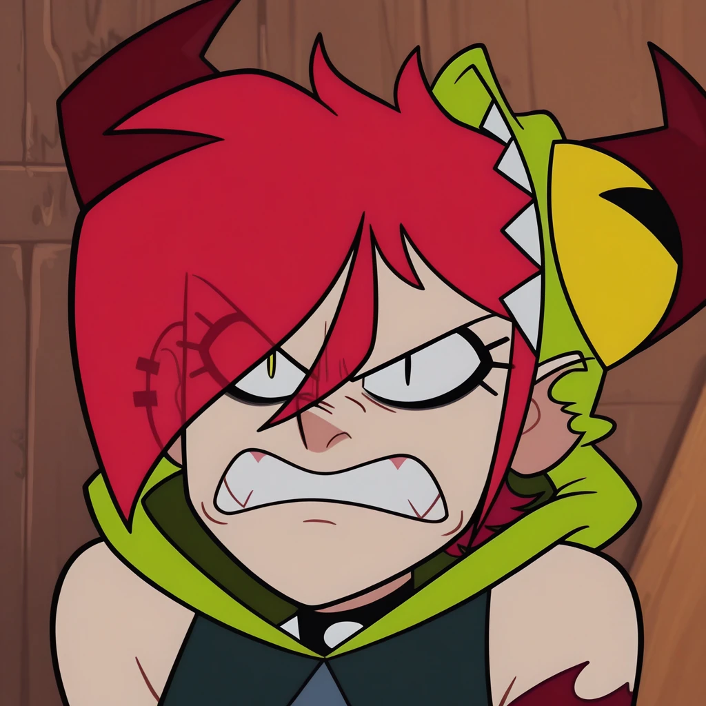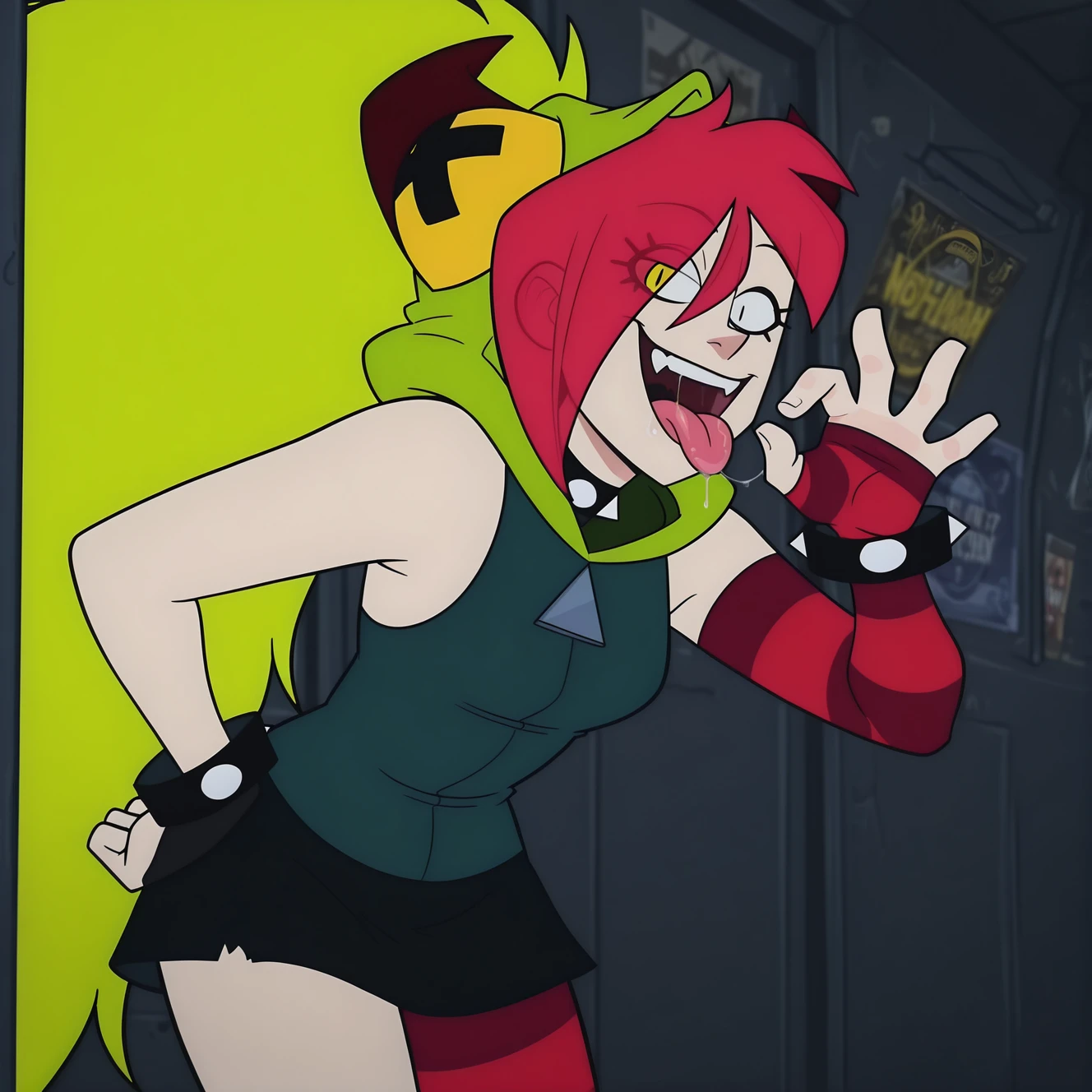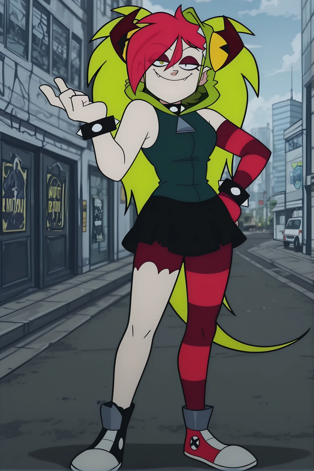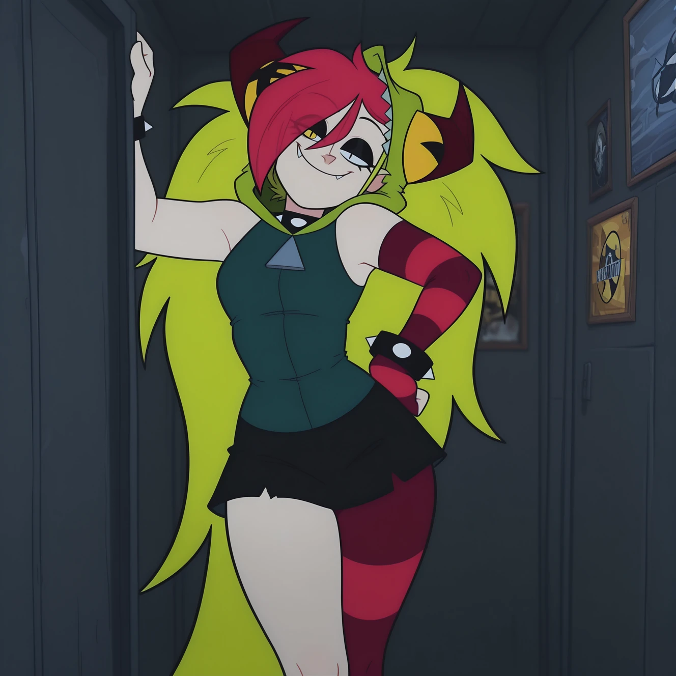 D3m3nc1a, flat colors, not furry, solo, female, human, white skin, red hair, swept bangs, hair between eyes, eyelashes, eyeliner, heterochromia, asymmetrical clothing, mascot costume, green hood, bare shoulders, slit pupils, hair over eye, 2 horns, green mane, big hair, red bangs, skirt, pantyhose, bare leg,