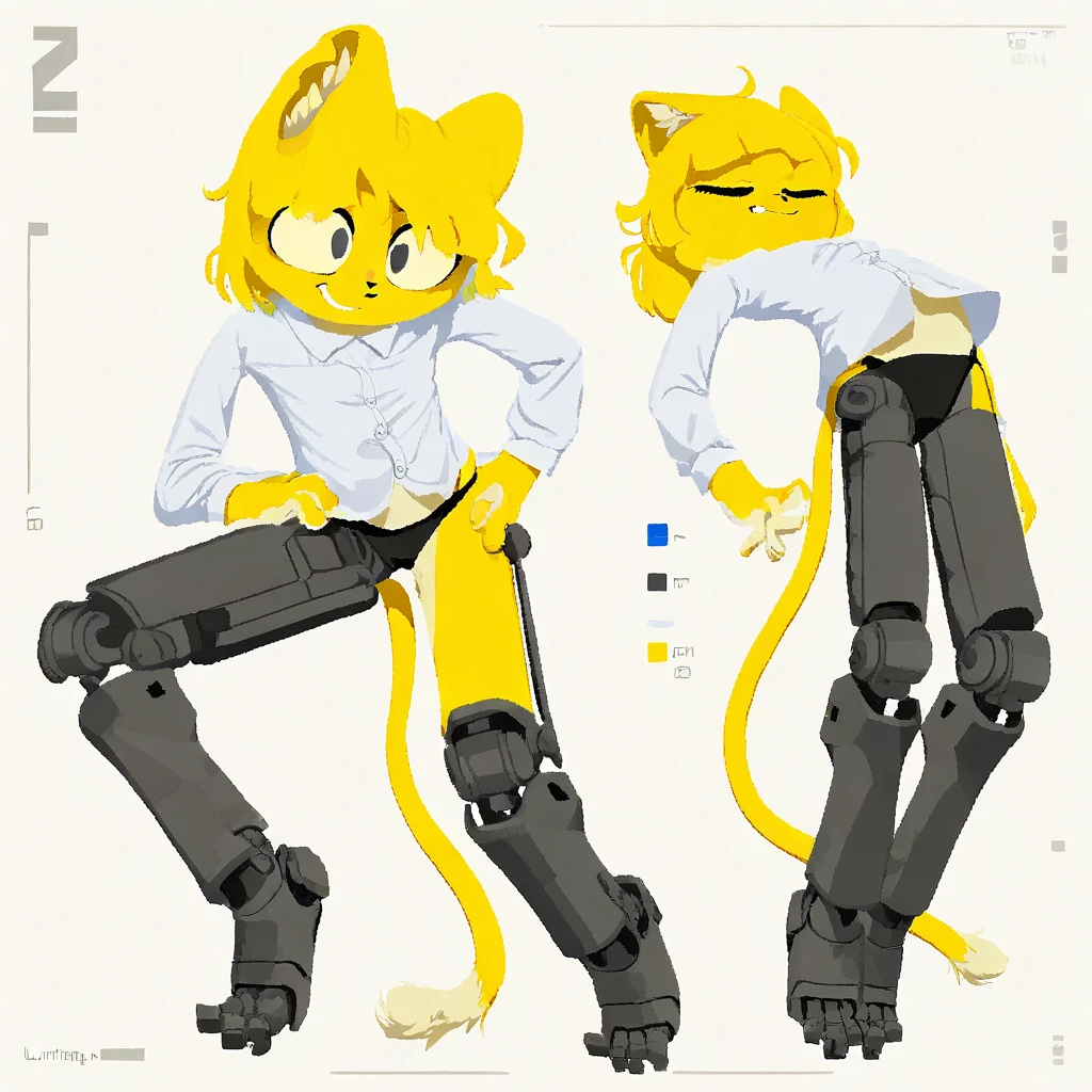 lemon, 1girl, solo, anthro, furry, yellow cat girl, short hair, cat ears, tail, white shirt, black shorts, black robotic prosthetic legs and feet, expressive yellow fur, dot eyes, black pupils, rounded eyes,