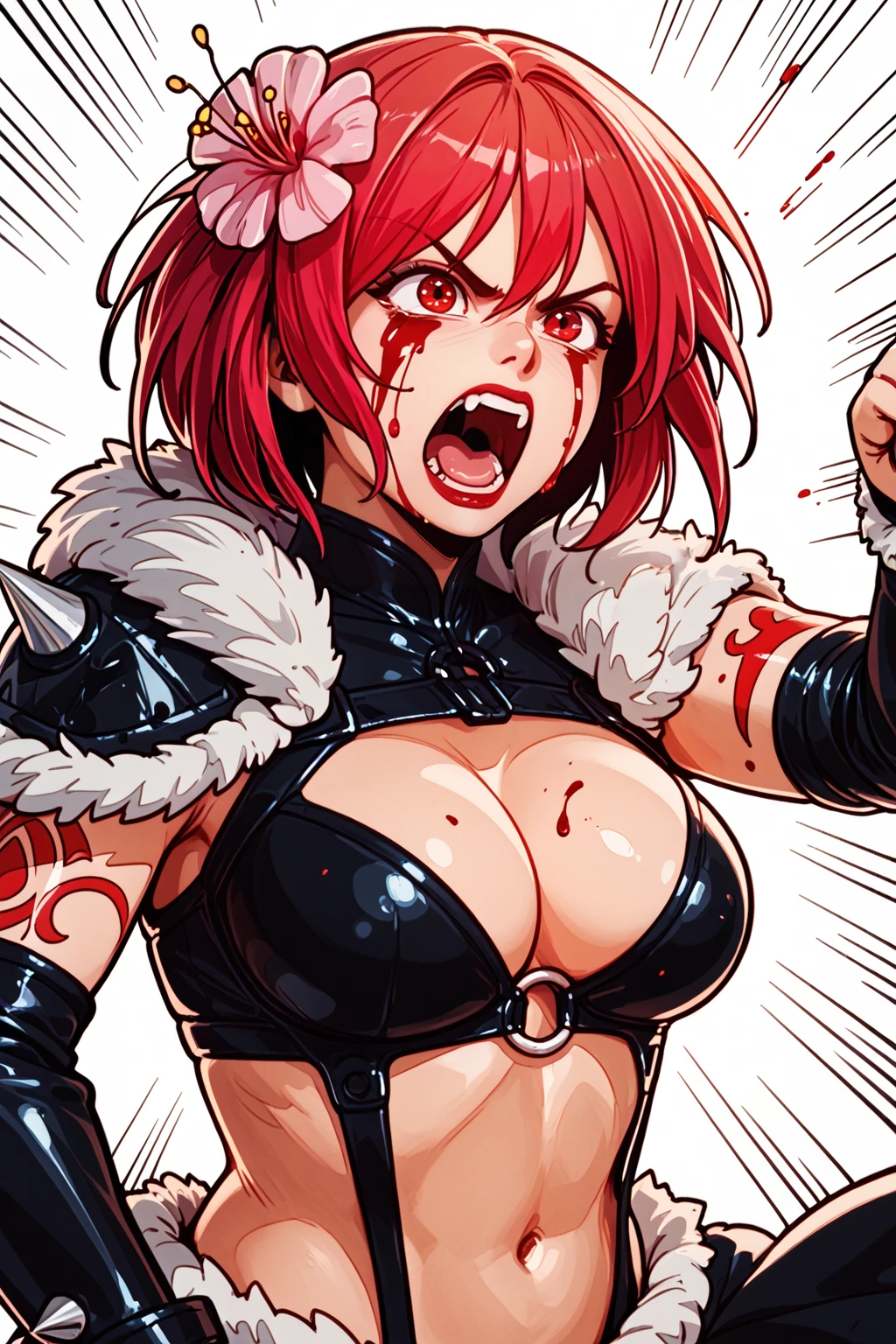 Trigger Fighting : 1girl, short hair, bangs, flower, jacket, tank top, skirt, thighhighs