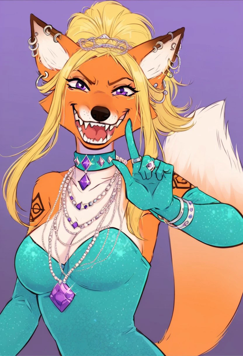 Shemeshka, furry, fox, anthro, female, blonde hair, smug face, ponytail haircut, front strands, orange fur, purple eyes, white stripes under the eyes , white spot on the muzzle, shoulder tattoo, left shoulder tattoo, vine diadem, pierced ears, rings in the ears, aquamarine choker with gems, choker with gems, jewelry, pearl necklace, aquamarine dress, sequined dress, long gloves, sequined gloves, aquamarine gloves, bracelets on the hands, silver rings, gold rings.