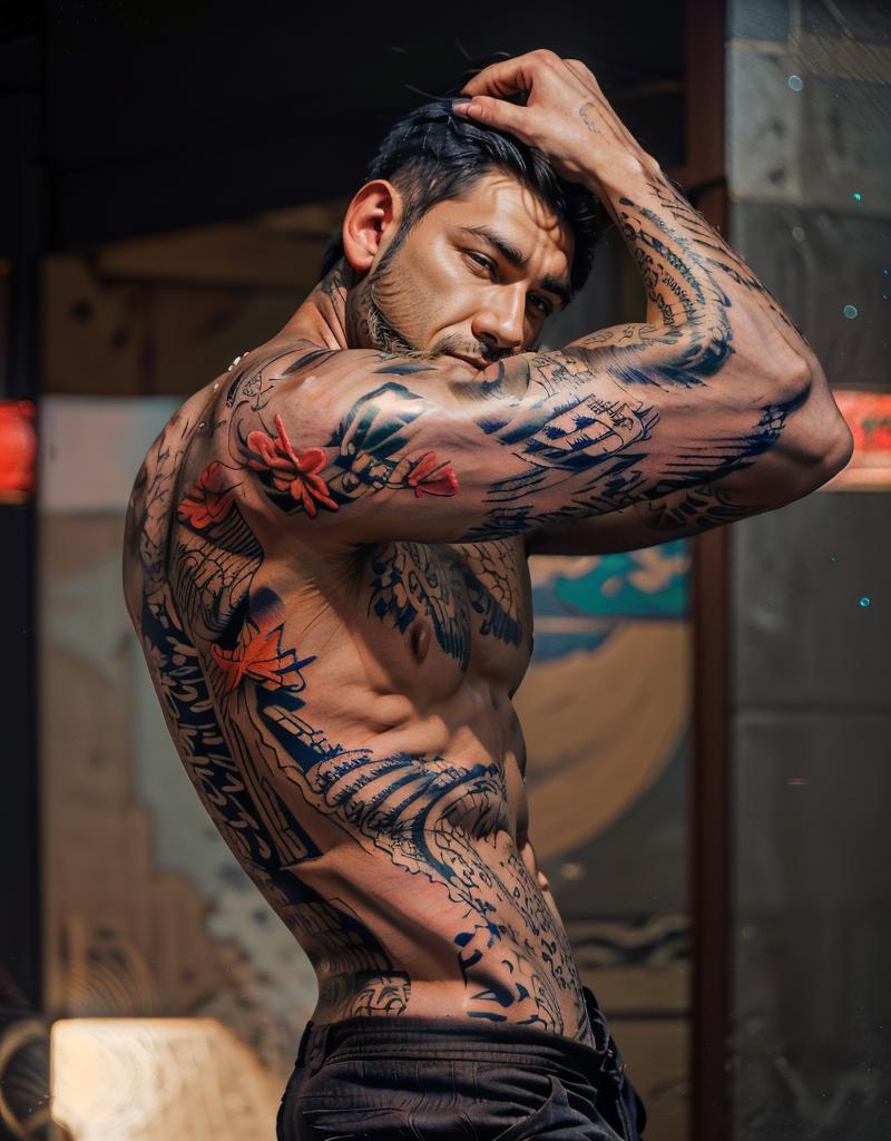 REMEMBER to follow the social networks and ask for your own model. Hello guys, it's YeiyeiArt! Today, I bring you a very interesting concept that I believe you'll love. It's a model that allows you to imitate the popular Yakuza-style tattoos from Japan, the ones used by the notorious mafia. You might have seen them in anime and movies. These tattoos come with fascinating patterns and colors, and you can place them anywhere on the body by simply specifying it in the prompts! Use the model with strengths between <1.0 - 0.5> for better results. Use the keyword "Yakuzatattoo" for more precision. Follow me on social media and leave a review if you liked the model, it helps a lot ;D HAVE FUN!!