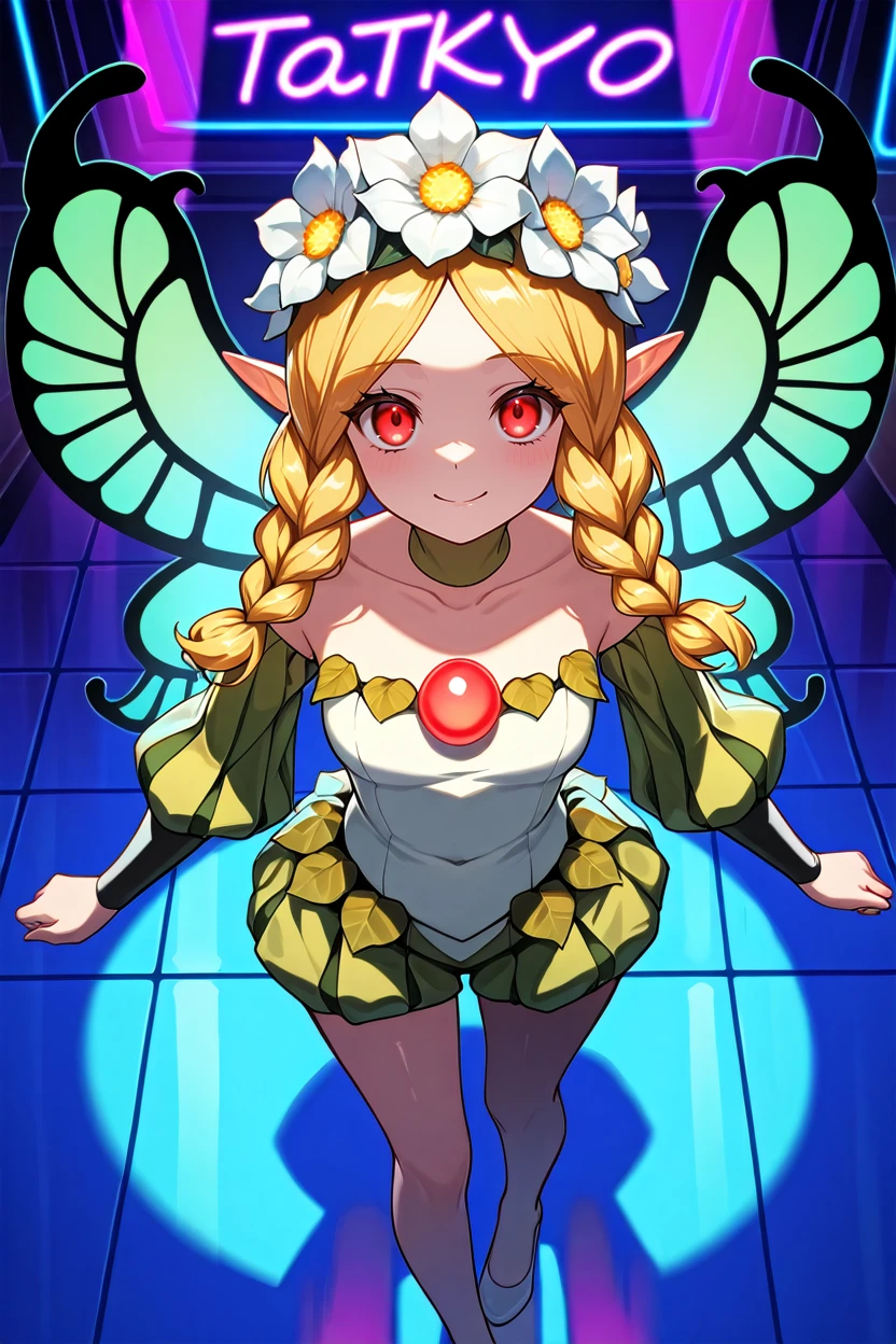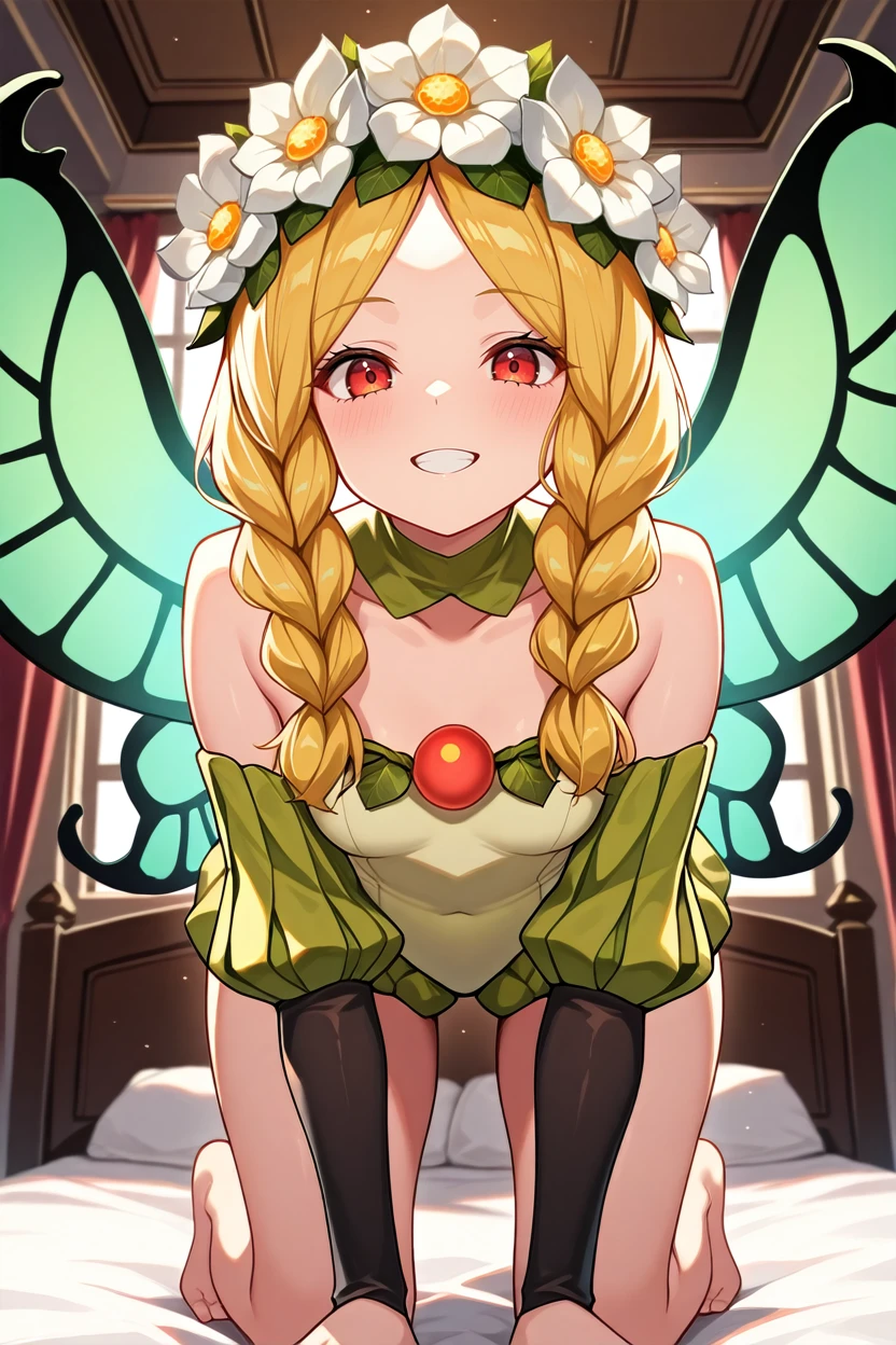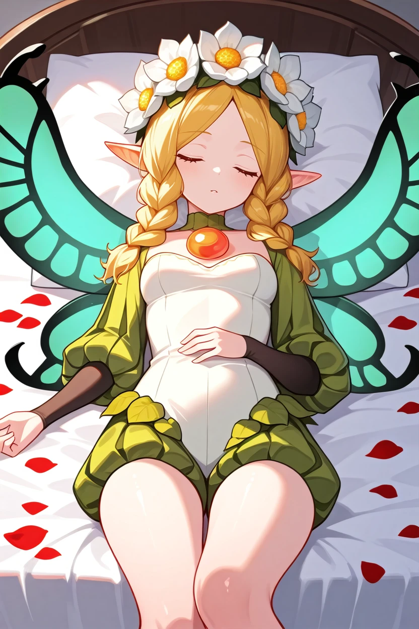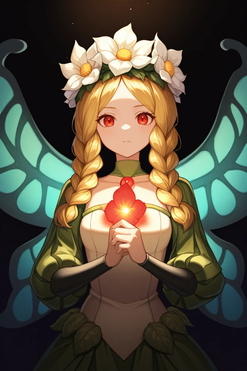 OdinSphereMercedes, 1girl, blonde hair, twin braids, red eyes, flower crown, fairy wings