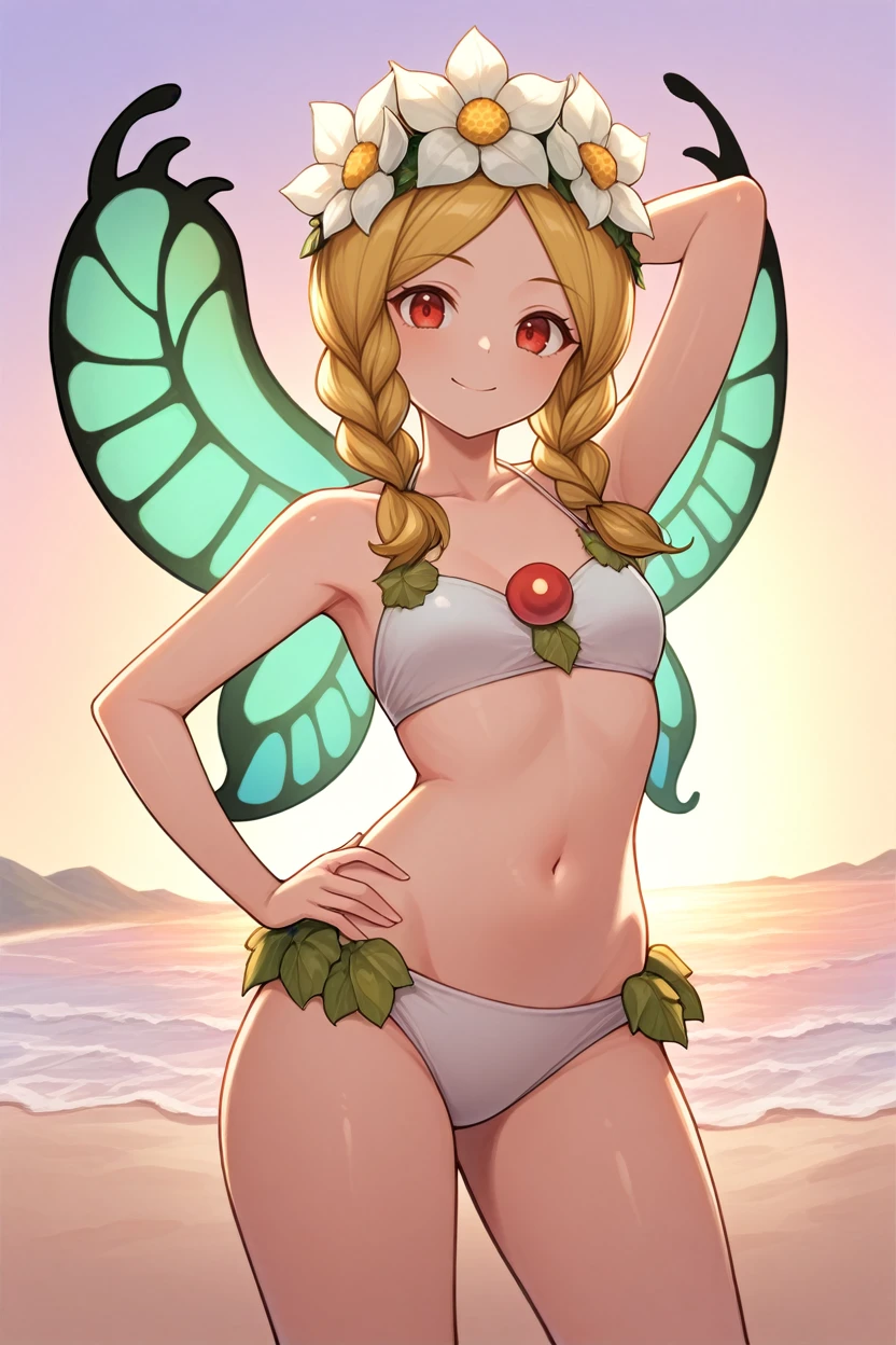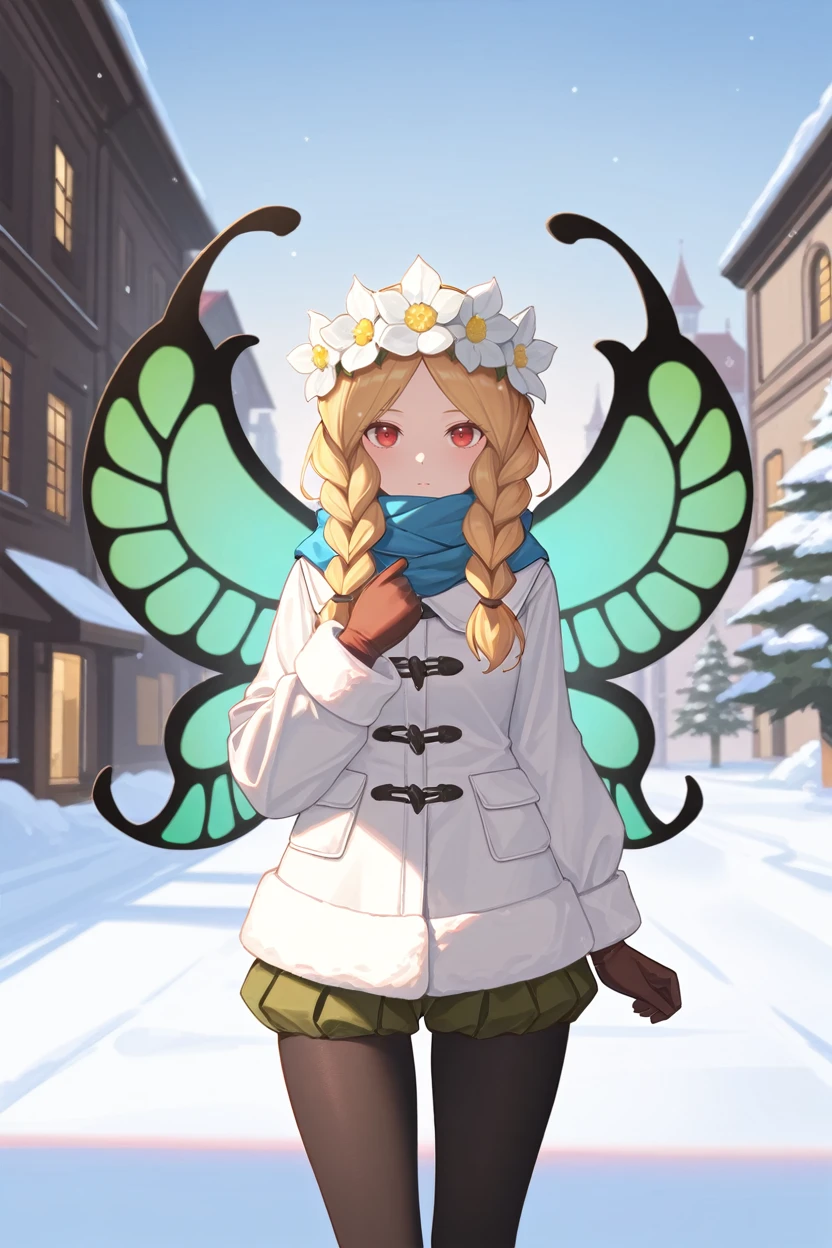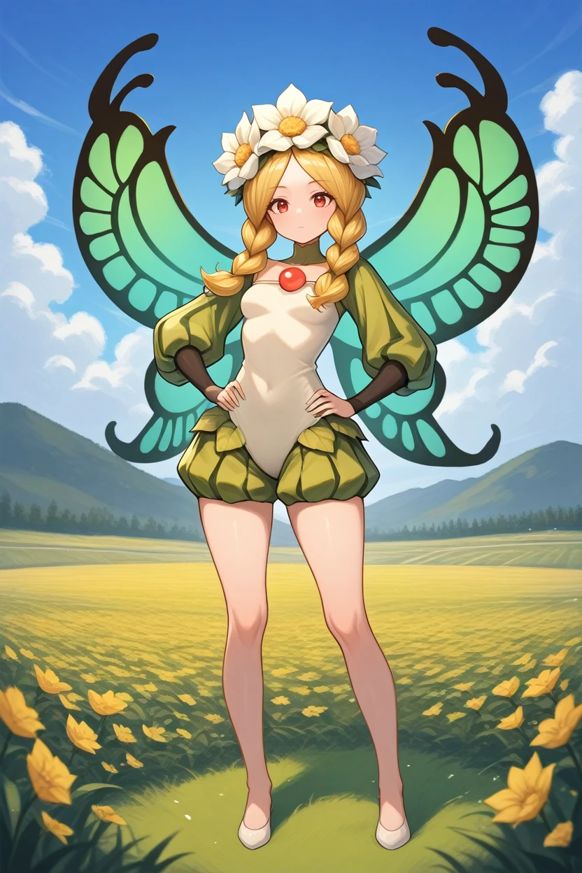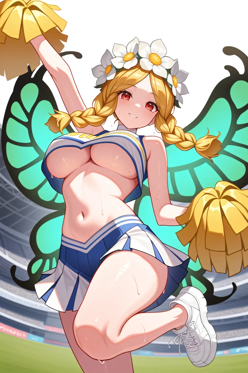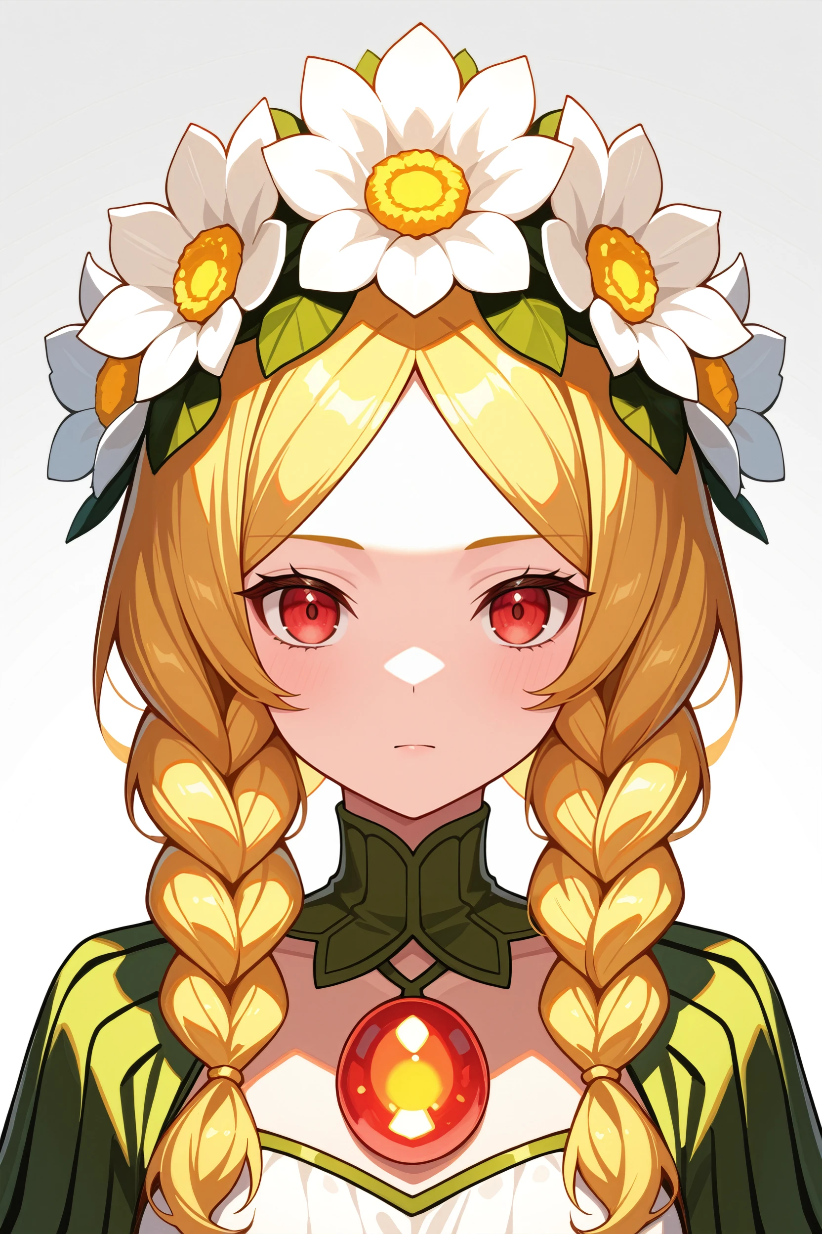 OdinSphereMercedes, 1girl, blonde hair, twin braids, red eyes, flower crown, fairy wings