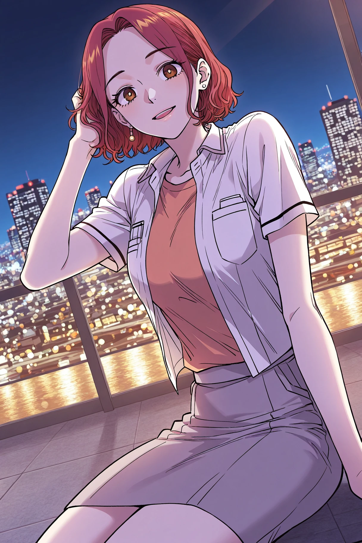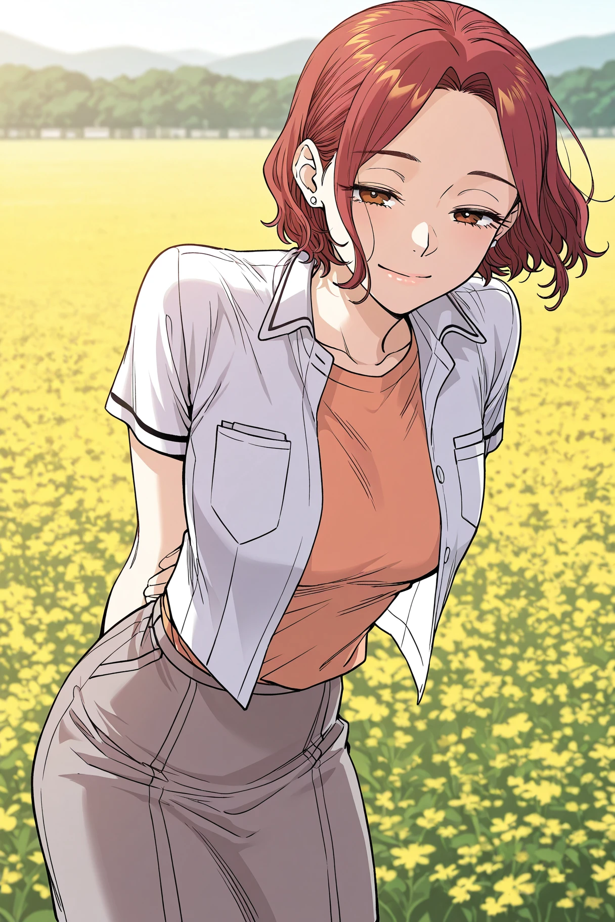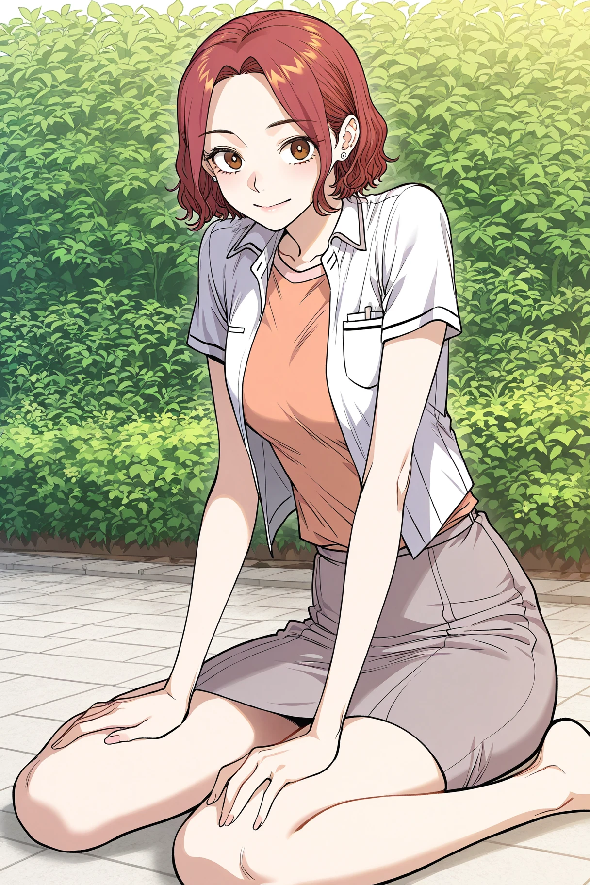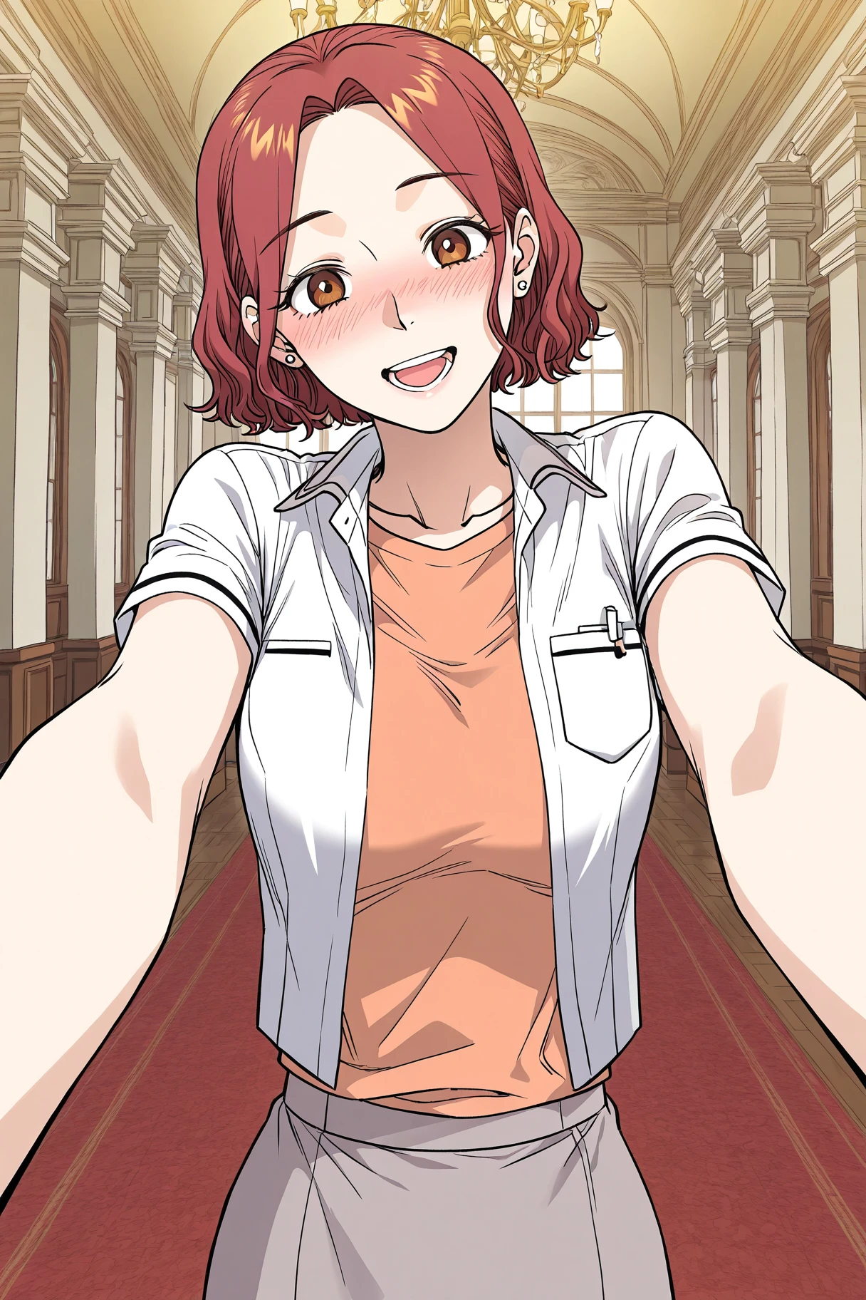 Choise_outfit, white shirt, short sleeves, open shirt, chest pocket, orange top, gray skirt,