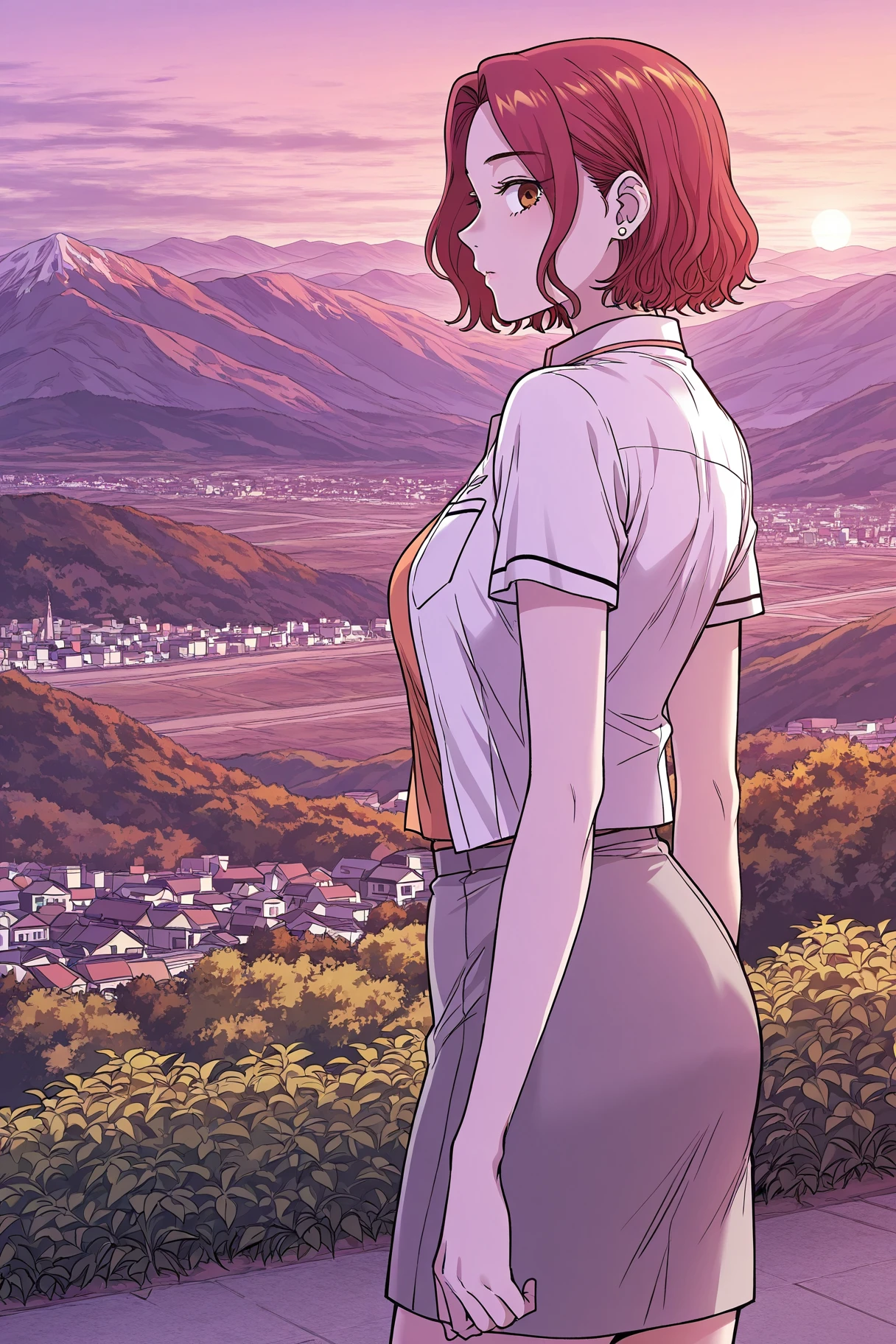 Choise, 1girl, solo, brown eyes, dusty pink hair, short hair, wavy hair, center parted bangs, small earrings,