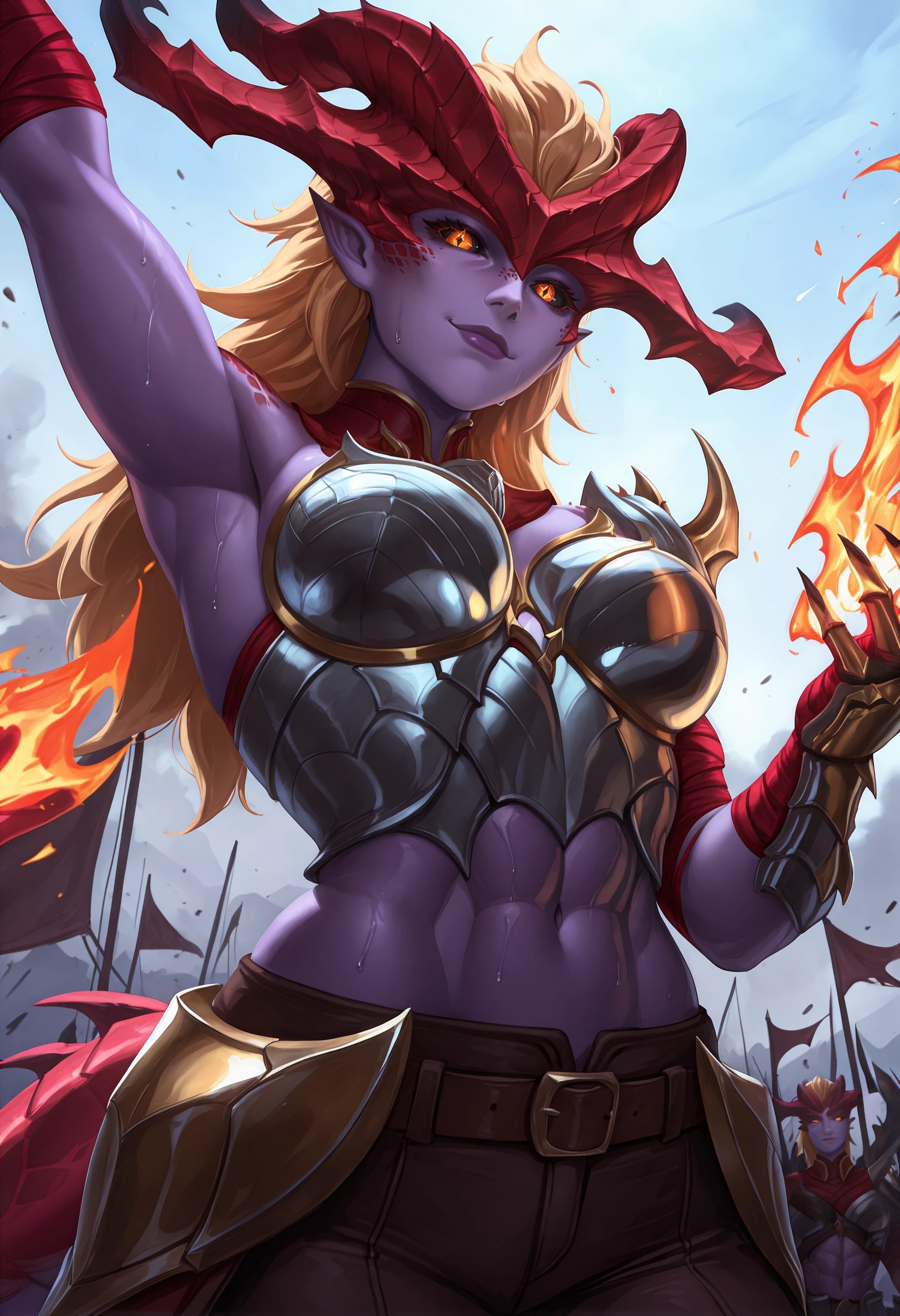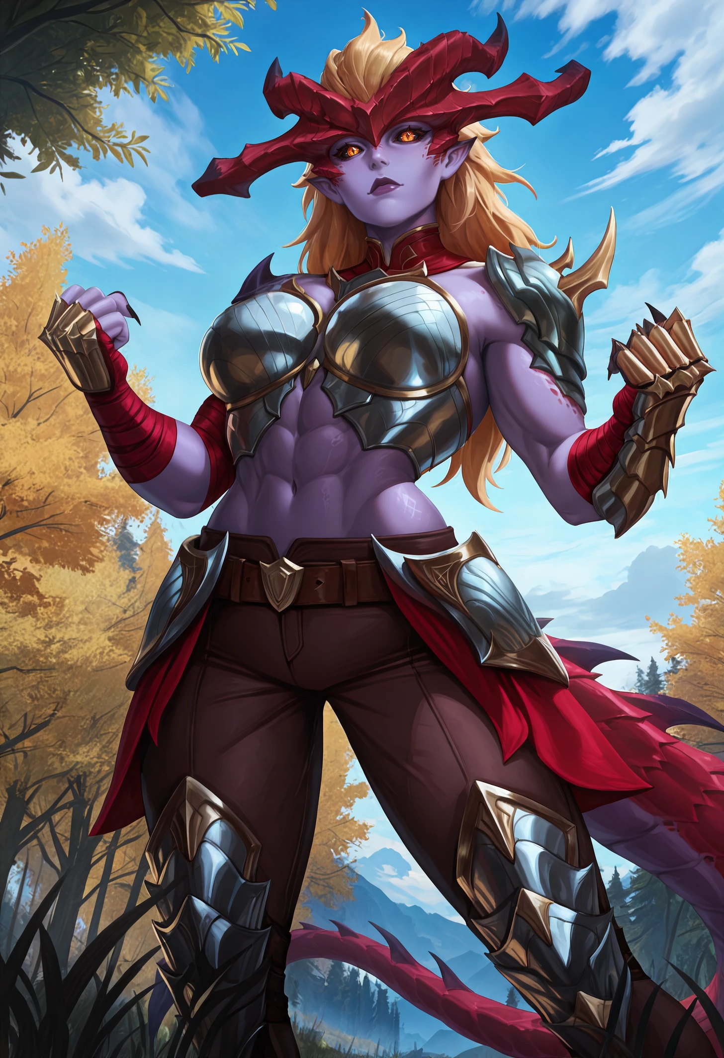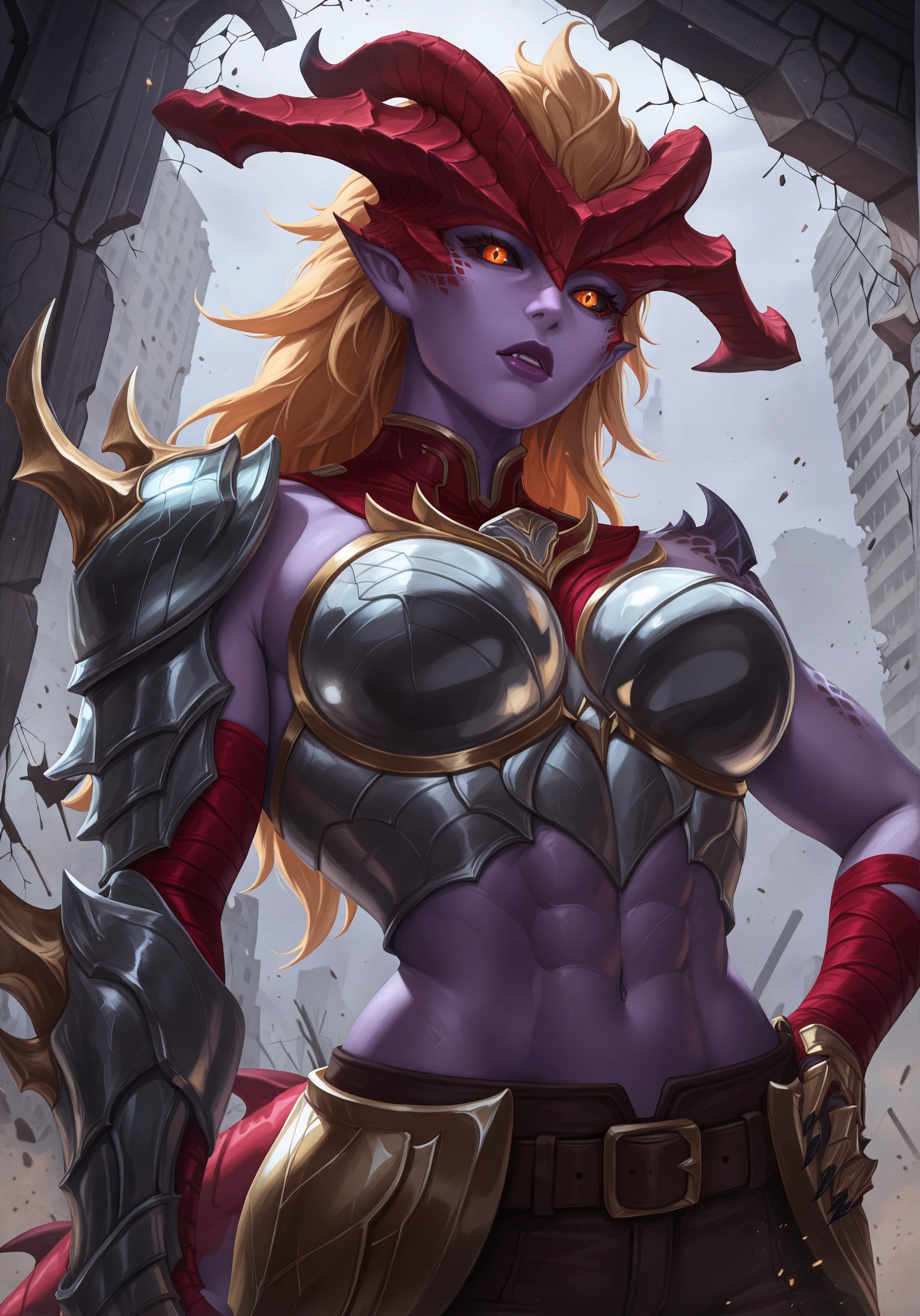 shyvrw, orange eyes, diamond-shaped pupils, colored sclera, black sclera, blonde hair, long hair, hair behind ear, hair slicked back, big hair, colored skin, purple skin, lipstick, purple lips, pointy ears, red horns, demon horns, scales, detached collar, red collar, boobplate, medium breasts, aqua armor, toned female, abs, navel, shoulder spikes, single shoulder pad, gold trim, asymmetrical gloves, bandaged arm, red bandages, uneven sleeves, single gauntlet, fingerless gloves, clawed gauntlets, sharp fingernails, red tail, dragon tail, large tail, spiked tail, brown pants, brown belt, crossed belts, belt buckle, faulds, knee armor, leg armor, toeless legwear, bridal legwear, sharp toenails,