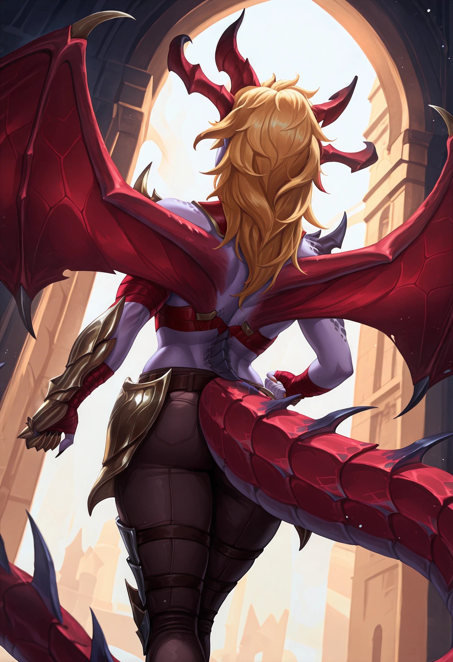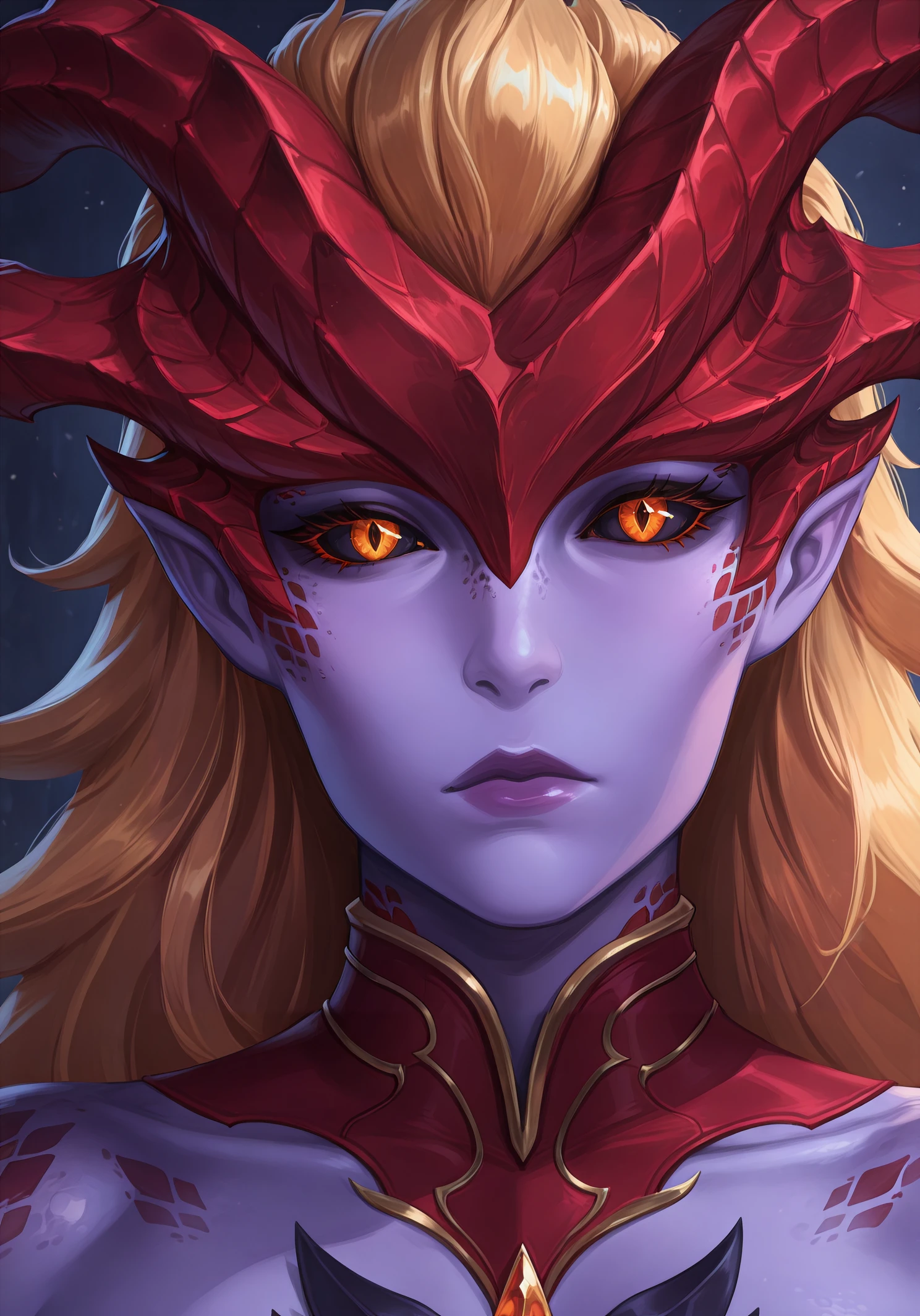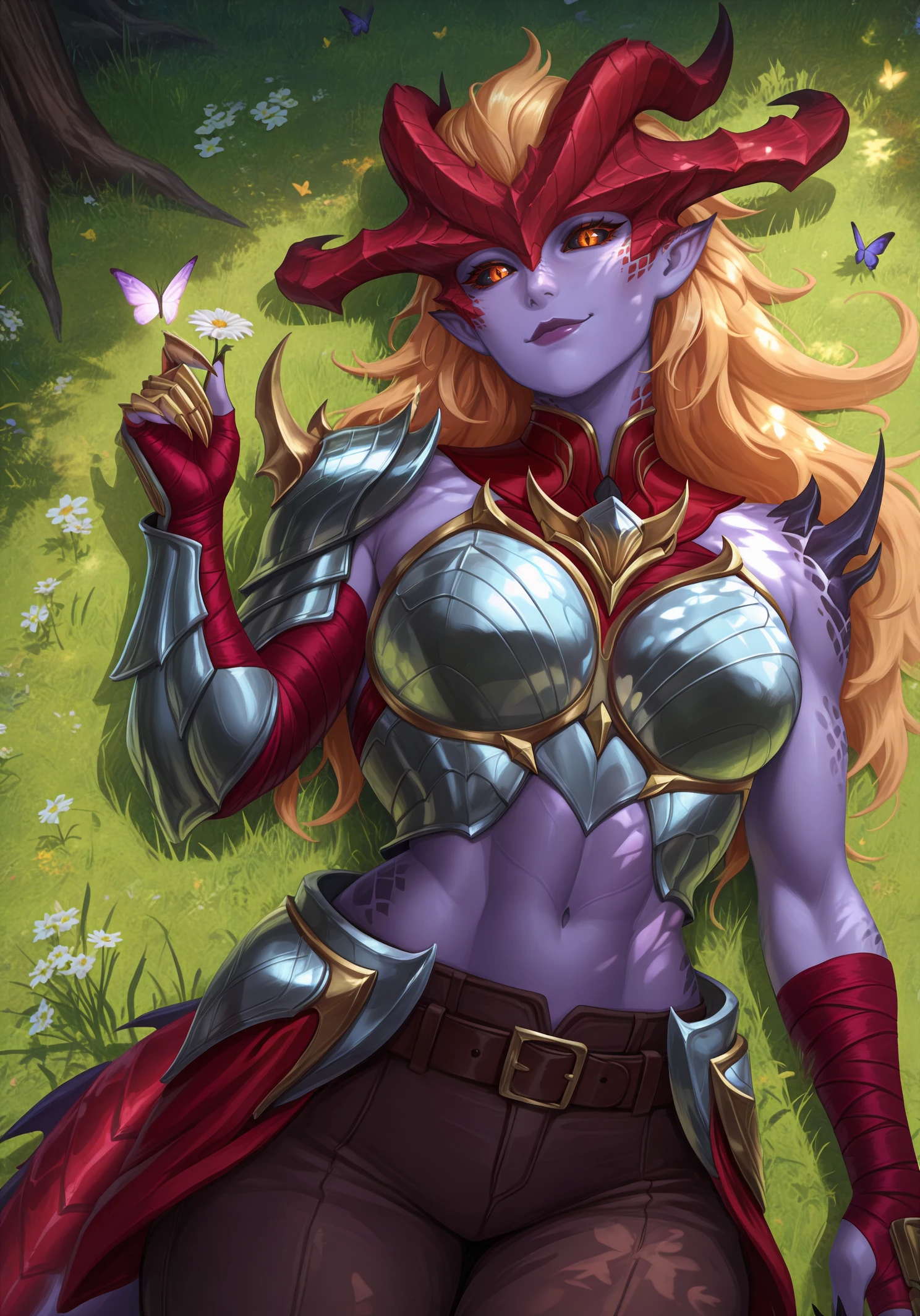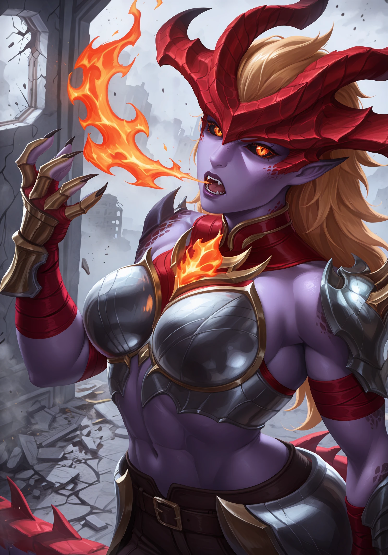 shyvrw, orange eyes, diamond-shaped pupils, colored sclera, black sclera, blonde hair, long hair, hair behind ear, hair slicked back, big hair, colored skin, purple skin, lipstick, purple lips, pointy ears, red horns, demon horns, scales, detached collar, red collar, boobplate, medium breasts, aqua armor, toned female, abs, navel, shoulder spikes, single shoulder pad, gold trim, asymmetrical gloves, bandaged arm, red bandages, uneven sleeves, single gauntlet, fingerless gloves, clawed gauntlets, sharp fingernails, red tail, dragon tail, large tail, spiked tail, brown pants, brown belt, crossed belts, belt buckle, faulds, knee armor, leg armor, toeless legwear, bridal legwear, sharp toenails,
