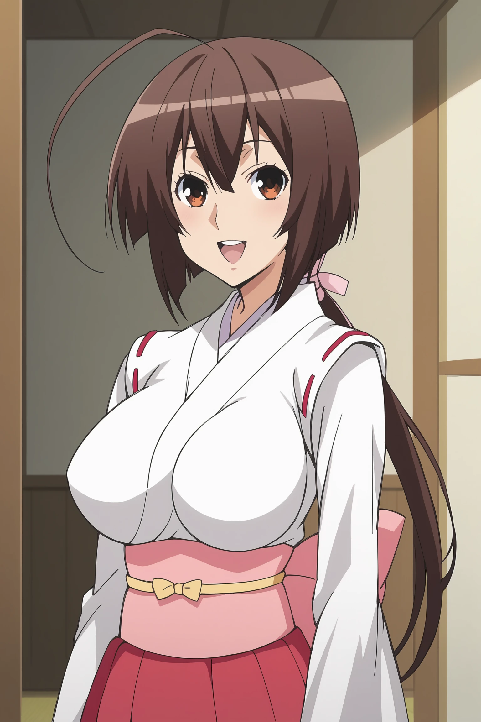Essential keywords you’ll probably always want to include: brown hair, long hair, ponytail, large breasts, ahoge