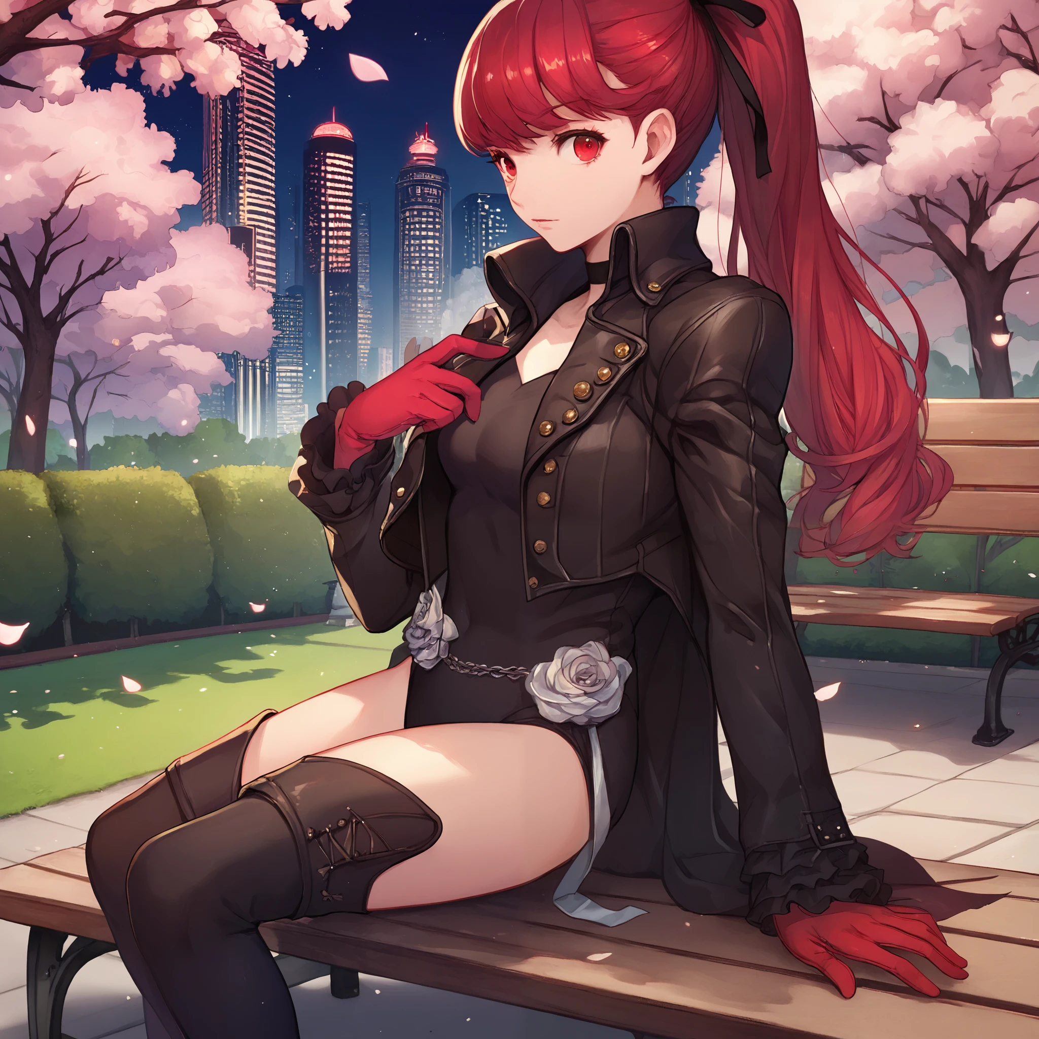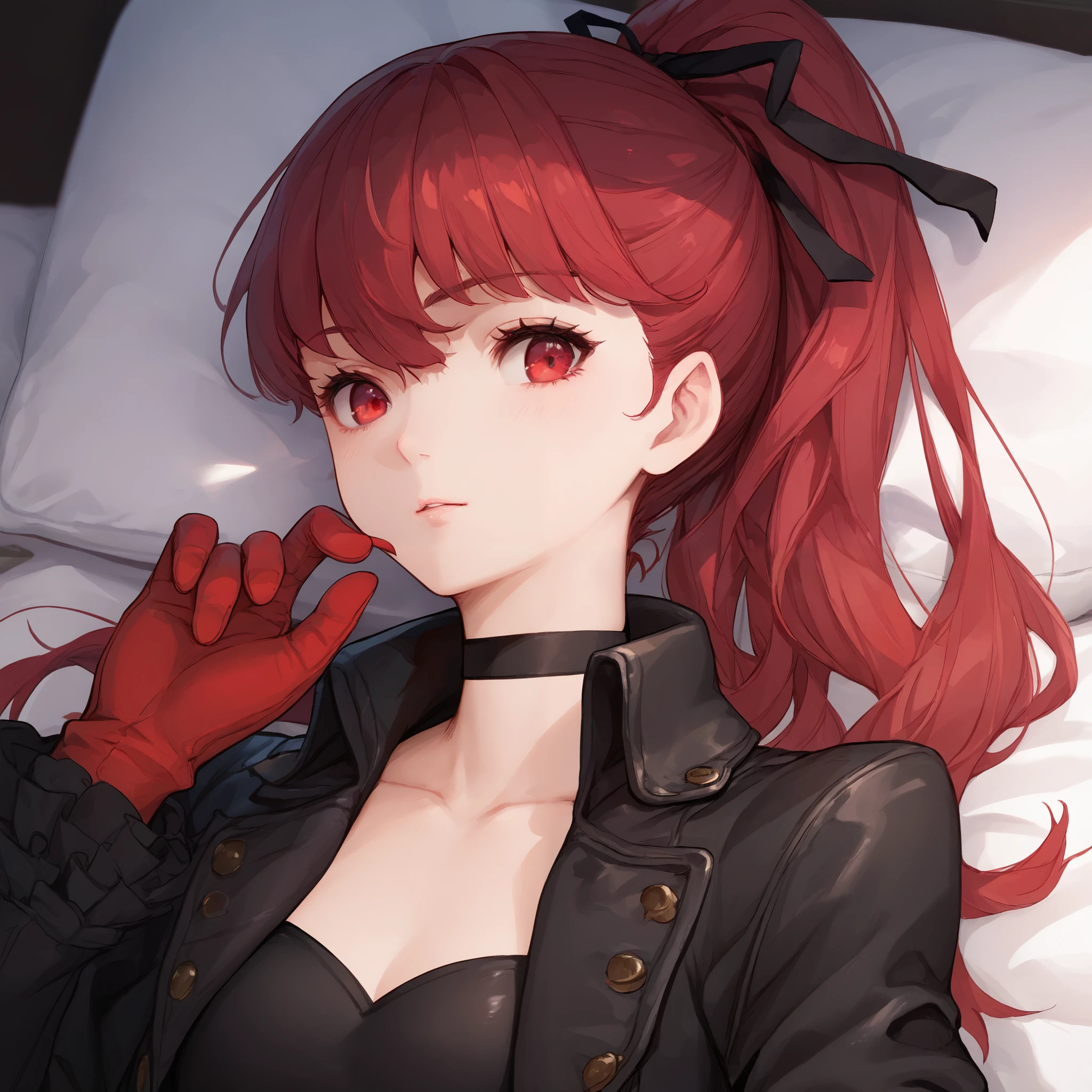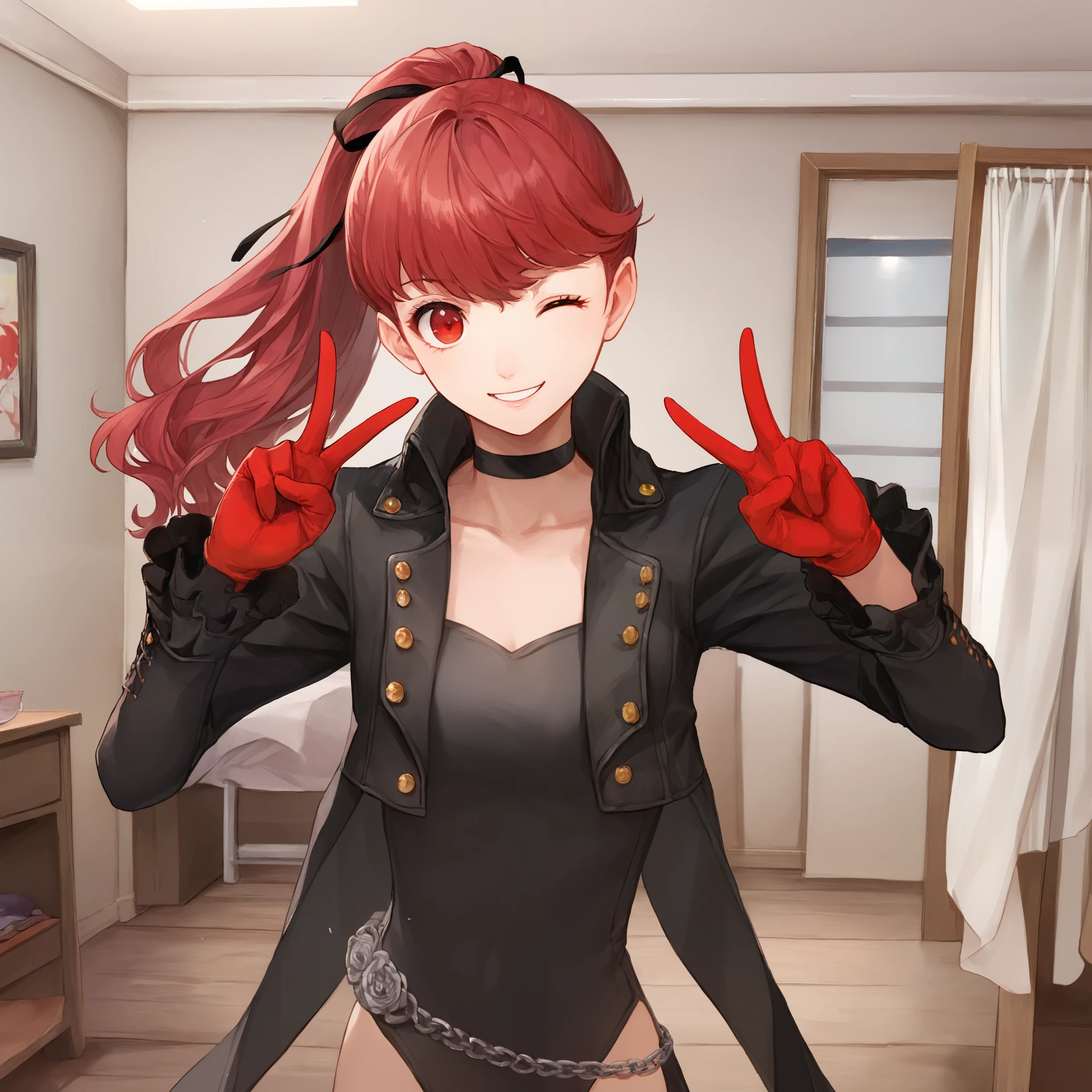 Violet : yoshizawa kasumi, yoshizawa violet, long hair, ponytail, red hair, hair ribbon, red eyes, choker, black jacket, black leotard, red gloves, black thighhighs,Weight : 1