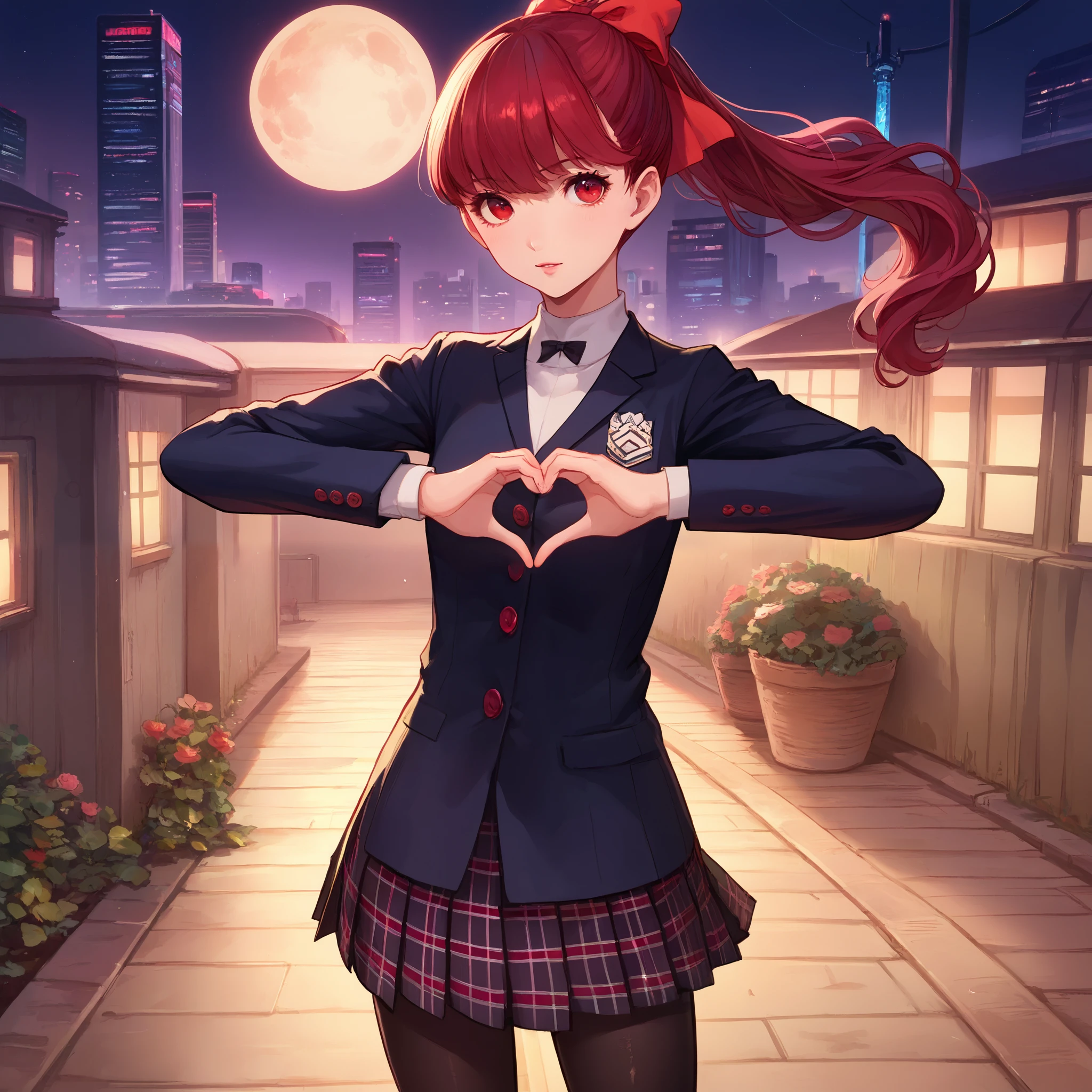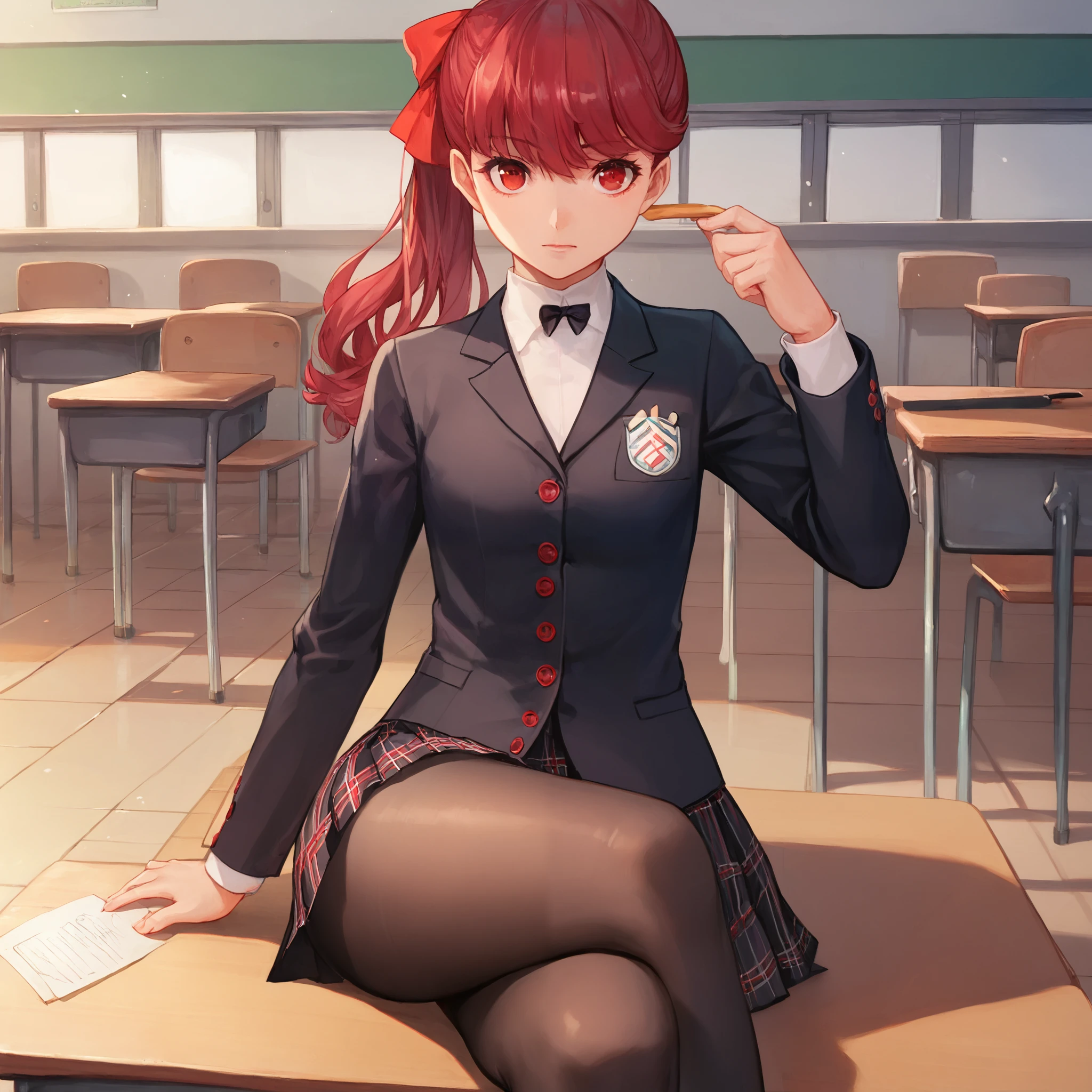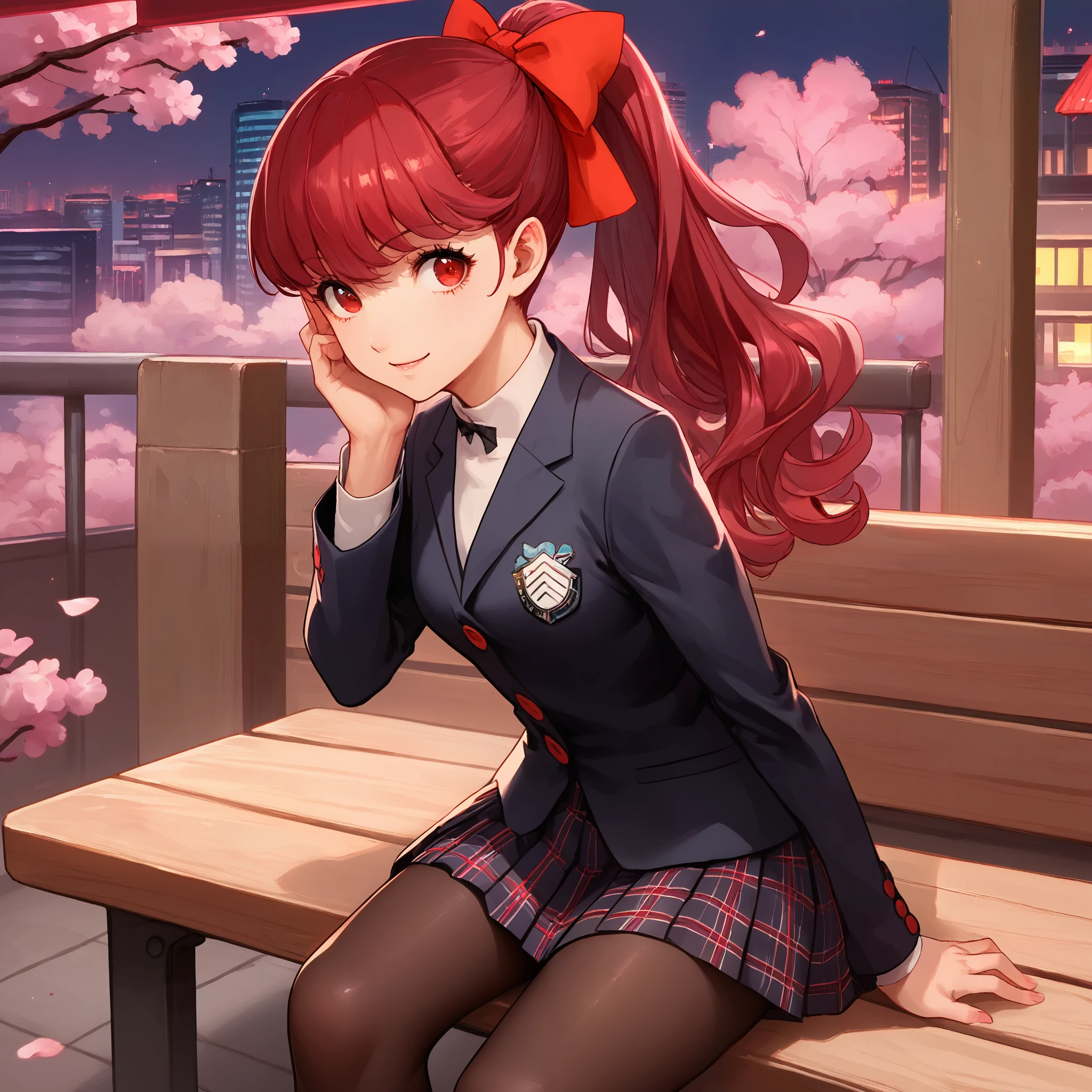 School Unifrom : yoshizawa kasumi, yoshizawa school, long hair, ponytail, red hair, hair bow, red eyes, school uniform, shuujin academy school uniform, black jacket, pleated skirt, pantyhose,Description
