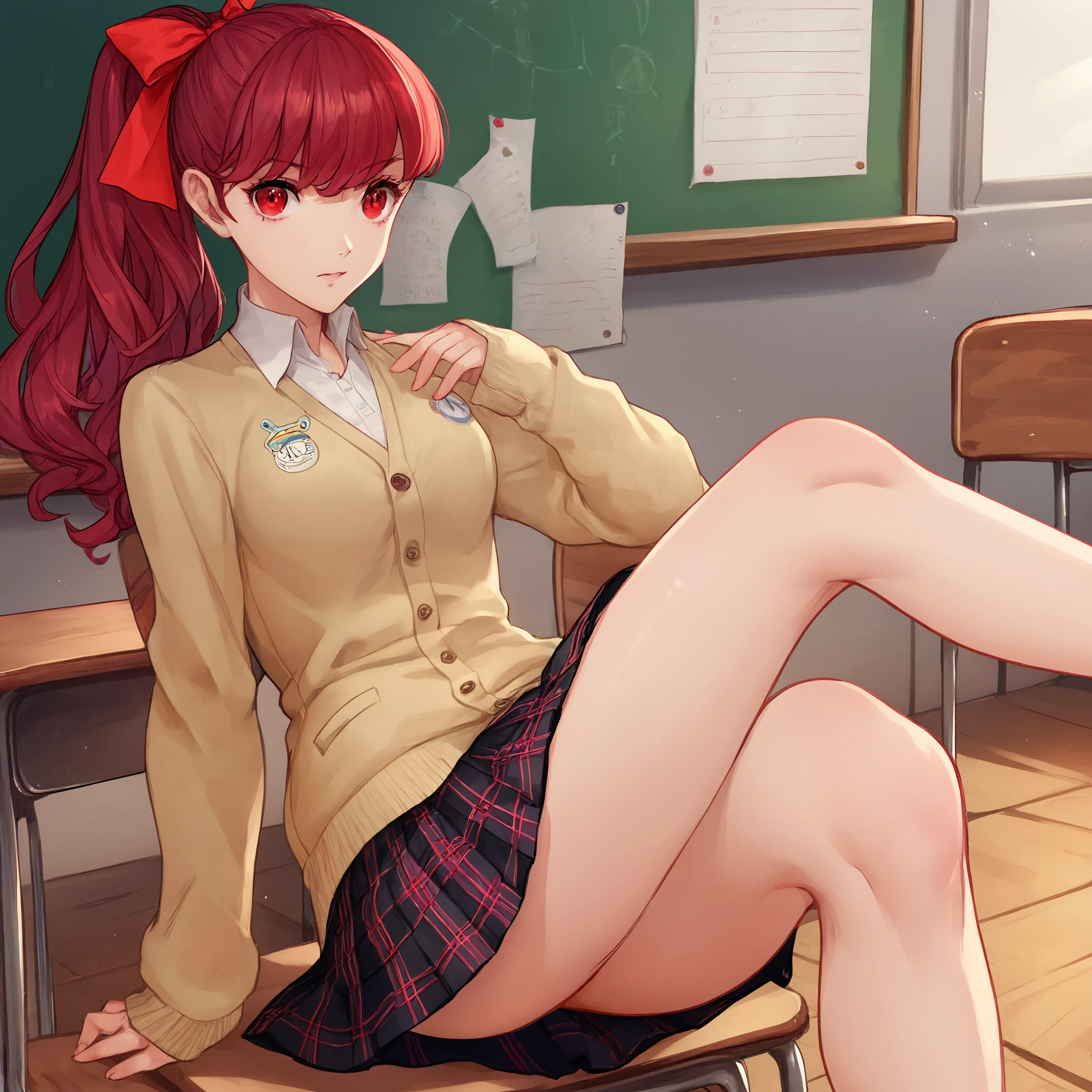 yoshizawa kasumi, summerxl, long hair, ponytail, red hair, hair ribbon, red eyes, white shirt, collared shirt, yellow cardigan, pleated skirt, school uniform, shuujin academy school uniform,