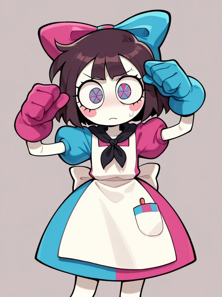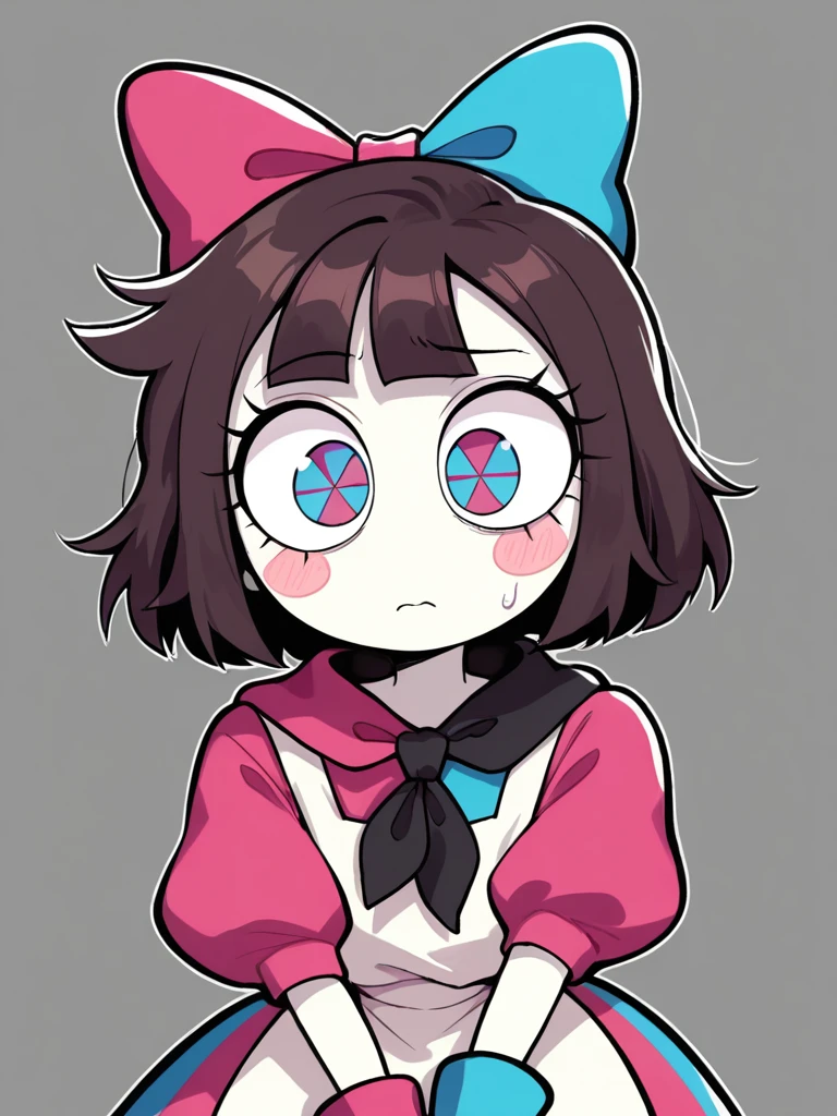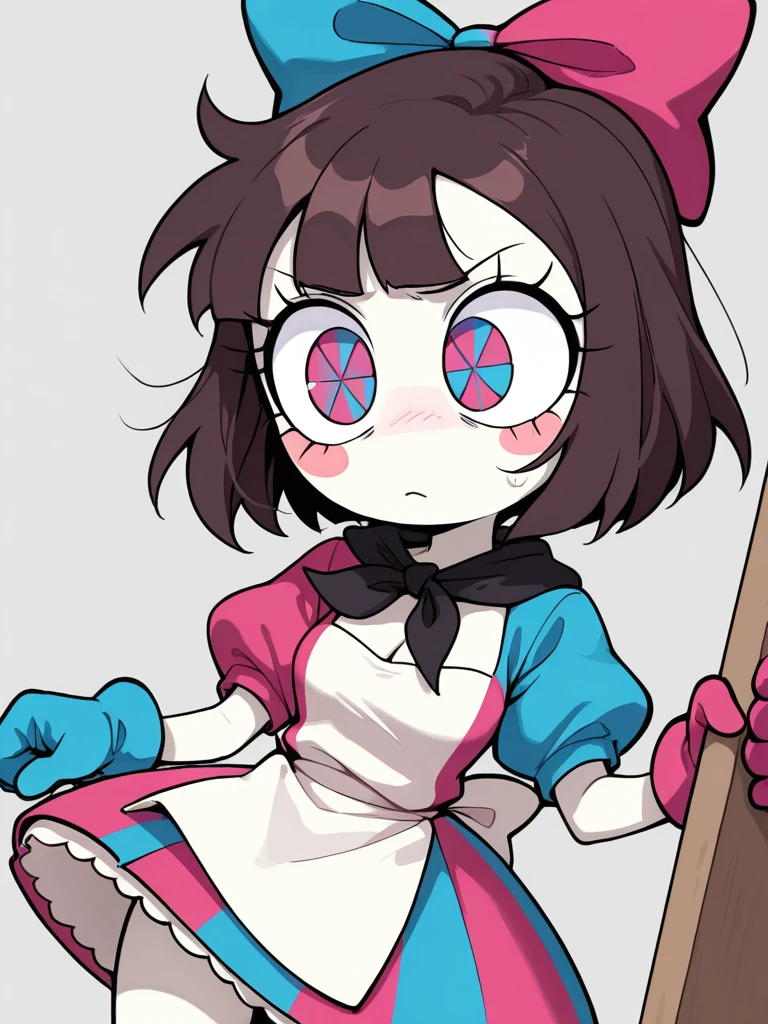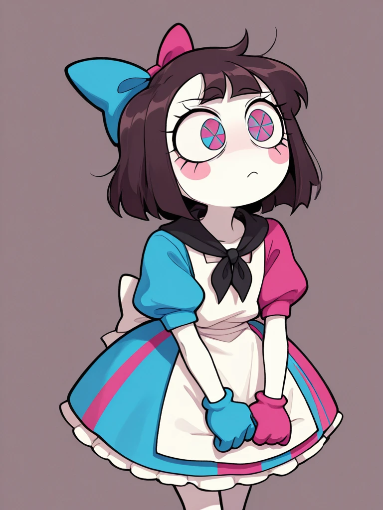 1girl, solo, pomni, symbol-shaped pupils, blue-red pupils, brown hair, blush stickers, white skin, colored skin, multicolored dress, no nose, bow on head, black neckerchief, blue and pink dress, white apron, puffy sleeves, mismatched gloves, multicolored bow,