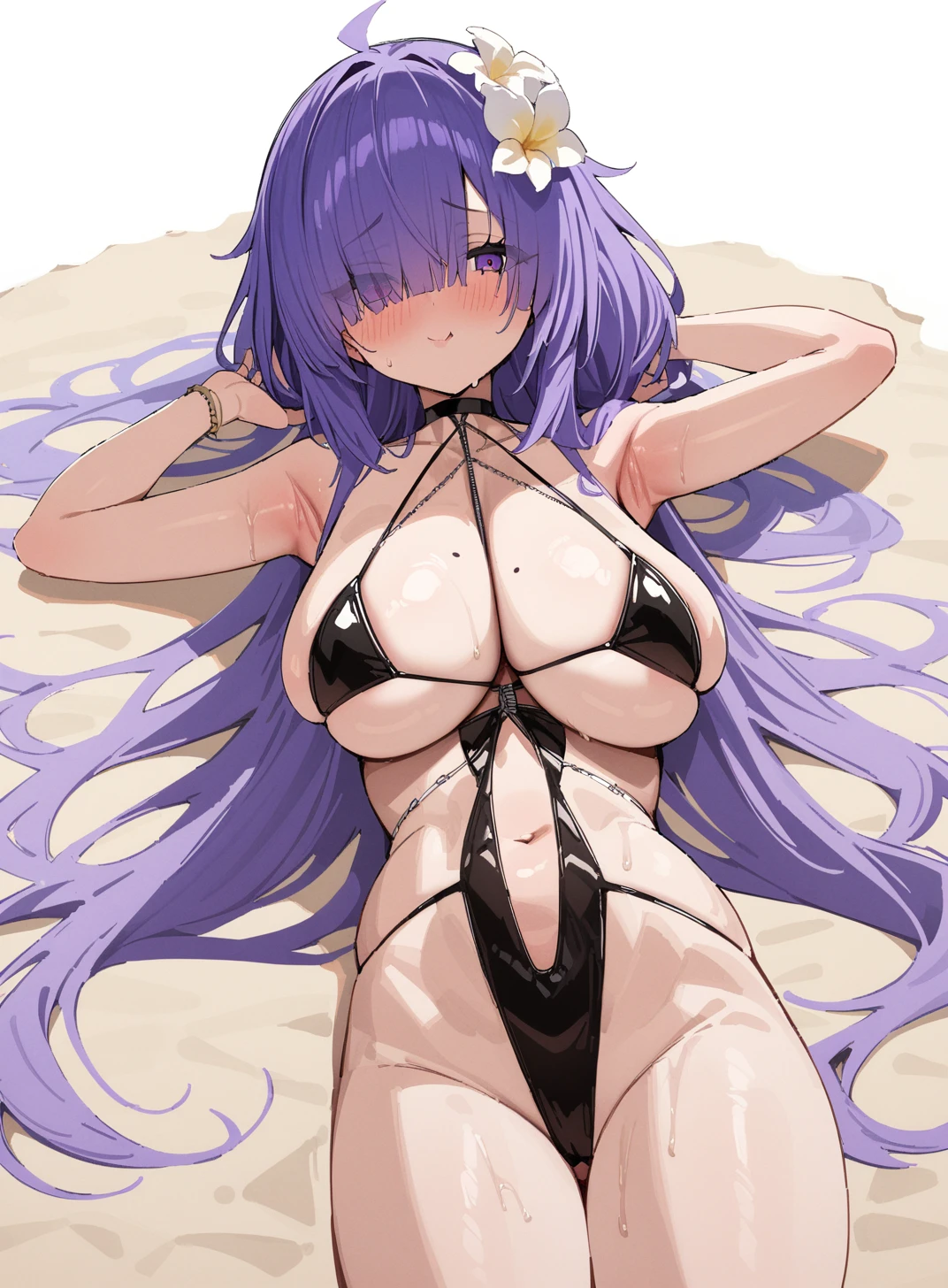 泳装(locker room lechery):mogador_\(azur lane\), hair over one eye, purple hair, eyes visible through hair,mole, long hair,hair flower, bikini,