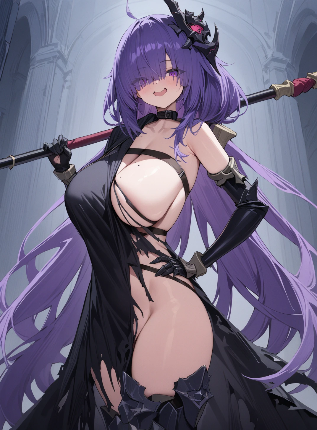 原版(origen):mogador_\(azur lane\), hair over one eye, purple hair, eyes visible through hair,mole, long hair,hair ornament, black dress, breast strap, torn clothes, elbow gloves, greaves,collar,