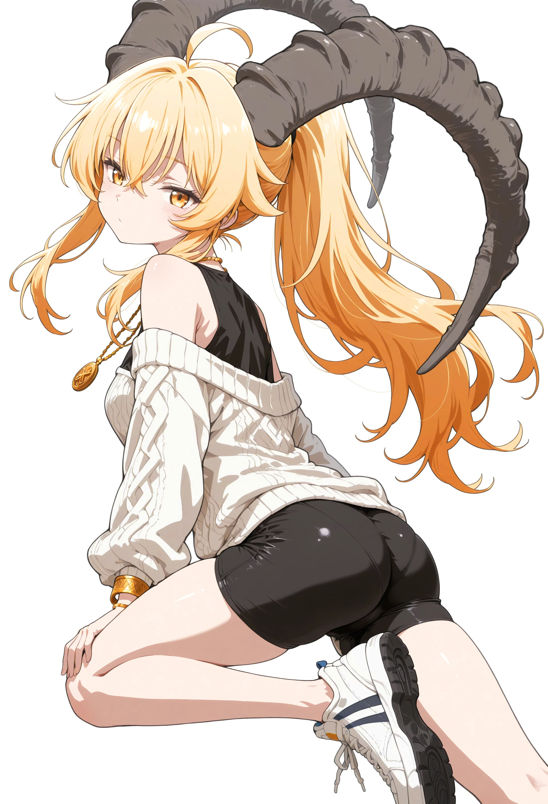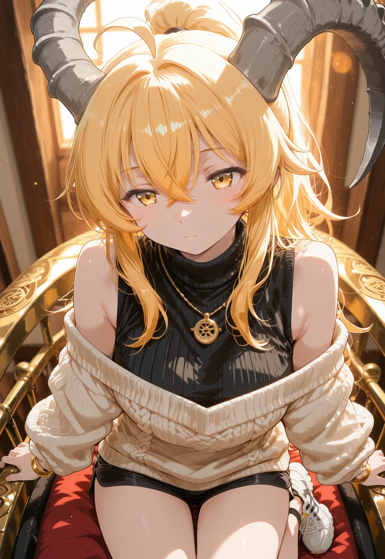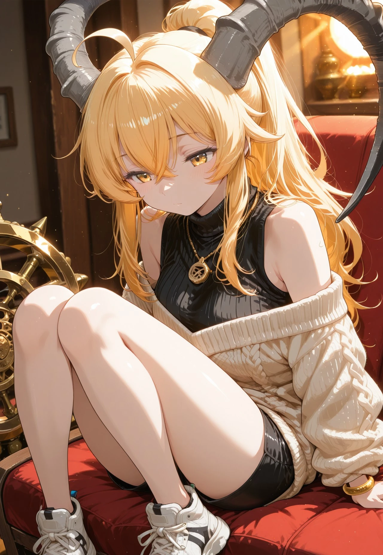 rumina_canon_outfit, gray long ibex horns, golden eyes, blonde hair, long hair, ponytail, crossed bangs, ahoge, golden wheel necklace, off-shoulder oversized sweater, black sleeveless turtleneck, black tight shorts, white sneakers