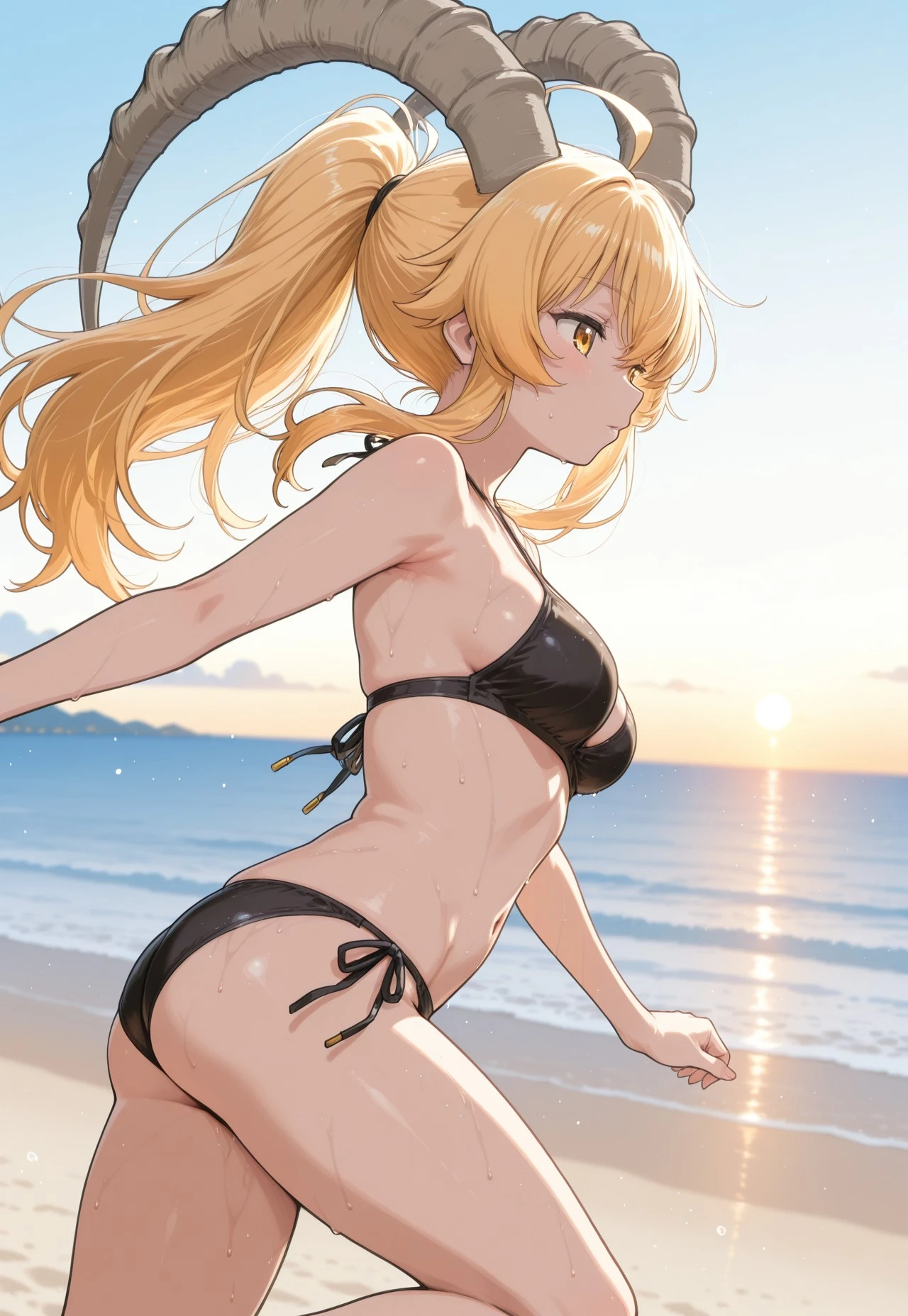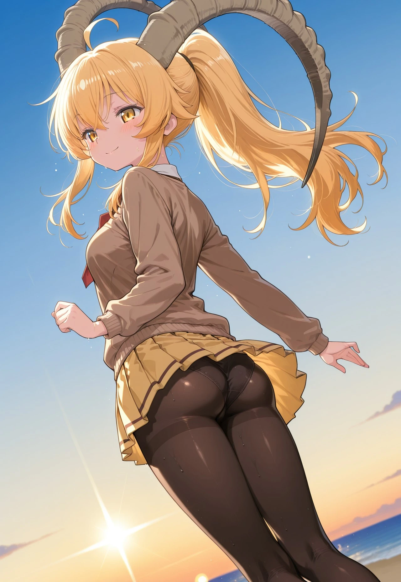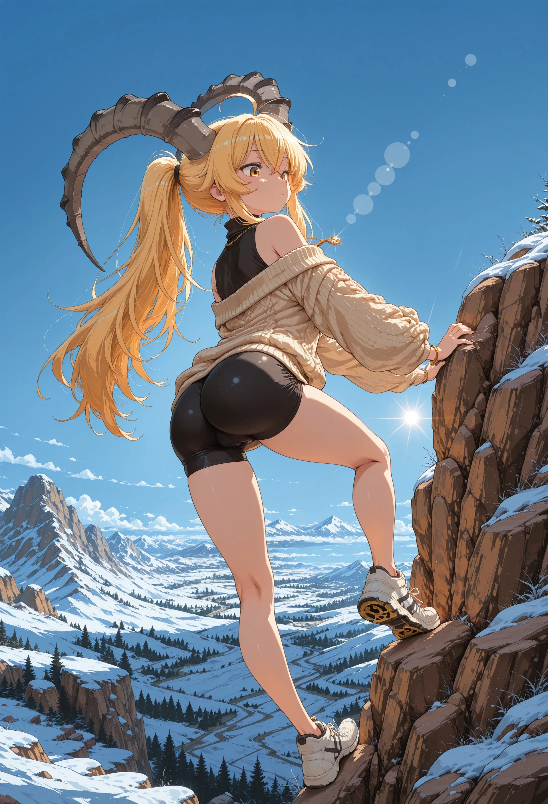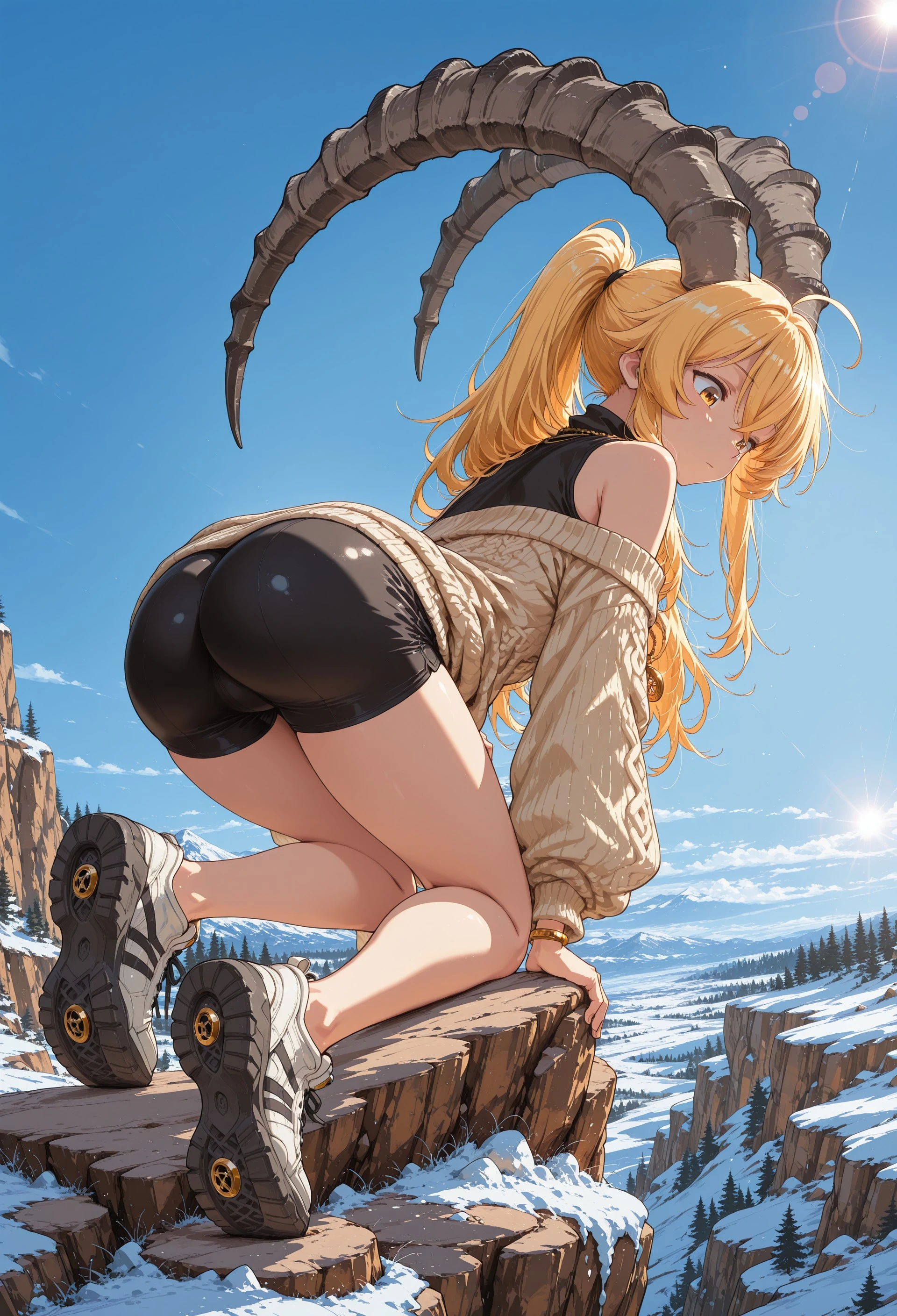 rumina_canon_outfit, gray long ibex horns, golden eyes, blonde hair, long hair, ponytail, crossed bangs, ahoge, golden wheel necklace, off-shoulder oversized sweater, black sleeveless turtleneck, black tight shorts, white sneakers