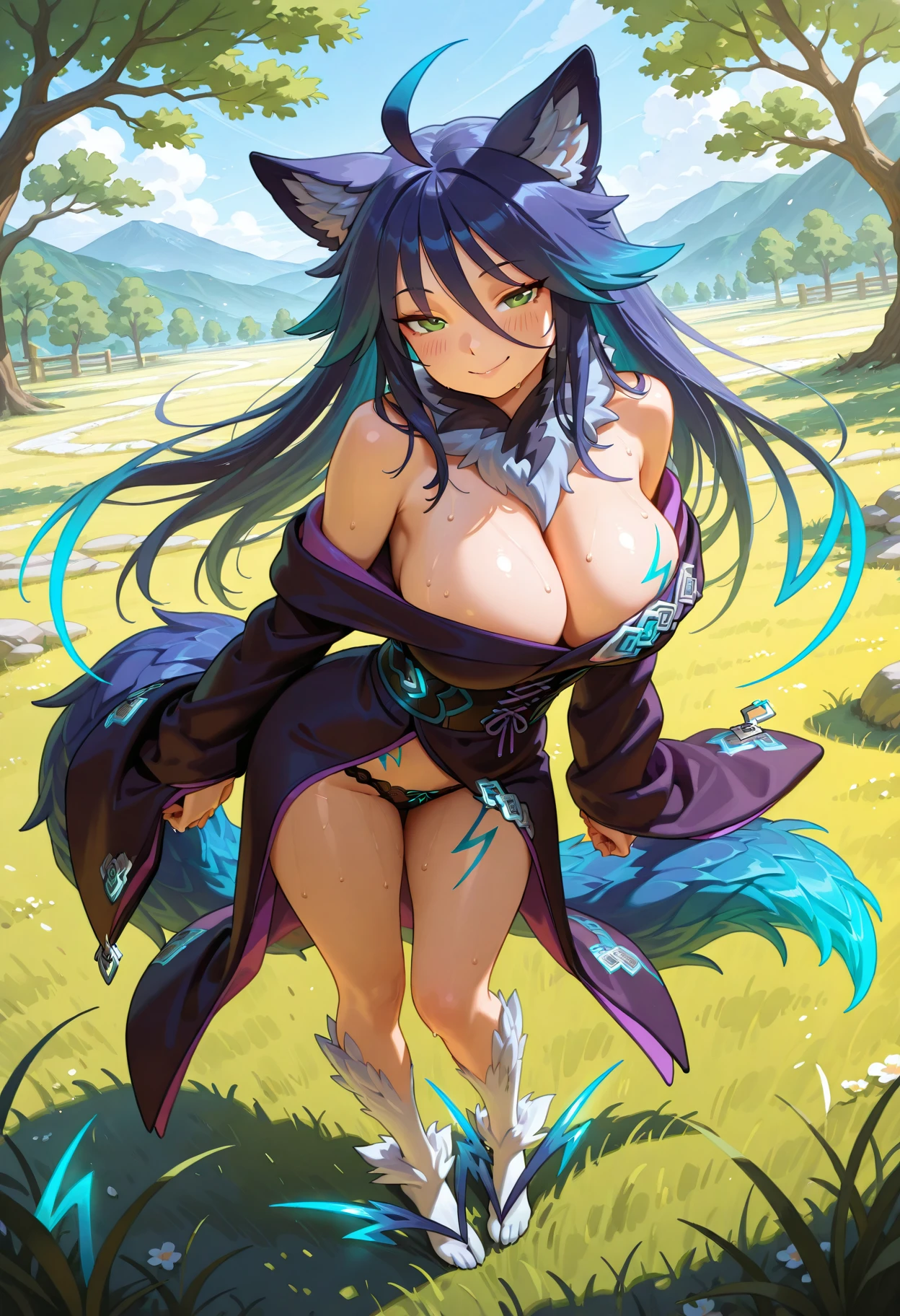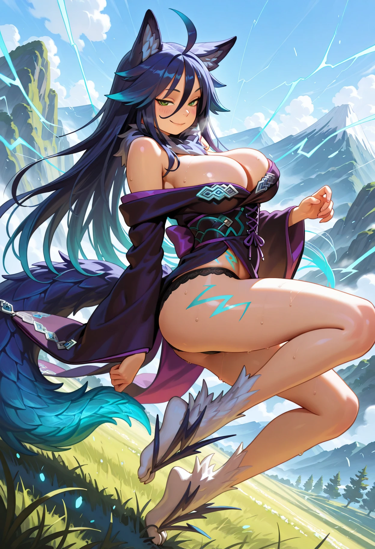 long hair, gradient hair, glowing hair, dark blue hair, aqua hair tips, green eyes, ahoge, large breasts, lightning tattoo🏮 Traditional Attire: