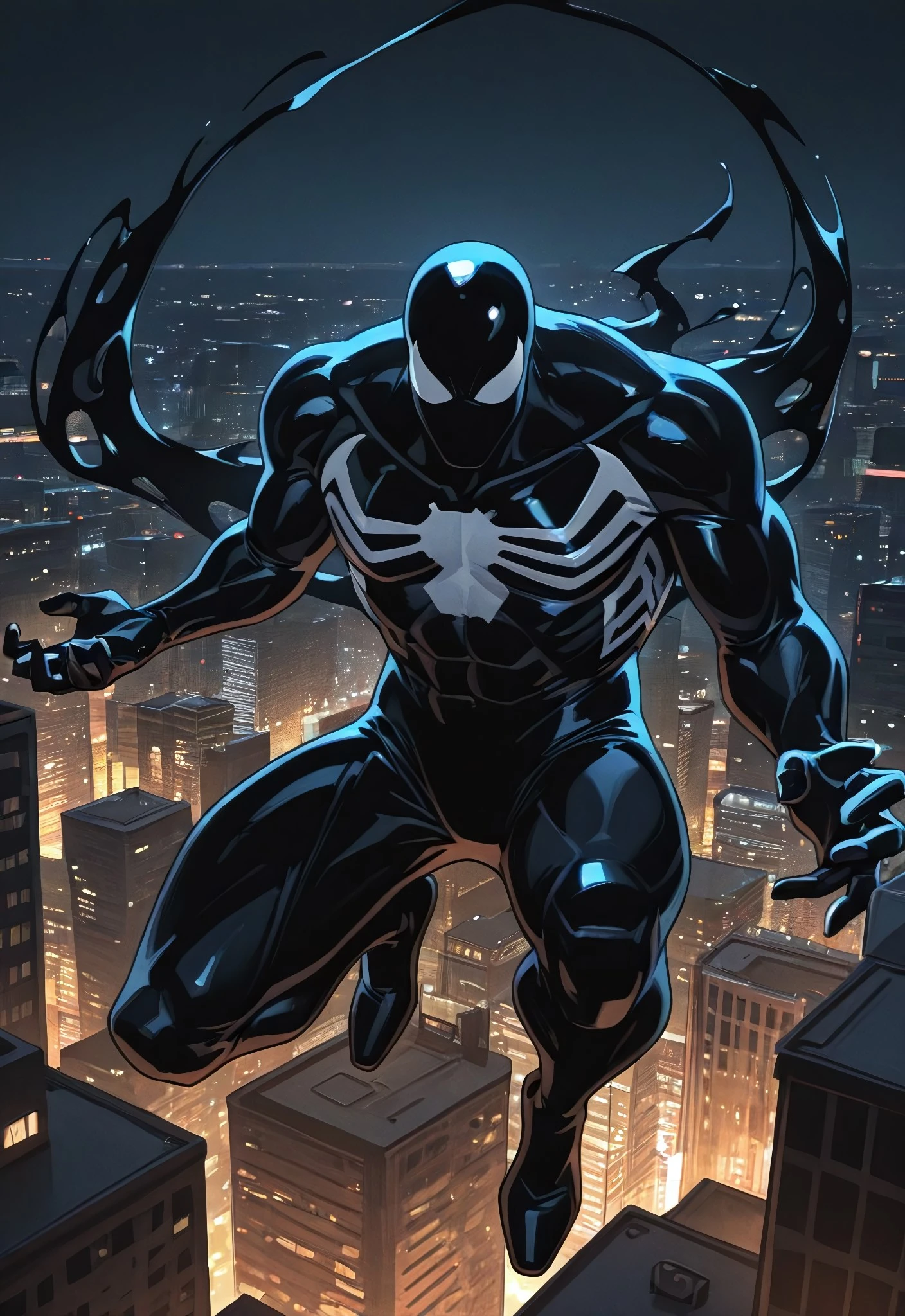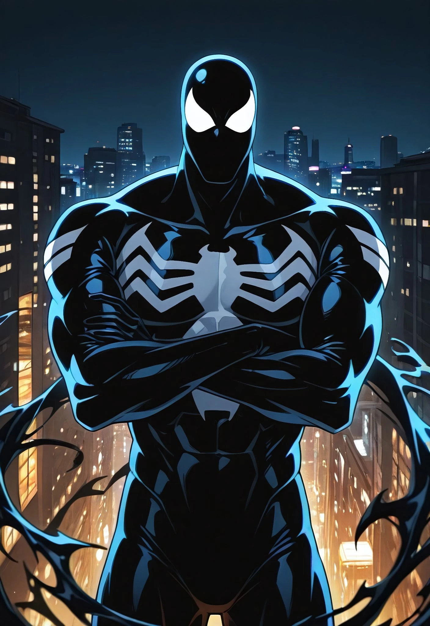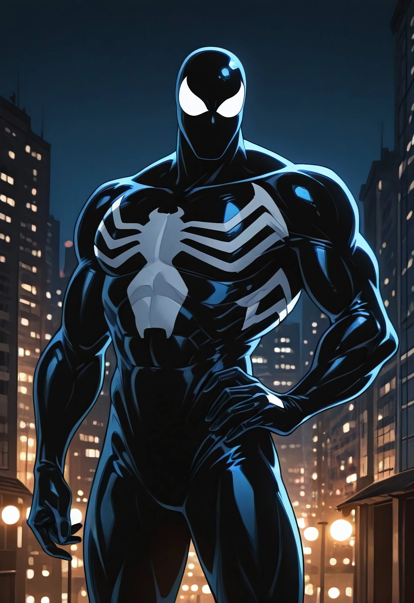 spidermanTASsymbiote_1994(cartoon)IL, symbiote, spider print, black_, , mask, muscular, 1boy, solo,