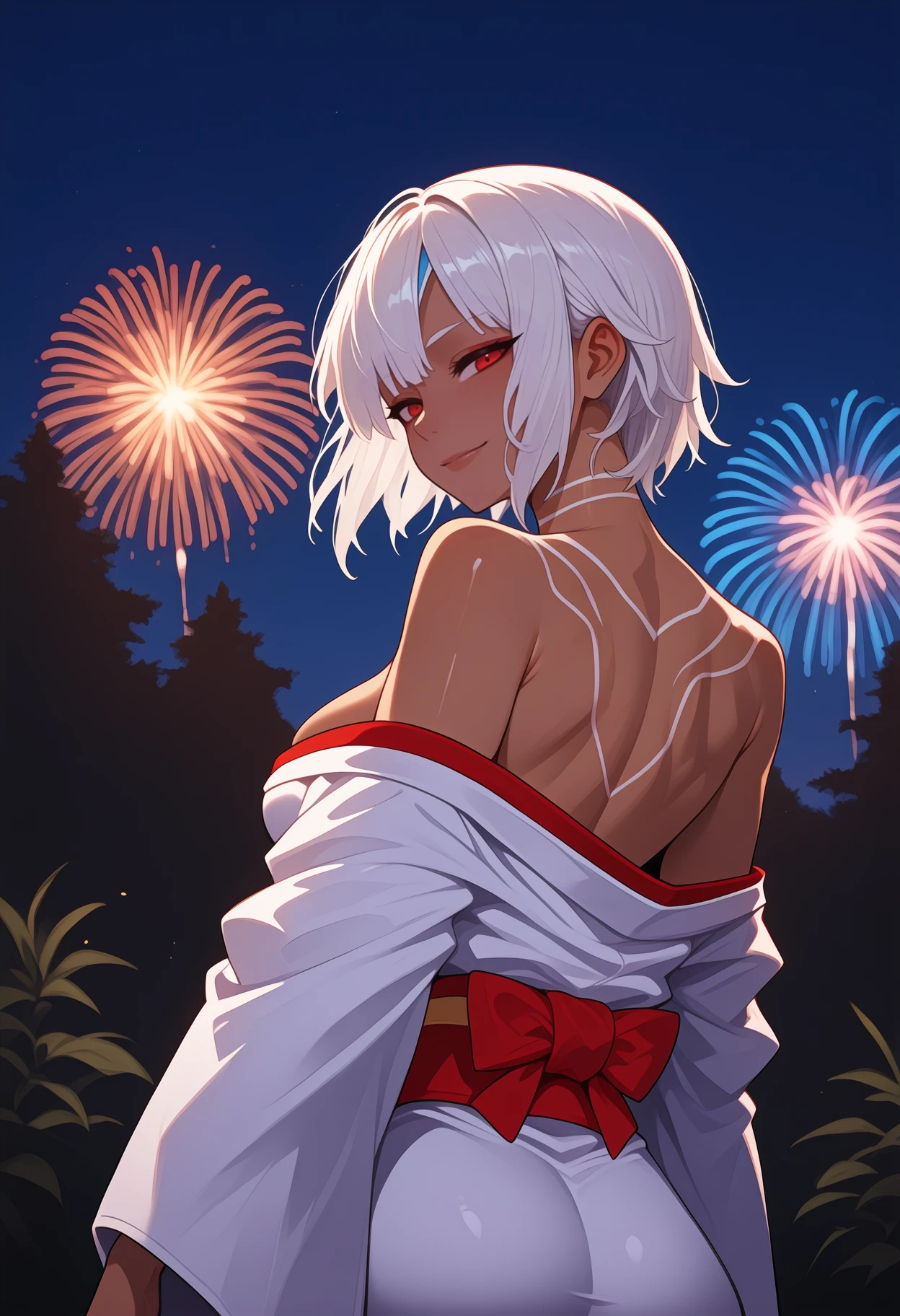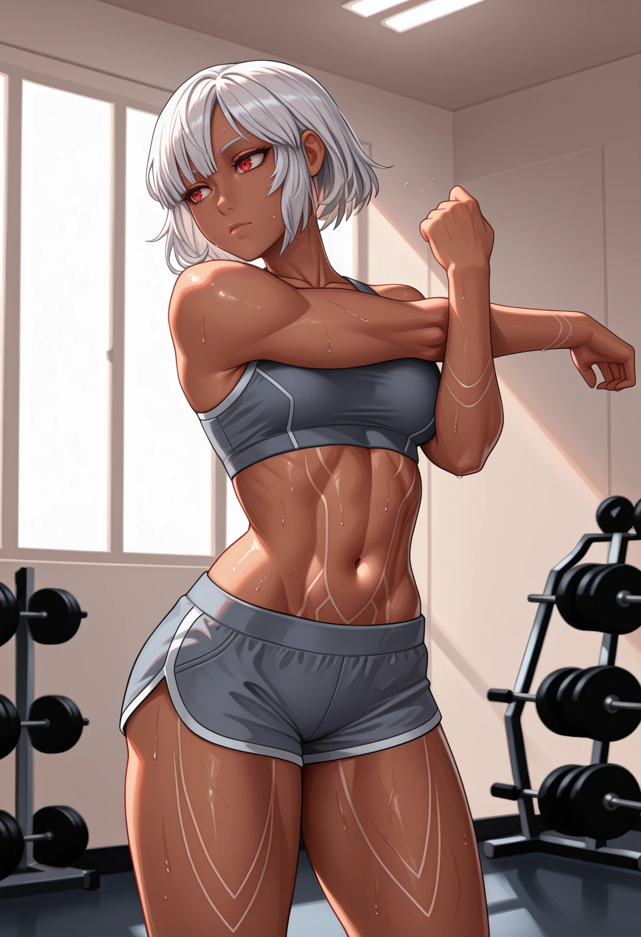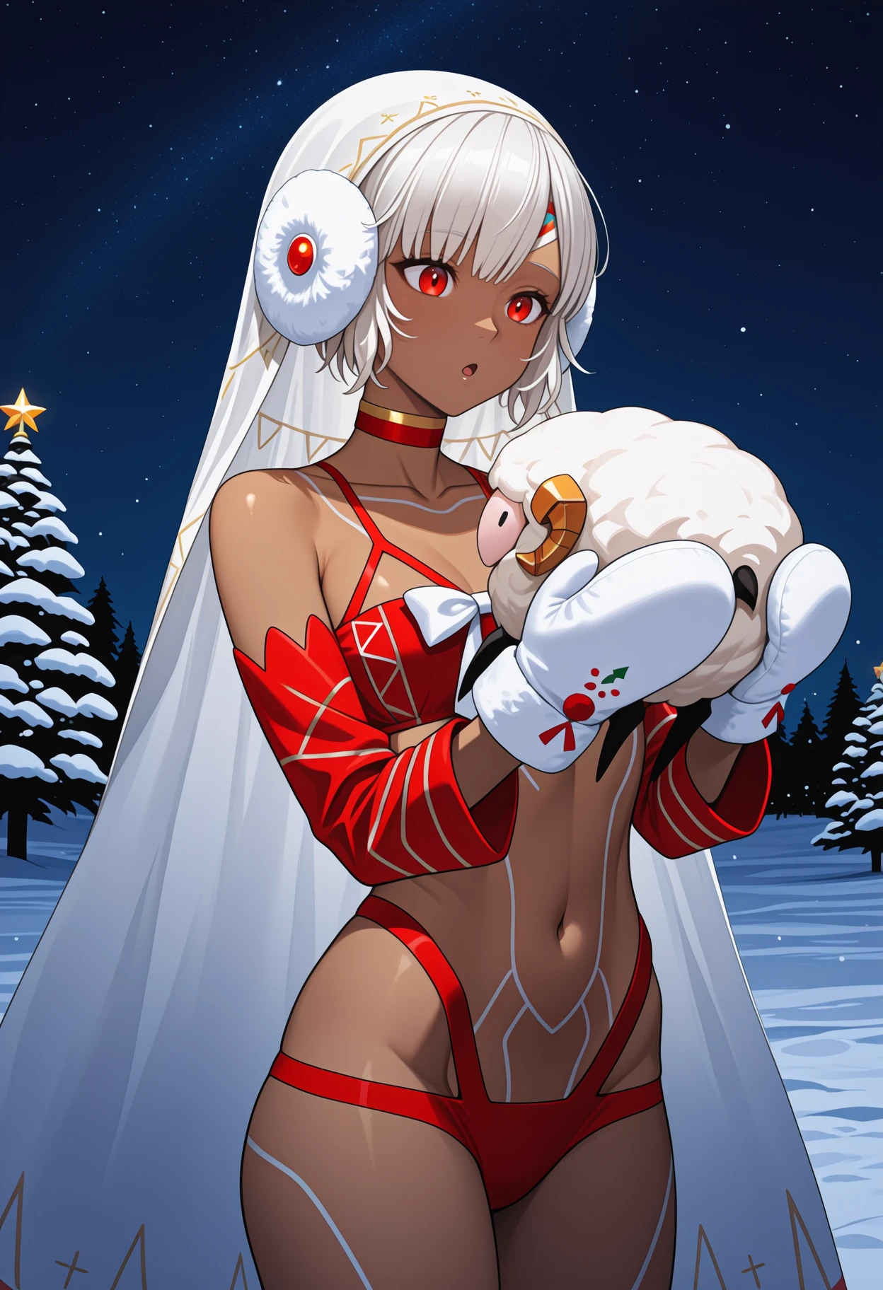 Archer: 4lt3raarcher, dark-skinned female, full-body tattoo, short hair, white hair, veil, earmuffs, red eyes, red bra, white bow, red sleeves, detached sleeves, white mittens, red panties, multi-strapped panties, red choker, bare shoulders, collarbone, stomach, navel