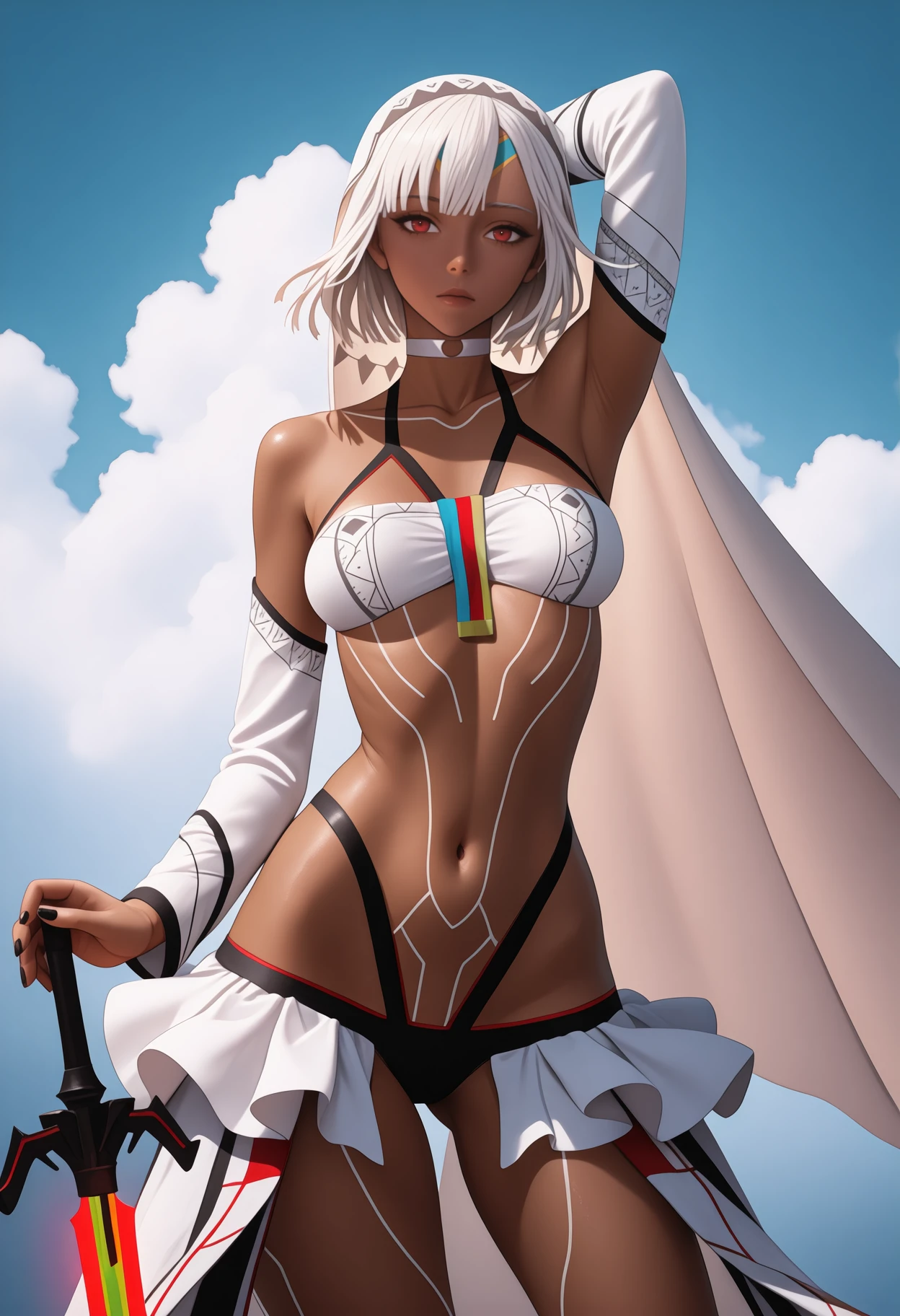Second Ascension: 4lt3ra2nd, dark-skinned female, full-body tattoo, short hair, white hair, veil, red eyes, revealing clothes, white sleeves, detached sleeves, white skirt, showgirl skirt, black panties, multi-strapped panties, white choker, black nails, bare shoulders, collarbone, stomach, navel