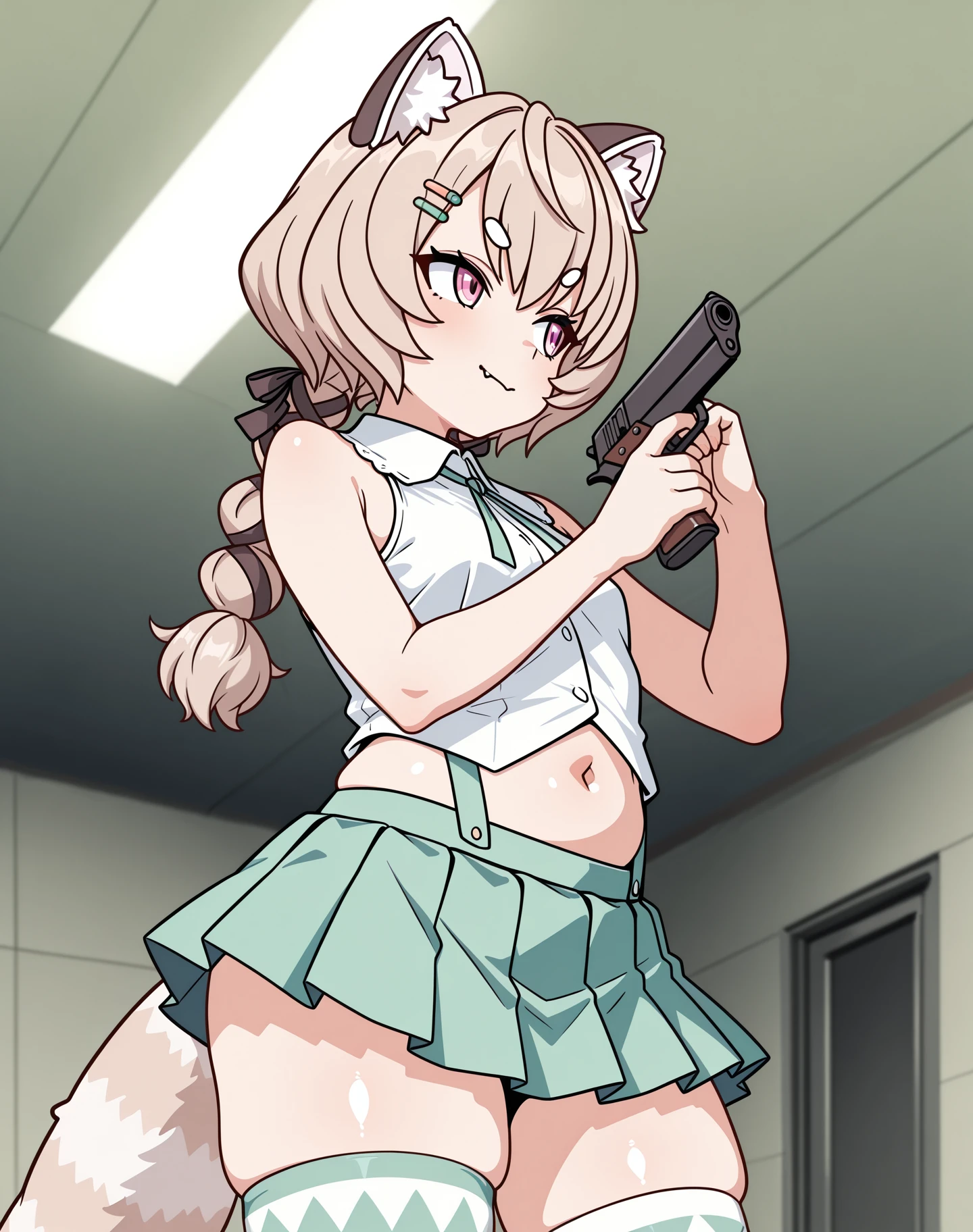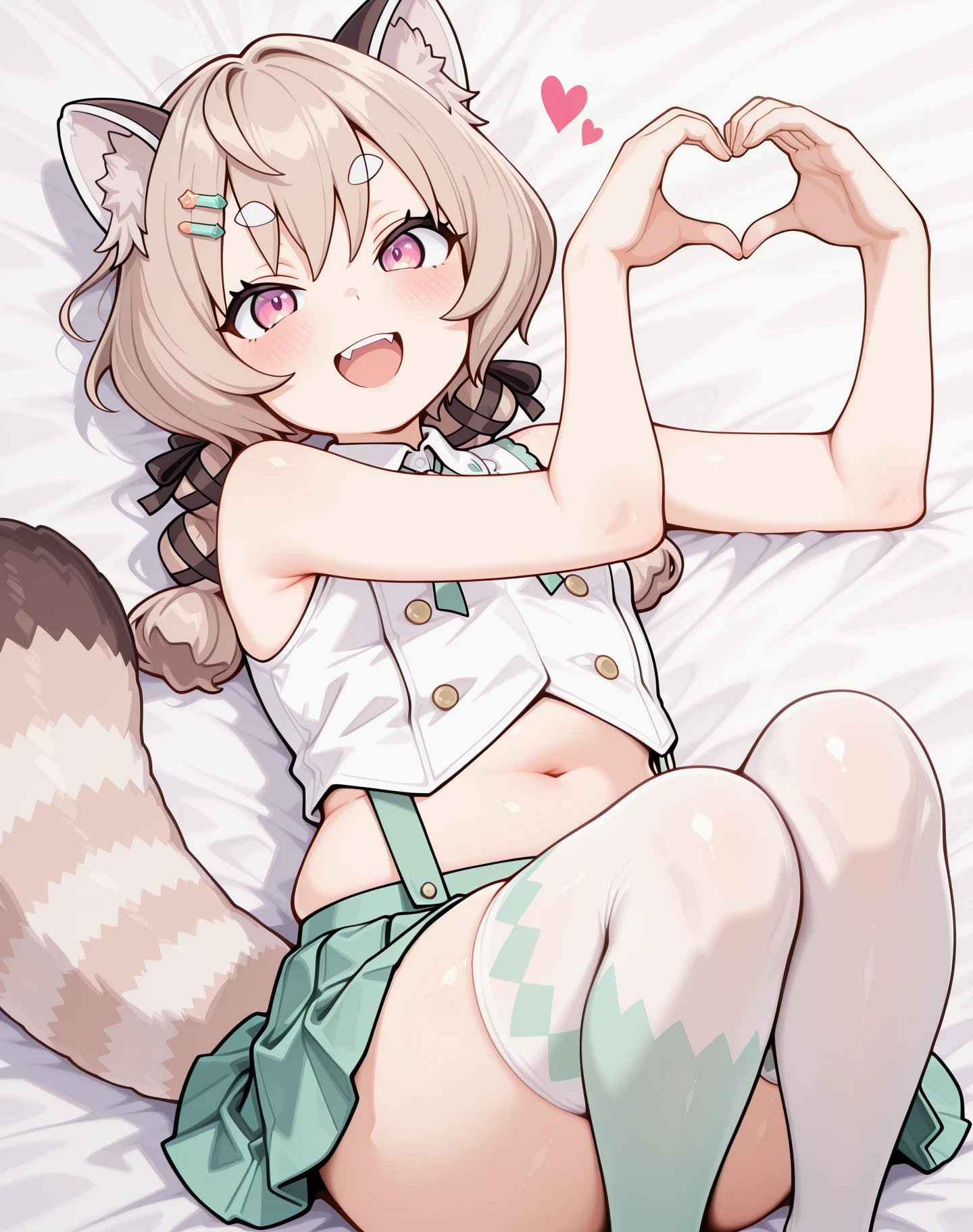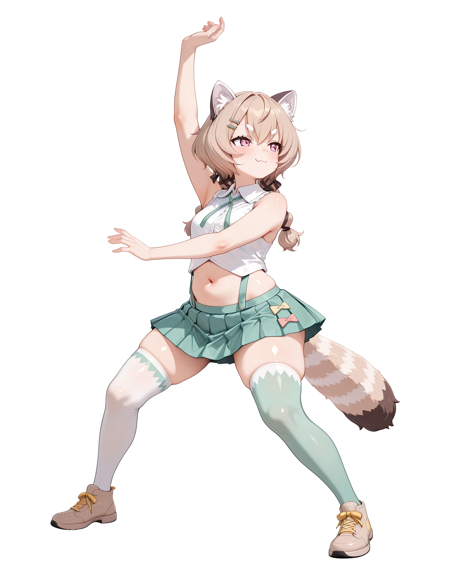 BasePank, light brown hair, animal ears, braids, pink eyes, low twintails, bangs, red panda ears, thick raccoon tail, komachi panko, white sleeveless collared shirt, green ribbon, bows, midriff, navel, suspender skirt, green pleated miniskirt, zettai ryouiki, mismatched legwear, green thighhigh, white thighhigh, panko's brown shoes,