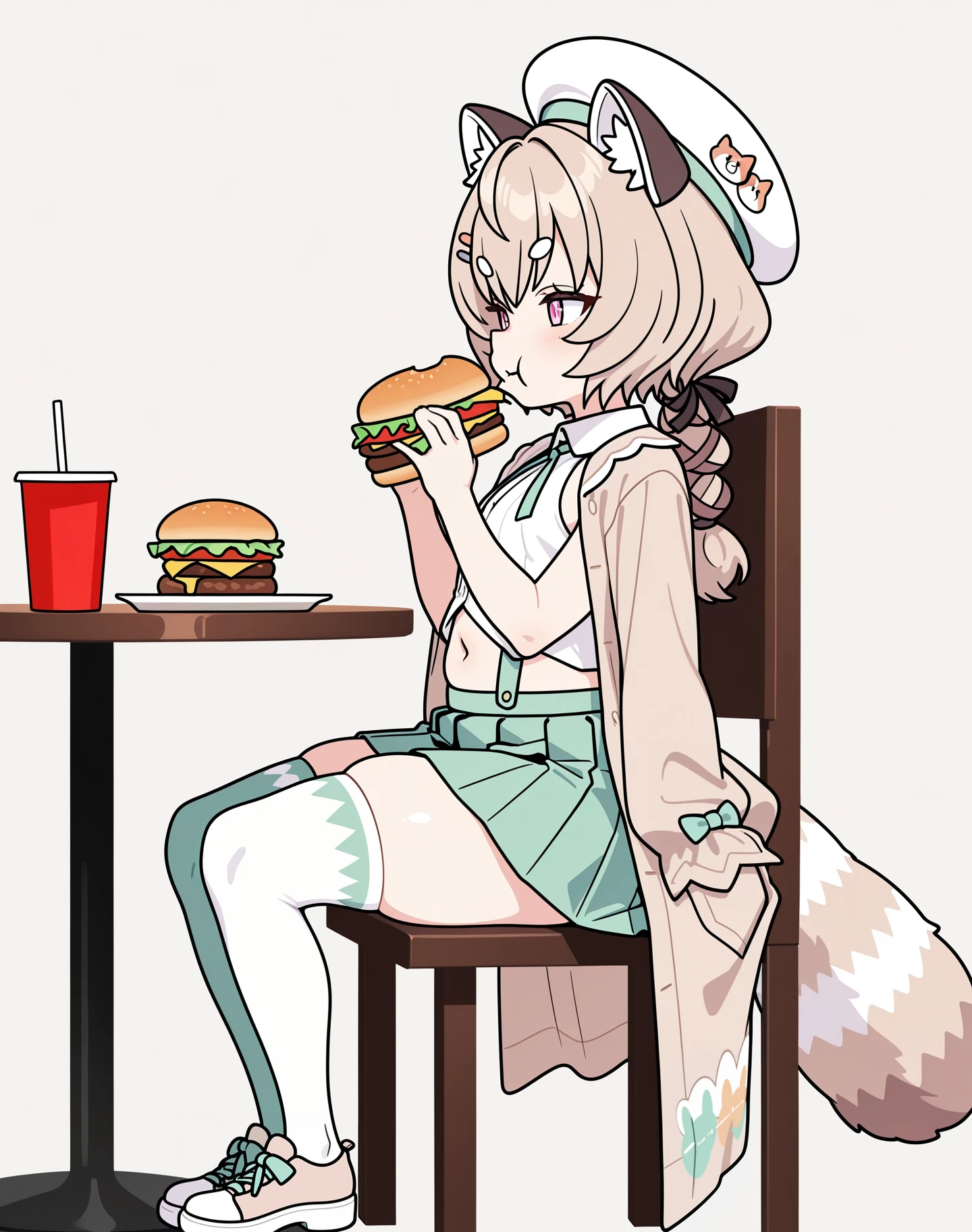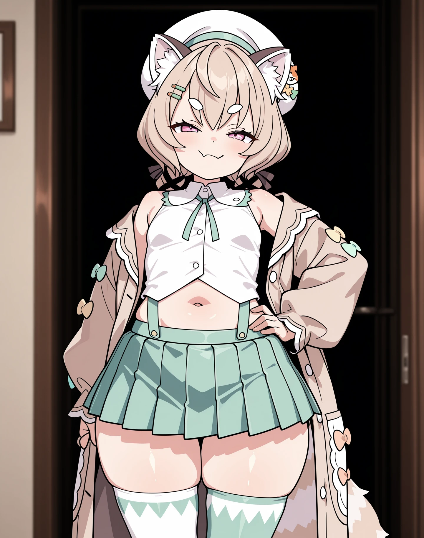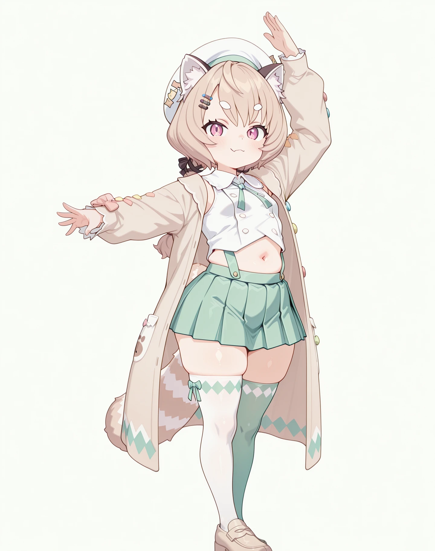 BasePank, light brown hair, animal ears, braids, pink eyes, low twintails, bangs, red panda ears, thick raccoon tail, komachi panko, white sleeveless collared shirt, green ribbon, bows, midriff, navel, suspender skirt, green pleated miniskirt, zettai ryouiki, mismatched legwear, green thighhigh, white thighhigh, panko's brown shoes,