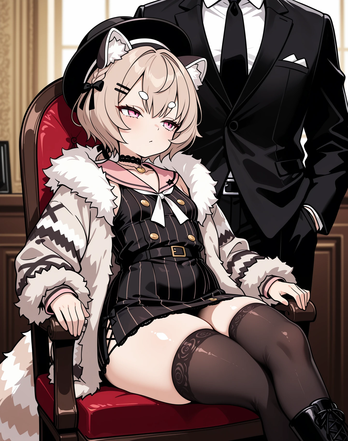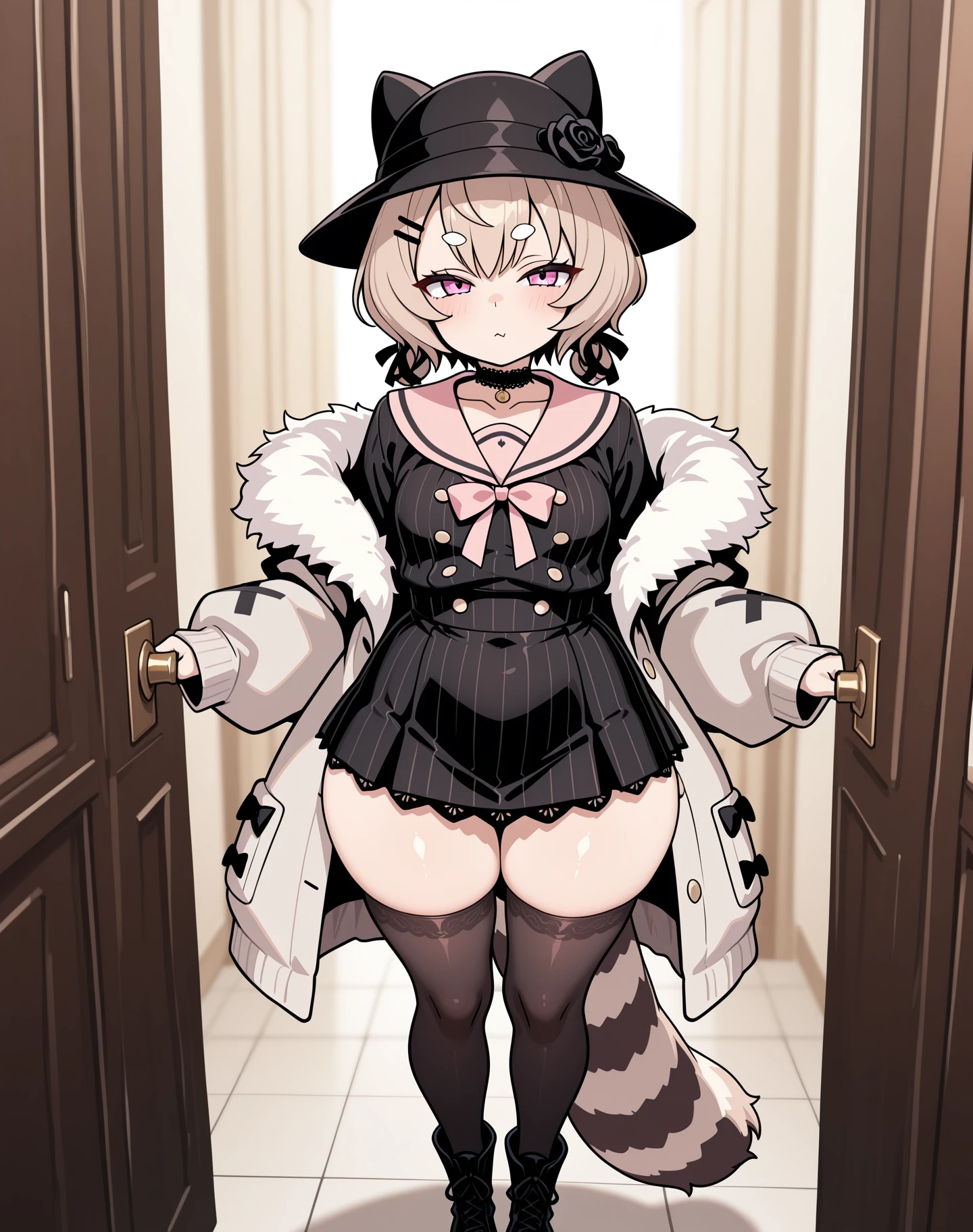 Mafiank, light brown hair, animal ears, pink eyes, short hair, bangs, thick raccoon tail, hair ribbon, silk choker, collarbone, open coat, fur trim coat, striped fur coat, pink sailor collar, black dress, lace trim dress, lace black thighhighs, pink ribbon boots, black boots, black bowler hat,