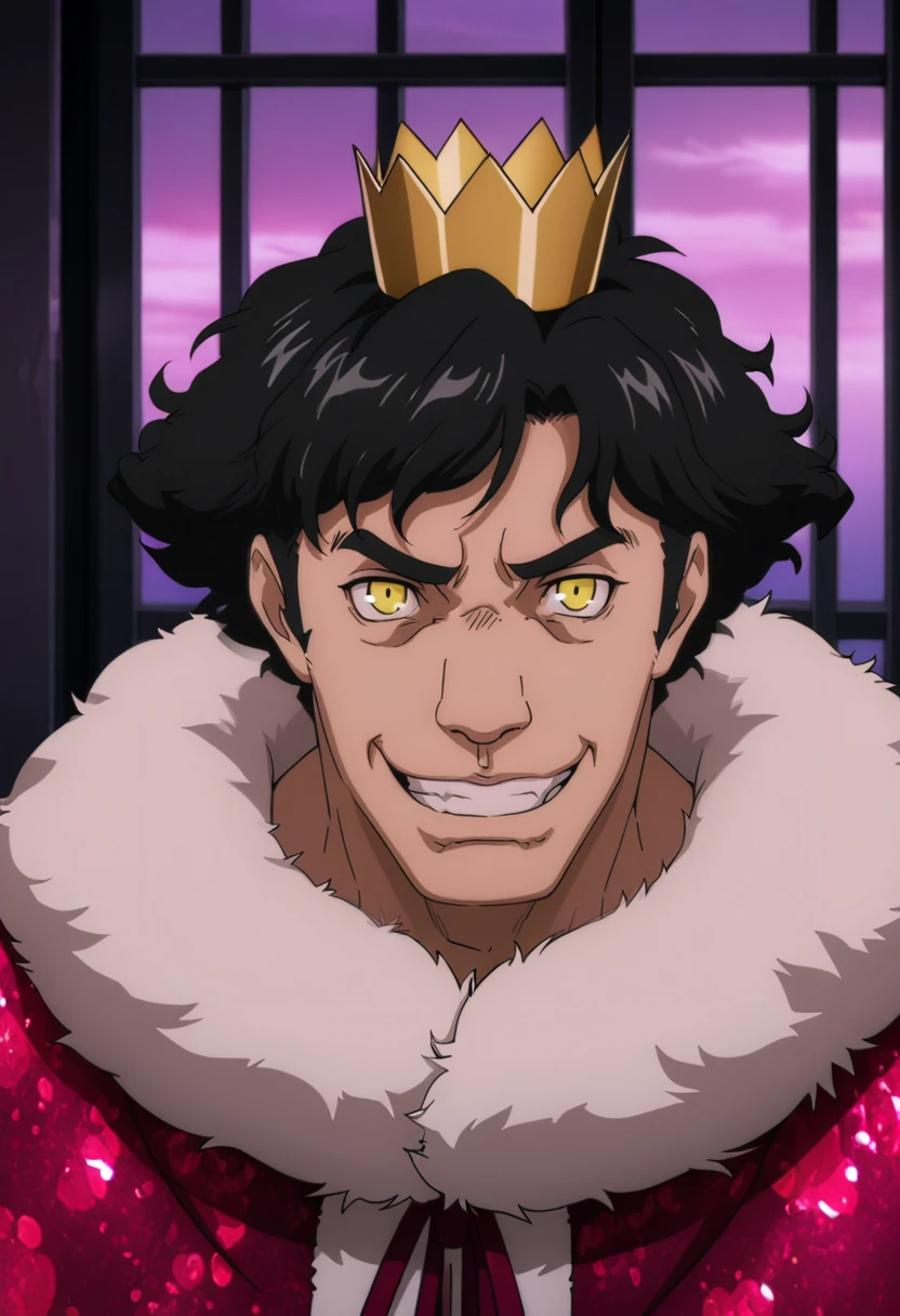 SuguruKamoshida, ShadowKamoshida, 1boy, solo, black_hair, wavy_hair, yellow_eyes, fur-trimmed_cape, red_cape, gold_crown, pink_swim_briefs, red_loafers, anime_coloring, anime_screenshot, looking_at_viewer, full_body