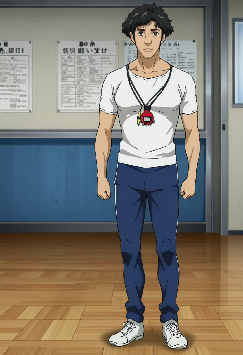 SuguruKamoshida, 1boy, solo, black_hair, wavy_hair, brown_eyes, white_shirt, black_lanyard, yellow_whistle, red_stopwatch, around_neck, blue_track_pants, white_sneakers, anime_coloring, anime_screenshot, full_body
