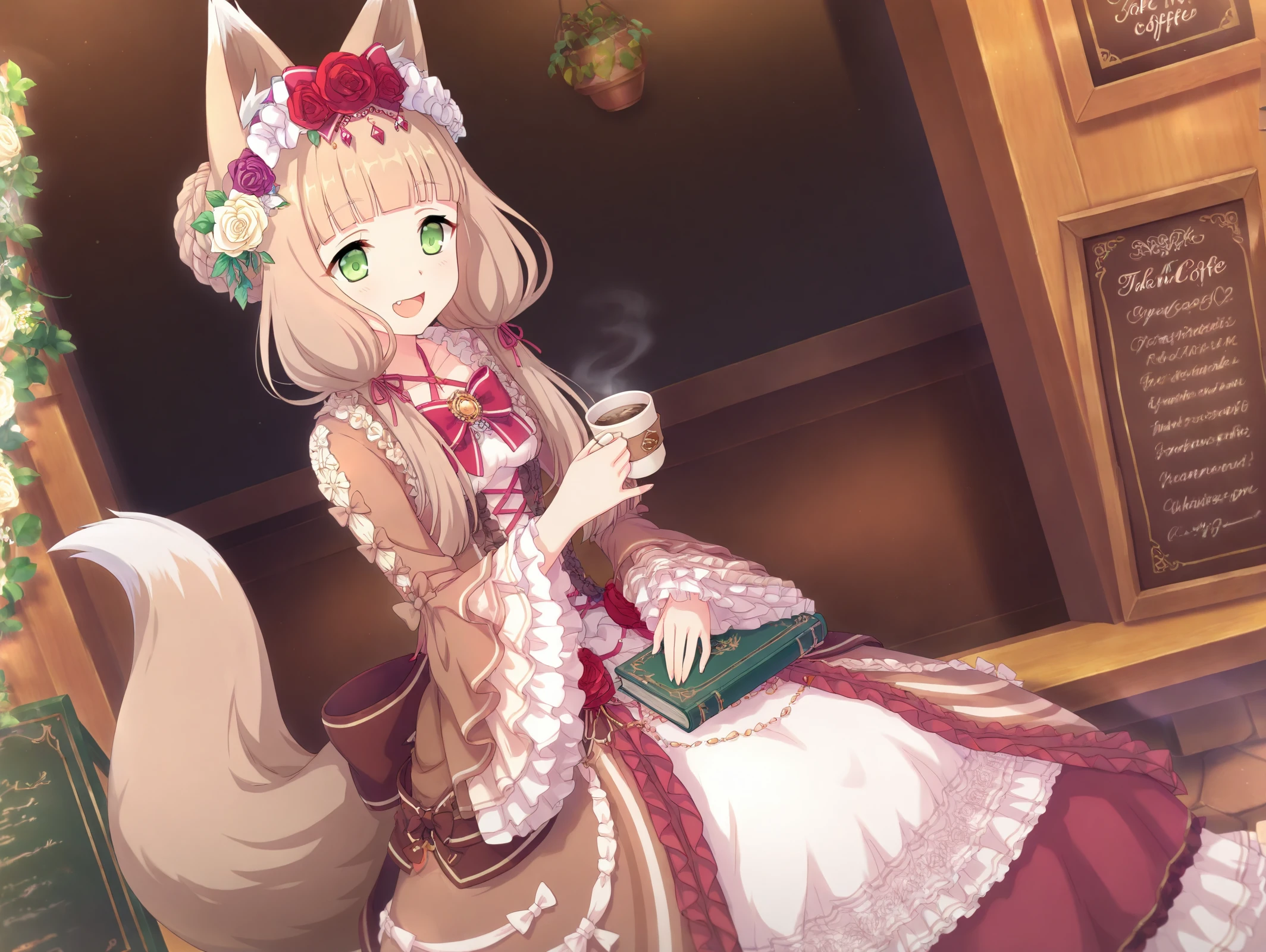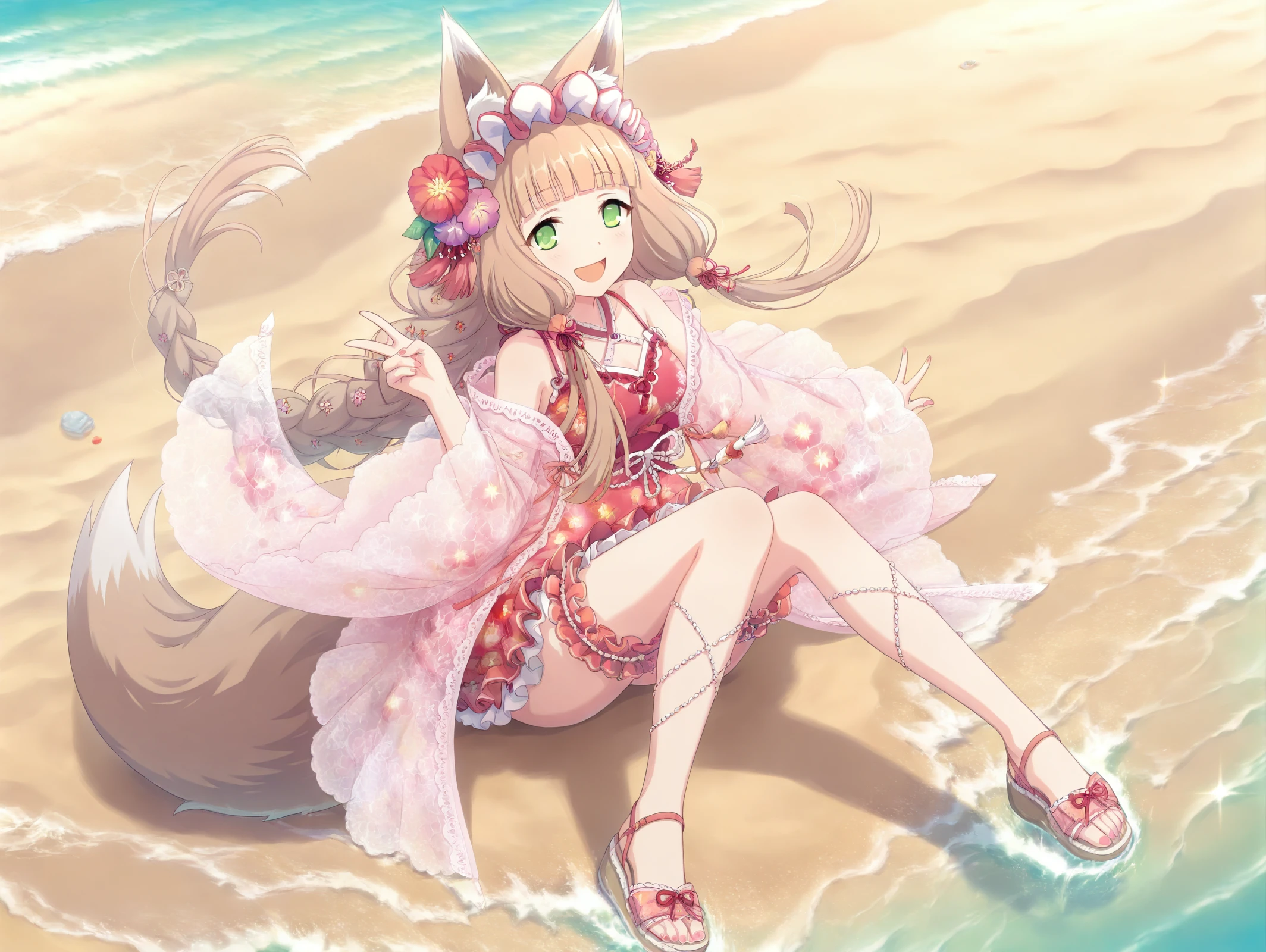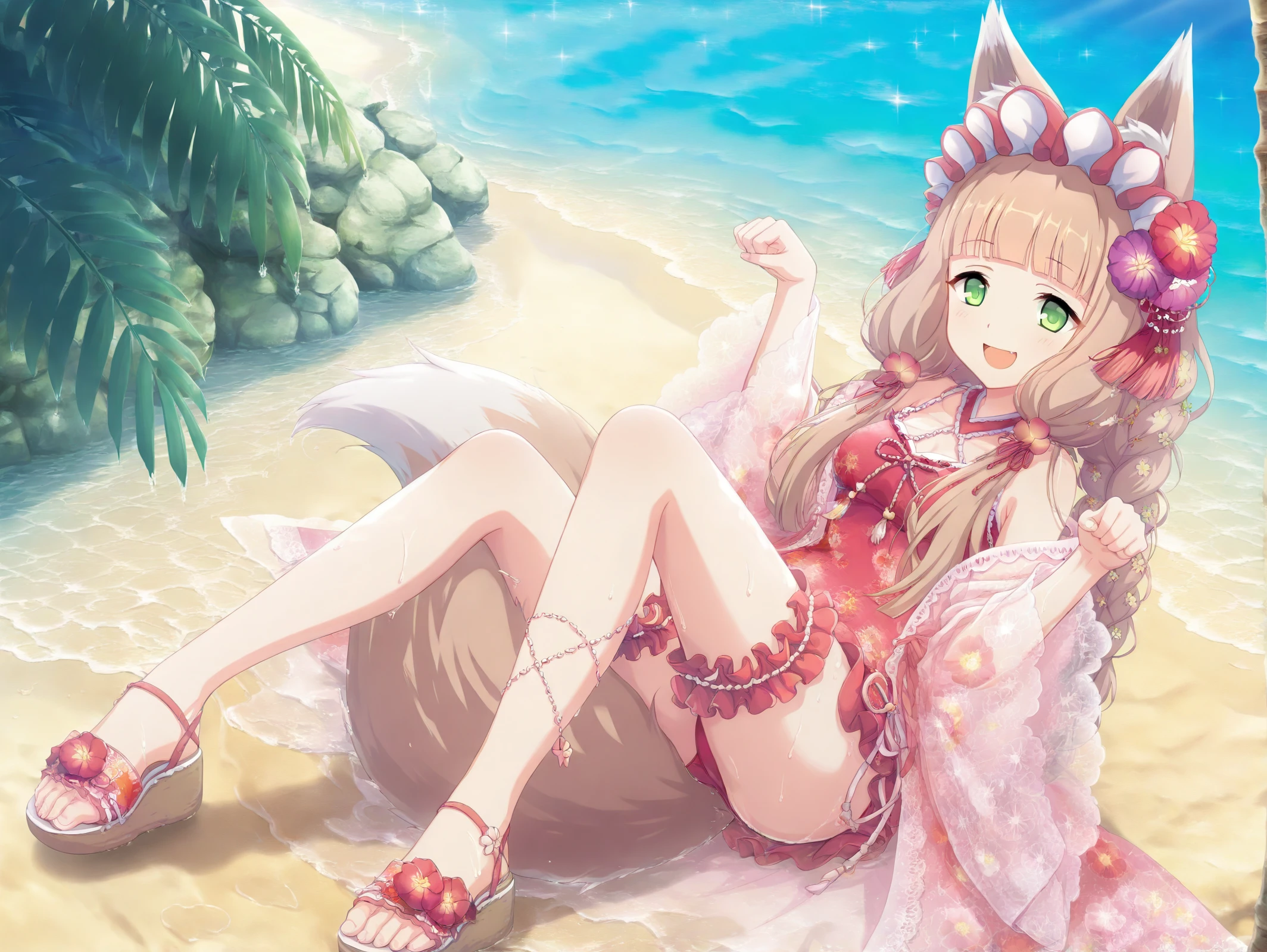 absurdres,official style,<lora:Maho54??:1>,1girl,dress swimsuit,solo,green eyes,sandals,fox ears,hair flower,blunt bangs,fox tail,brown hair,braid,fox girl,floral print,red dress,wide sleeves,:d,bridal garter,pink dress,light brown hair,beach,sitting in the sea,wet body,paw_pose,