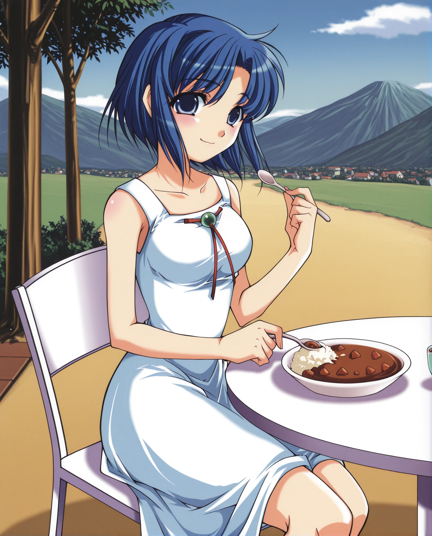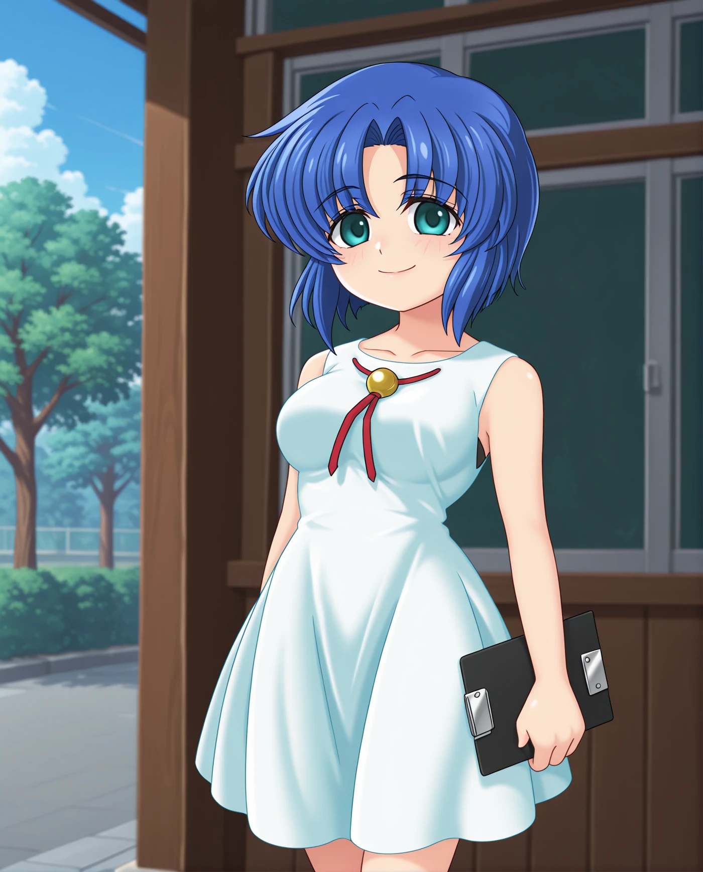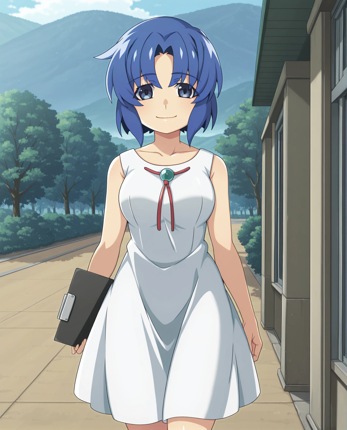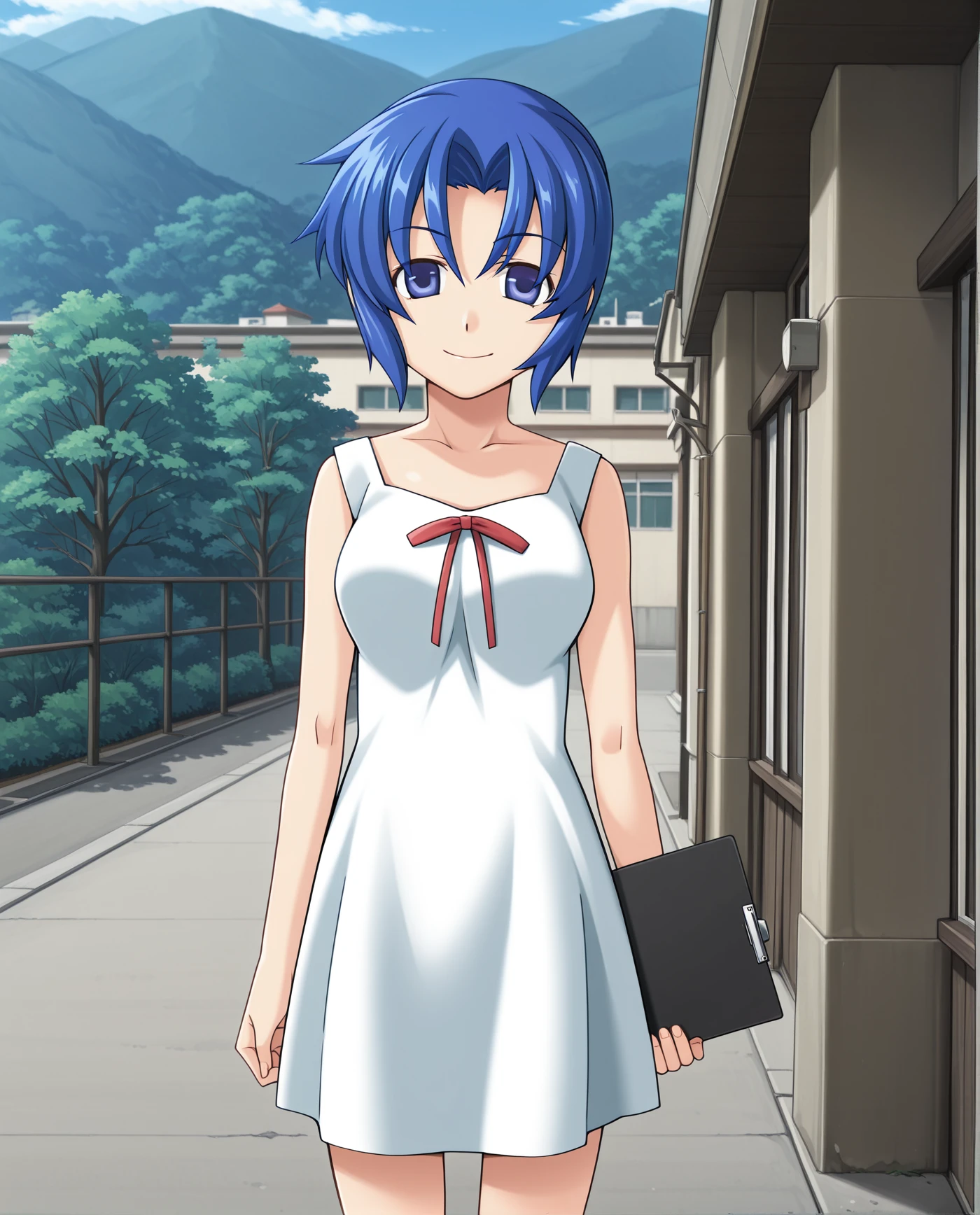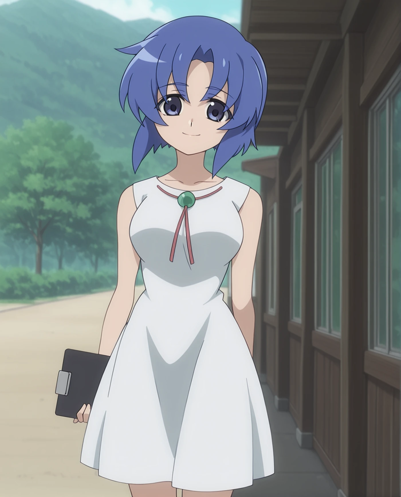chie rumiko, higurashi no naku koro ni, blue hair, breasts, short hair, bangs, blue eyes, medium breasts,