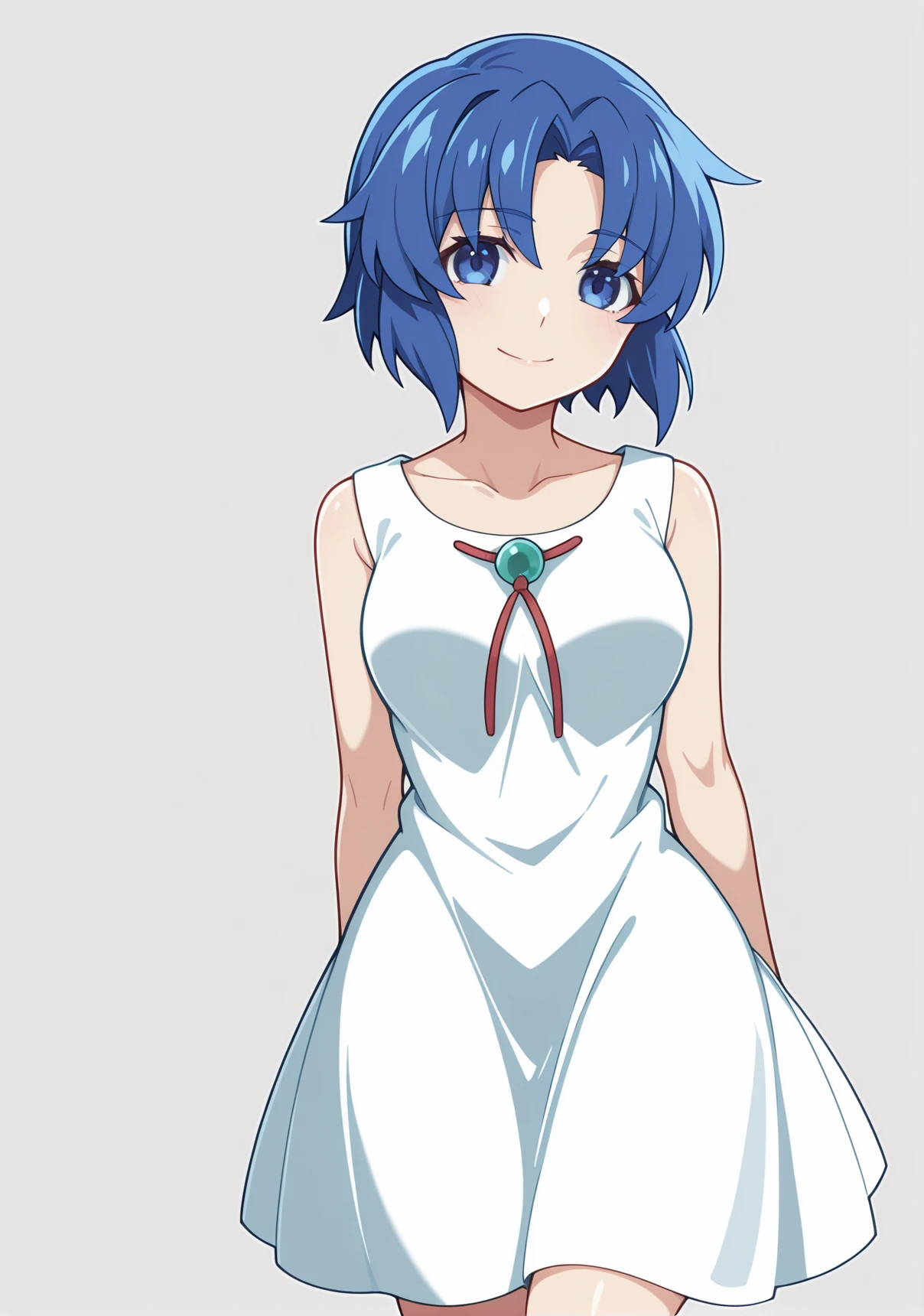 Physical description: chie rumiko, blue hair, ???????, short hair, bangs, blue eyes, medium breasts,
