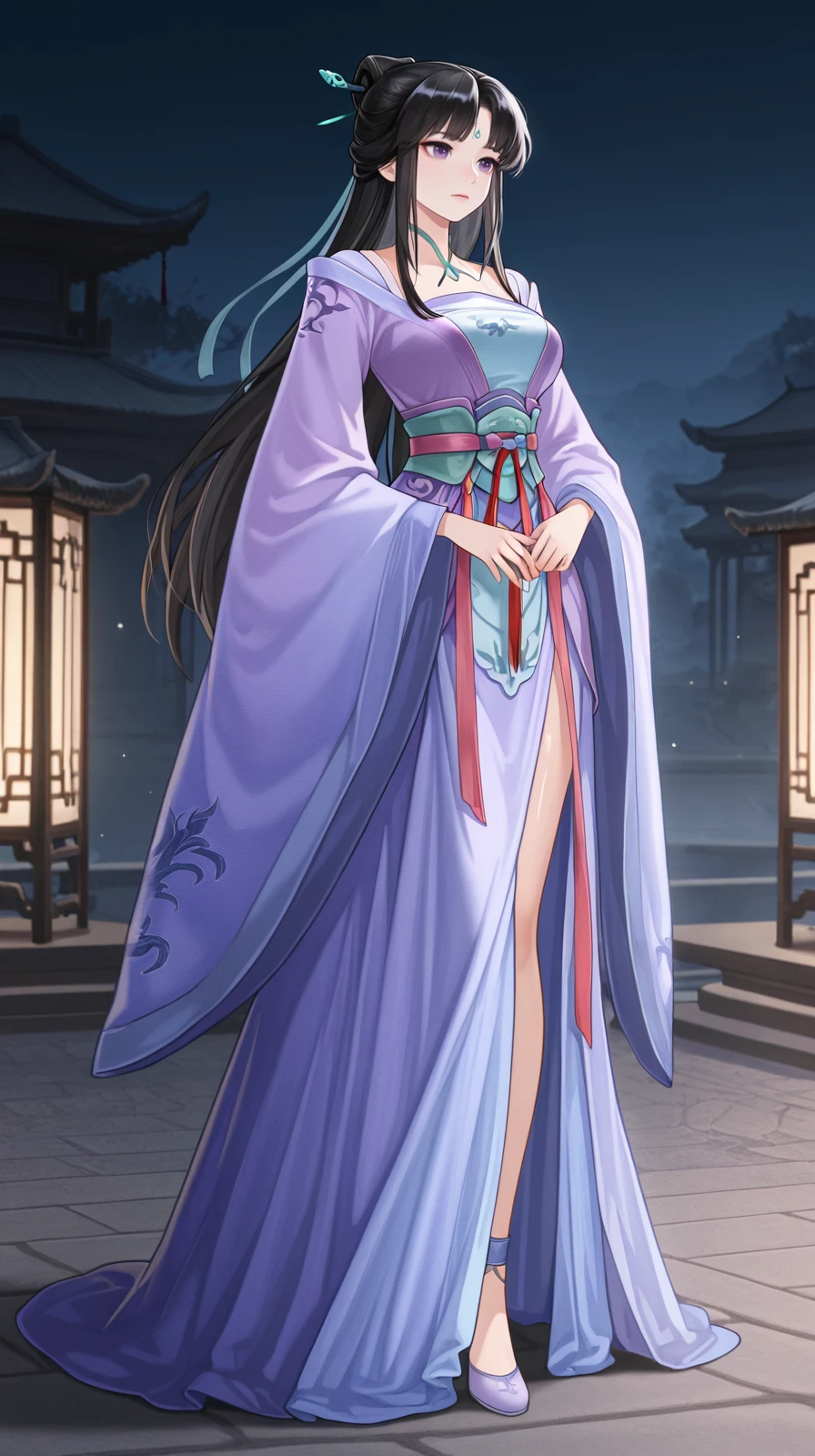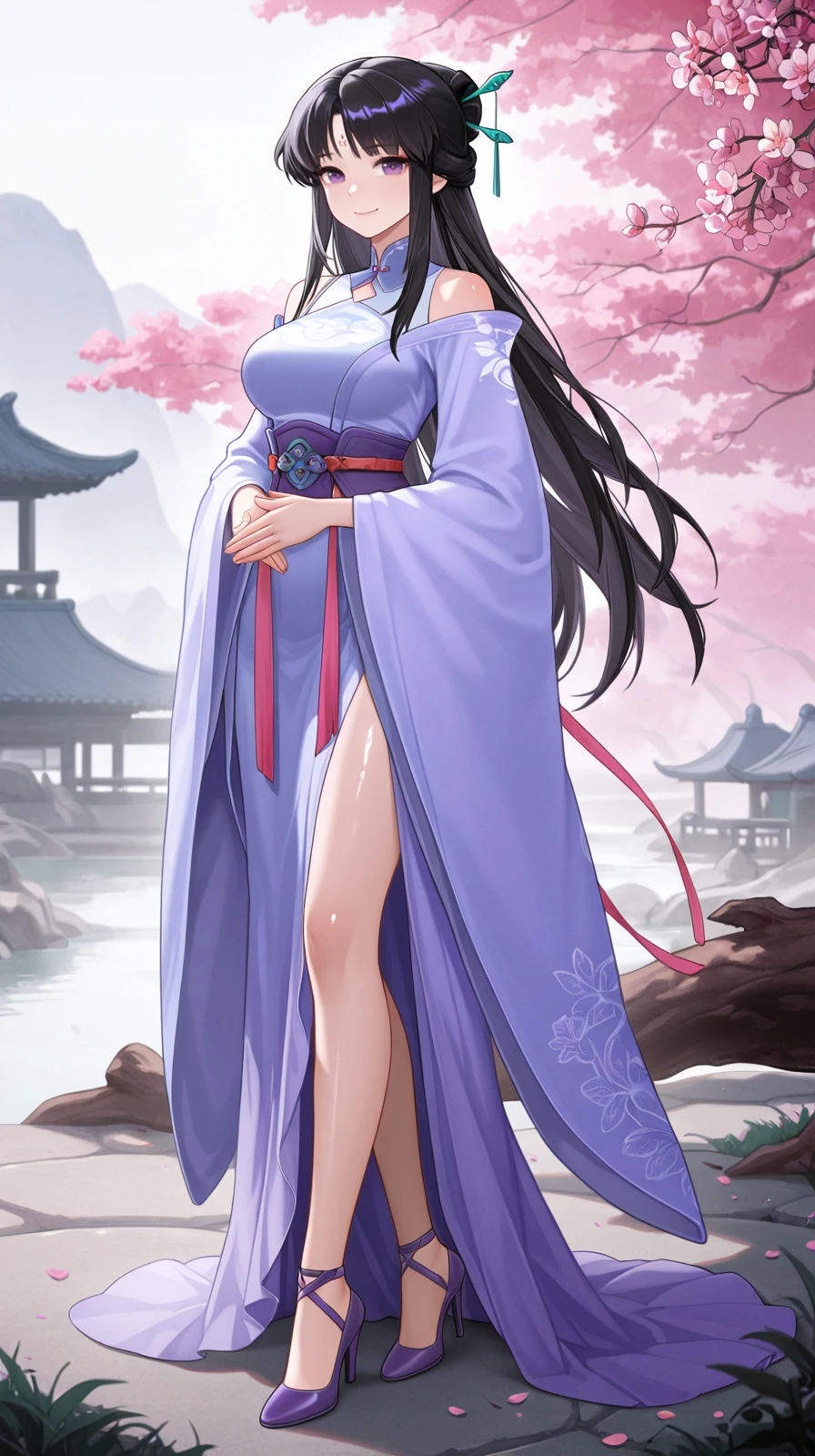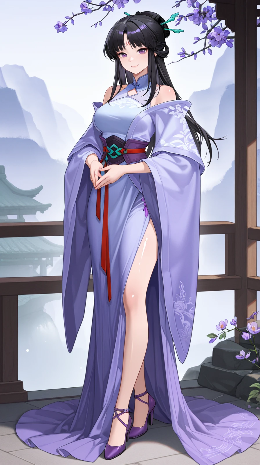 liumengli, jiuyou, 1girl, solo, black hair, long hair, low heels, branch, full body, dress, flower, hair ornament, smile, own hands together, sash, purple eyes, medium breasts, wide sleeves, hair stick, long flowing skirt, ruqun, purple footwear