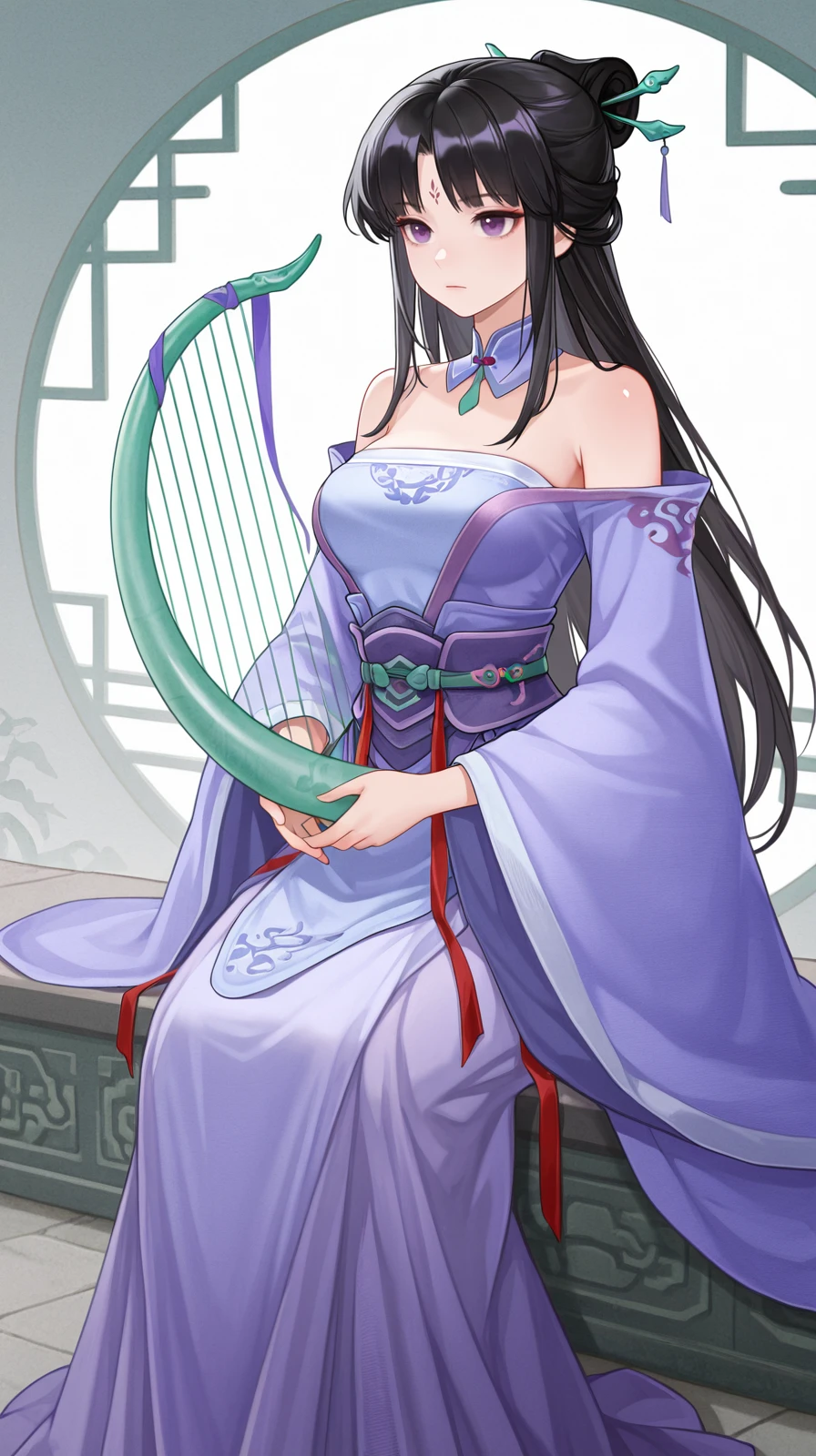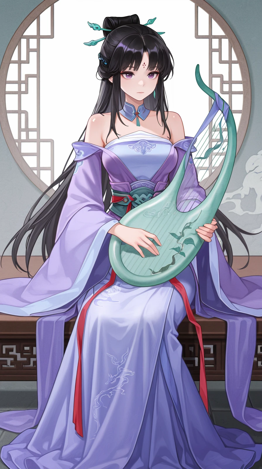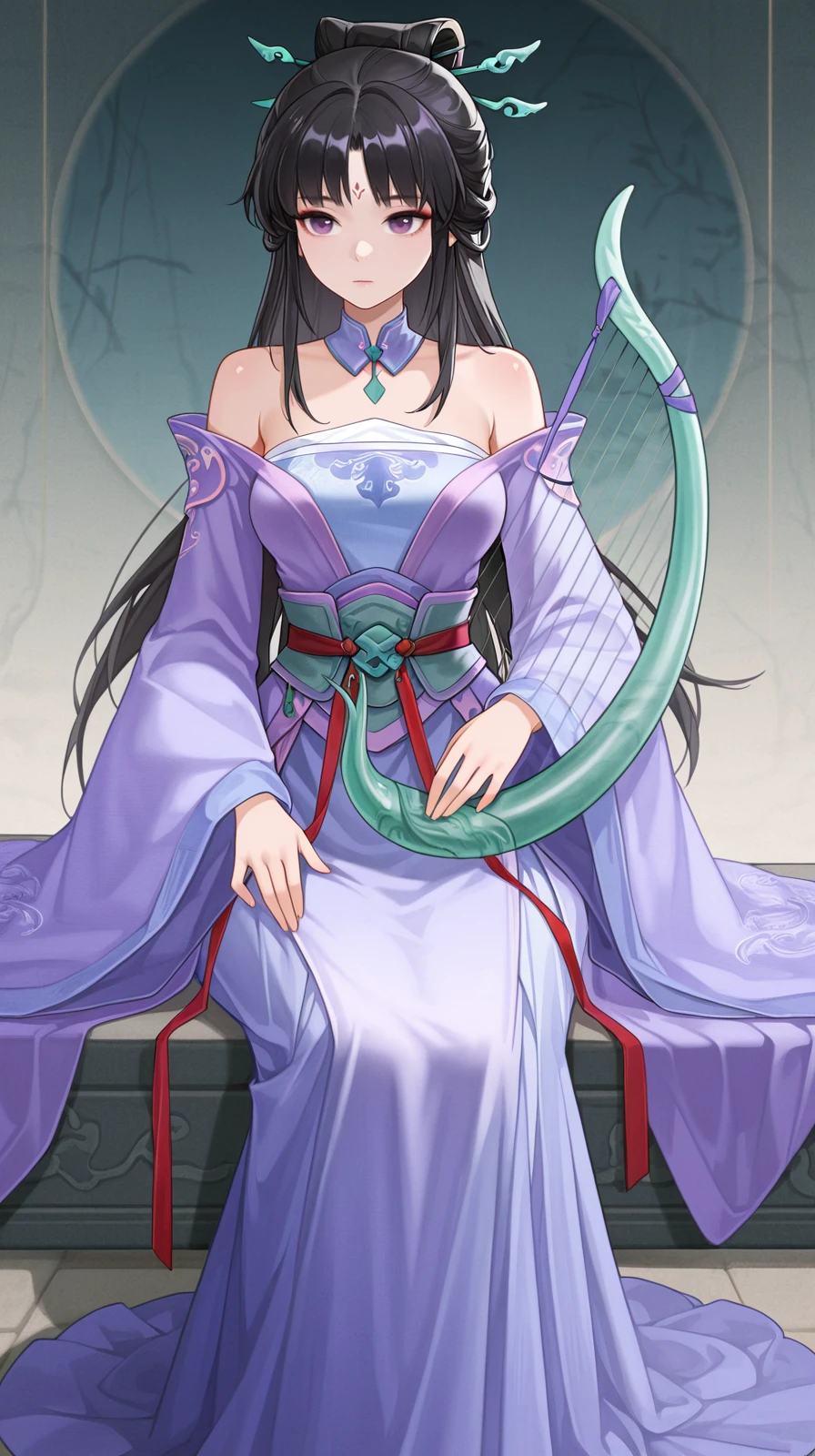 liumengli, jiuyou, 1girl, solo, instrument, long hair, hair ornament, forehead mark, bare shoulders, sitting, chinese clothes, facial mark, sash, black hair, purple eyes, medium breasts, wide sleeves, hair stick, expressionless, hanfu, long flowing skirt