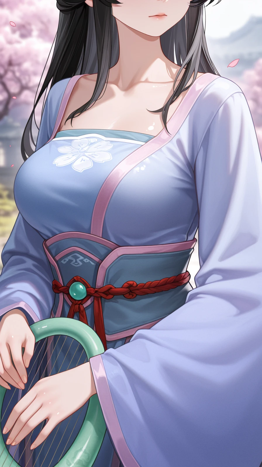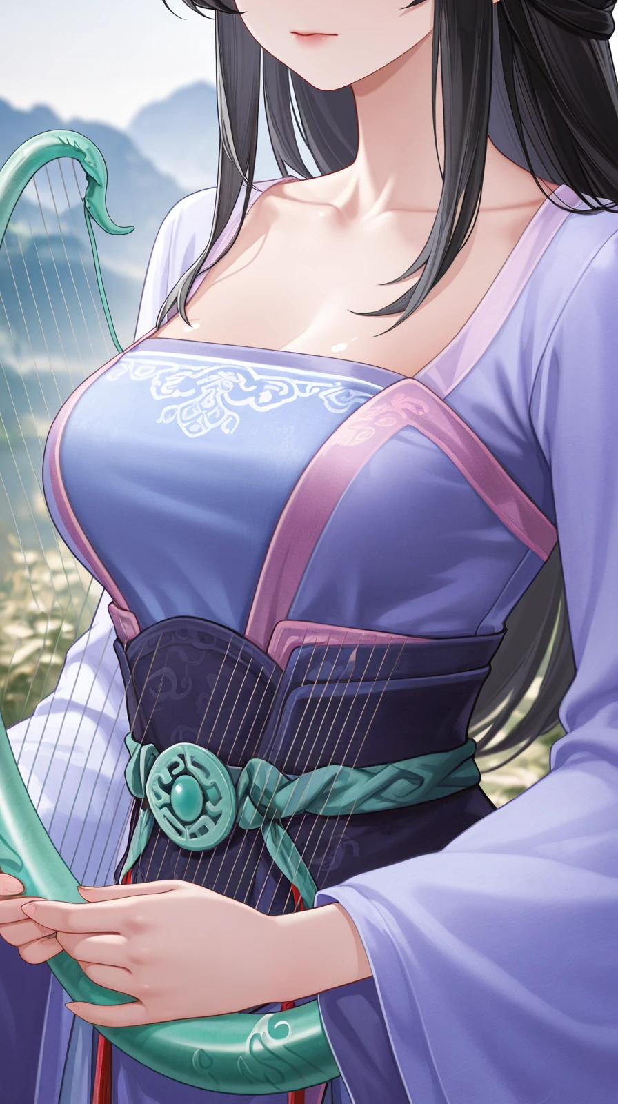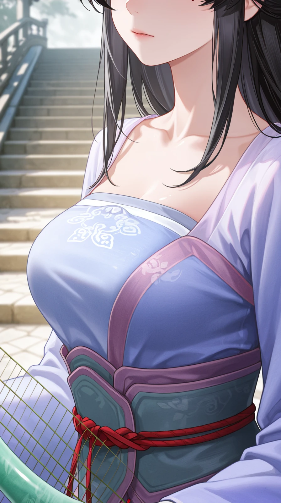 liumengli, jiuyou, 1girl, solo, instrument, long hair, hair ornament, forehead mark, bare shoulders, sitting, chinese clothes, facial mark, sash, black hair, purple eyes, medium breasts, wide sleeves, hair stick, expressionless, hanfu, long flowing skirt