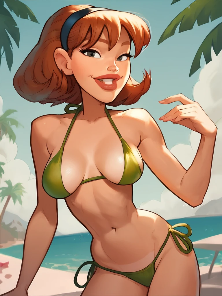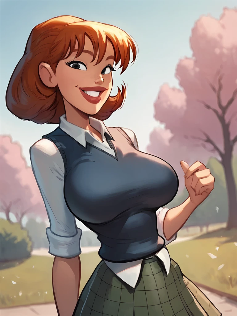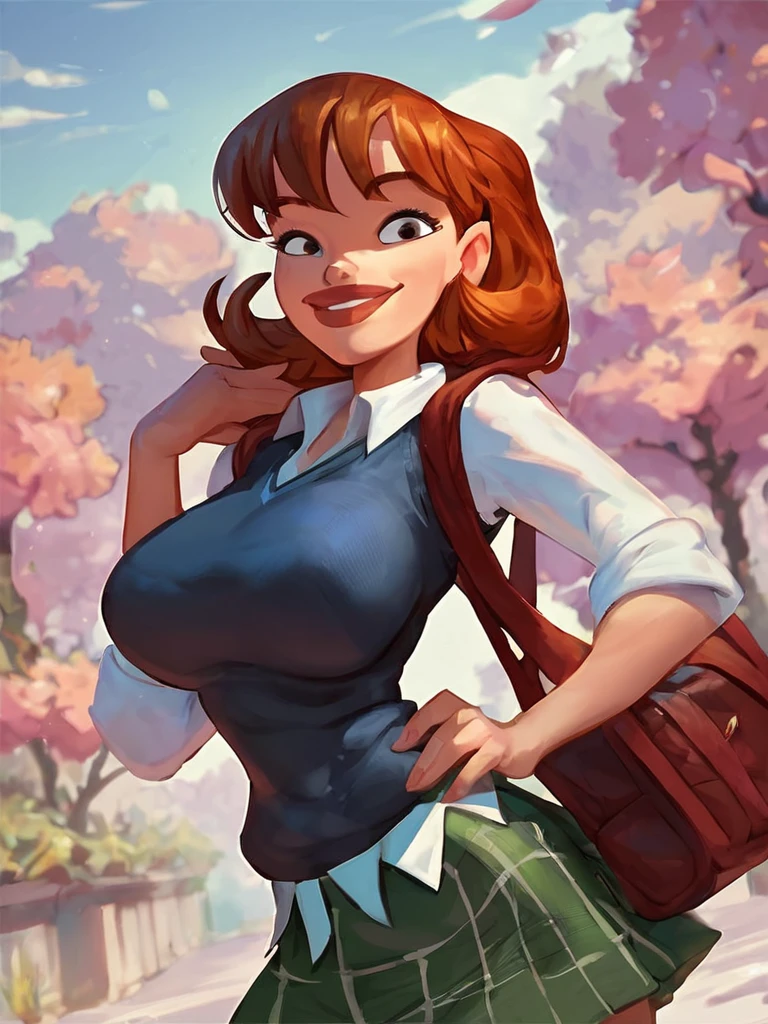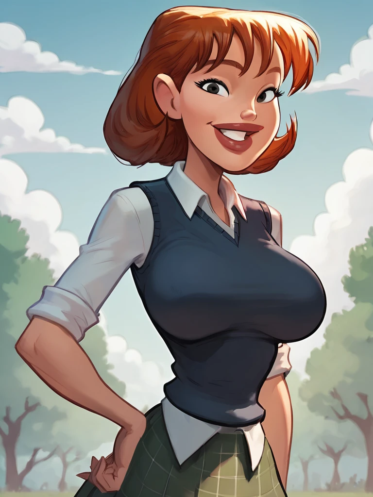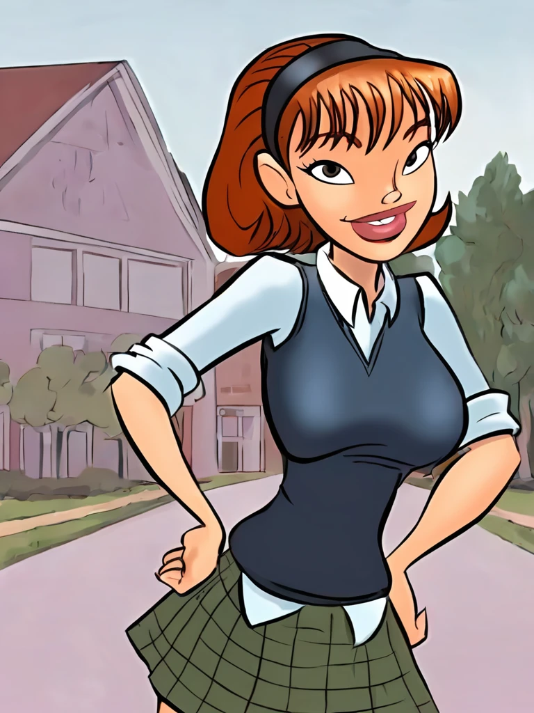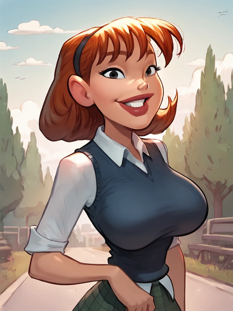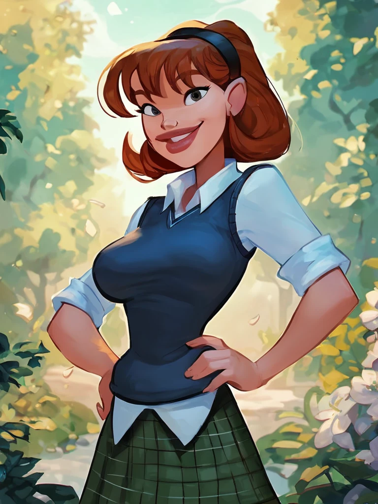 sharona, 1girl, hairband, breasts, solo, lips, school uniform,sweater vest,skirt