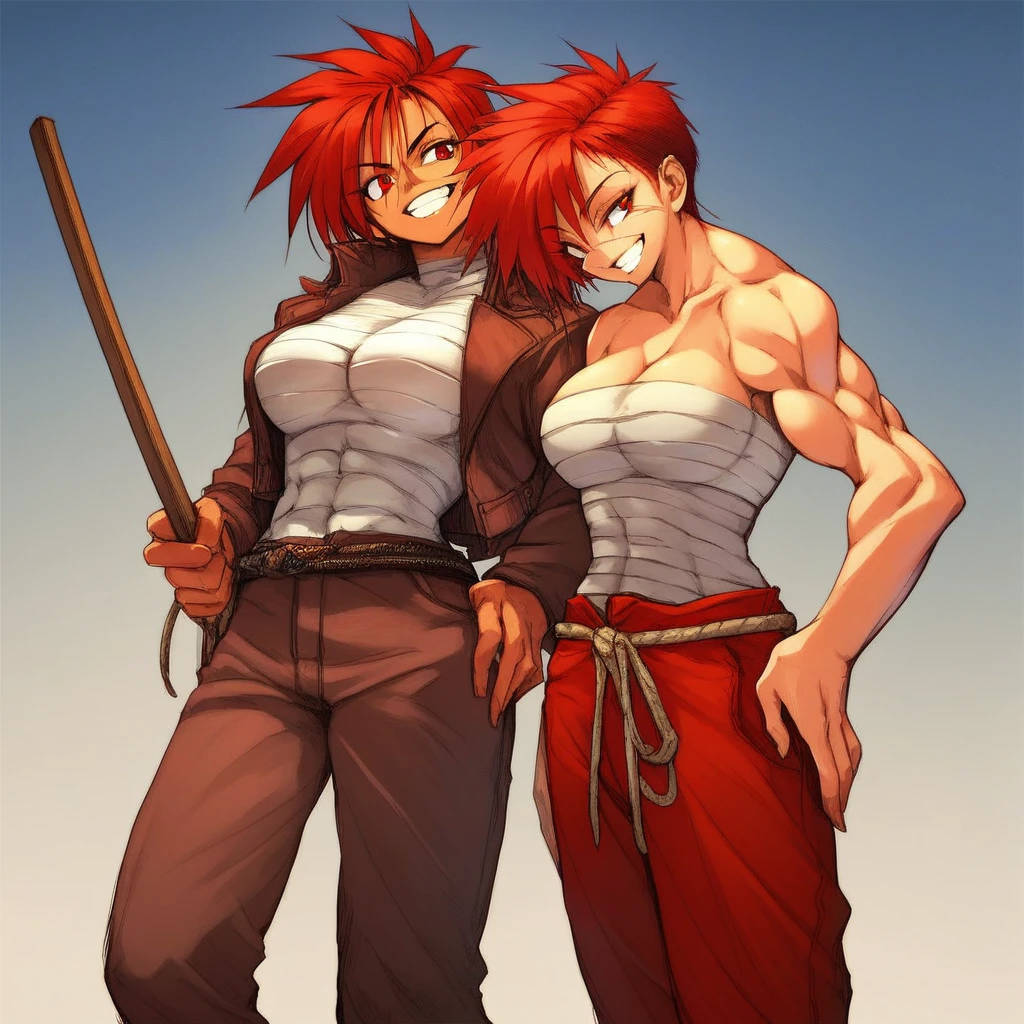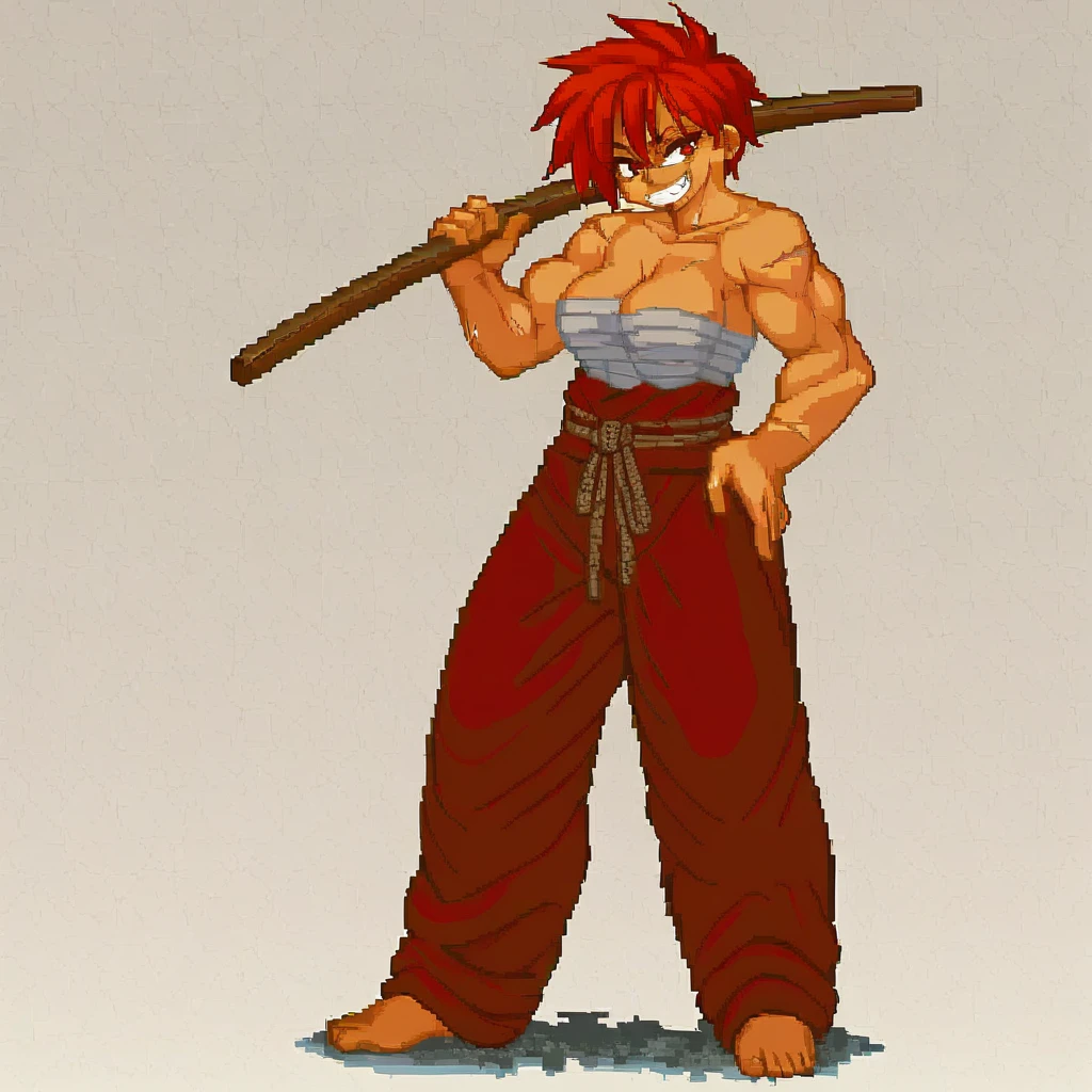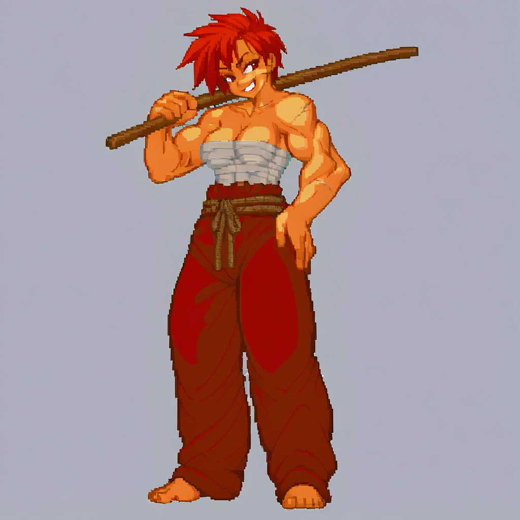 Red hair, red eyes, scars on face, dark skinned, muscular female, large breasts, barefoot