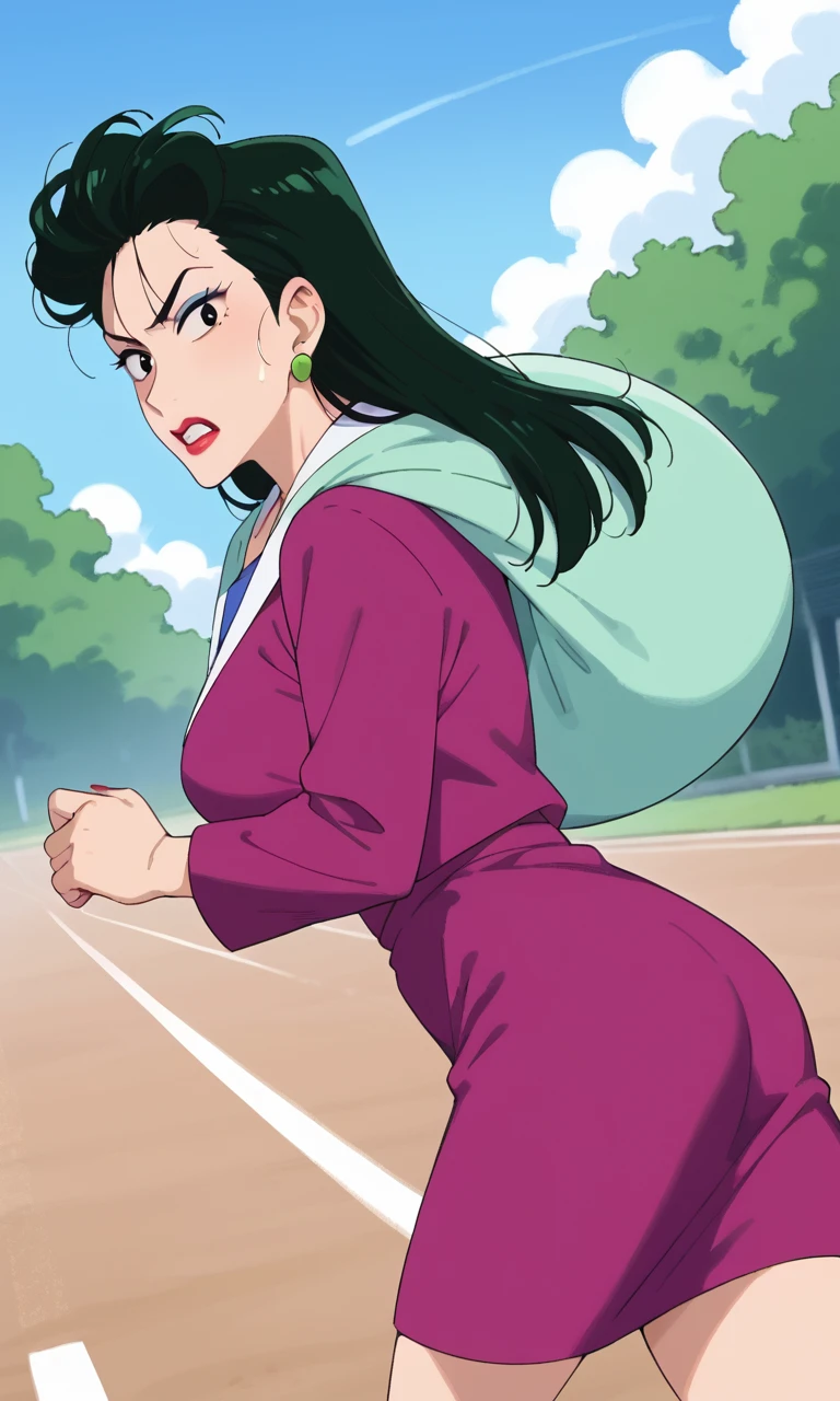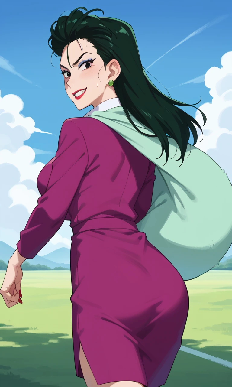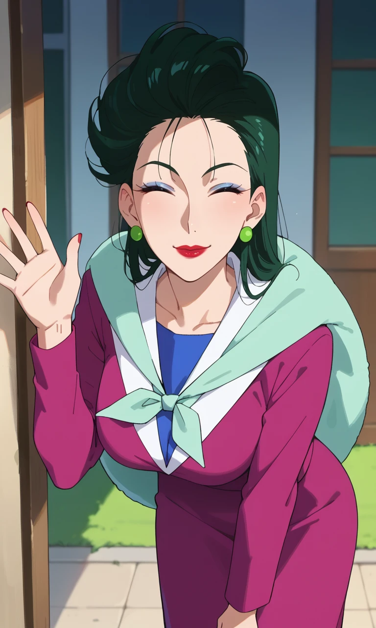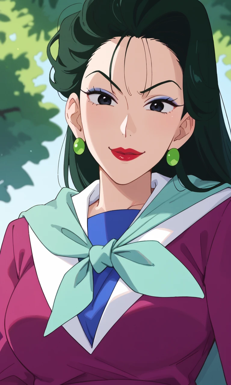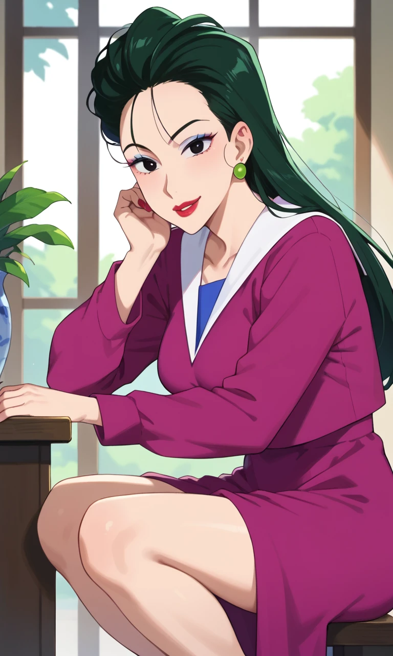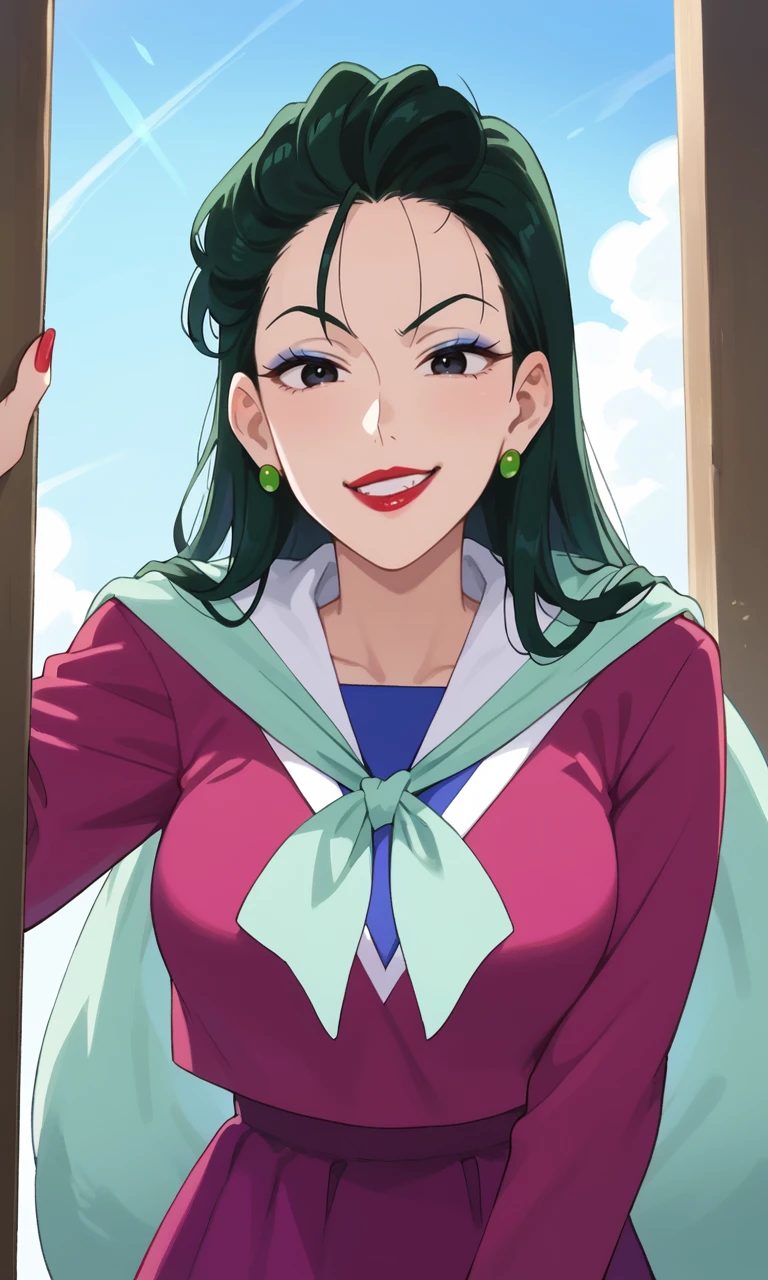 black eyes, eyelashes, blue eyeshadow, dark green hair, long hair, hair slicked back, earrings, red lips, lipstick, makeup, red nail polish, purple dress, white sailor collar, blue inner t-shirt, long sleeves, large breastsFuroshiki: (Ver.2 only)