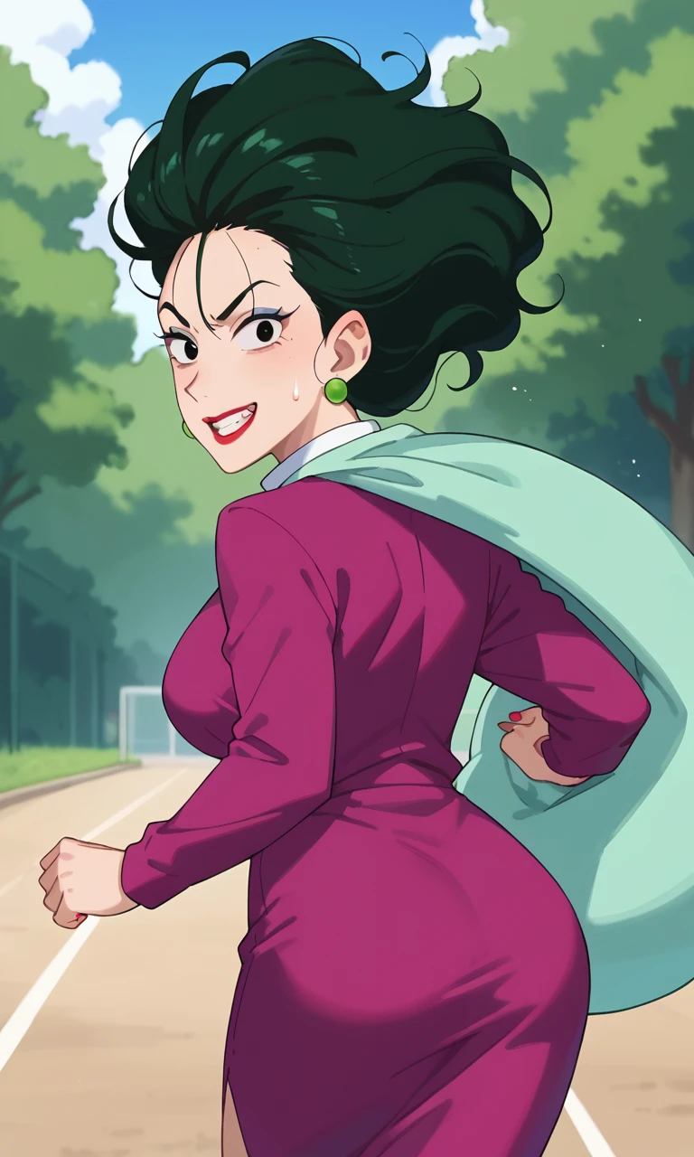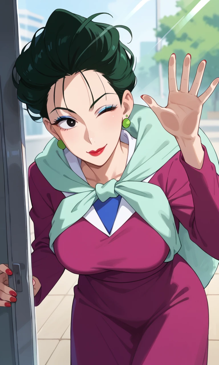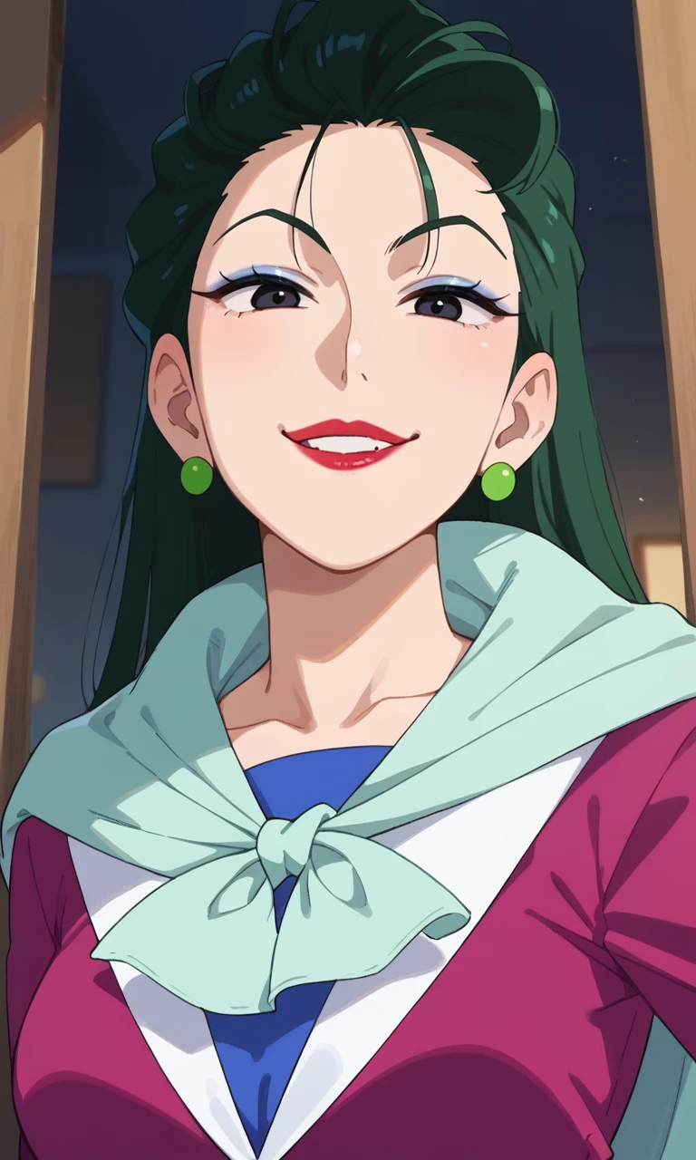 black eyes, eyelashes, blue eyeshadow, dark green hair, long hair, hair slicked back, earrings, red lips, lipstick, makeup, red nail polish, purple dress, white collar, collared dress, blue inner t-shirt, long sleeves, large breasts