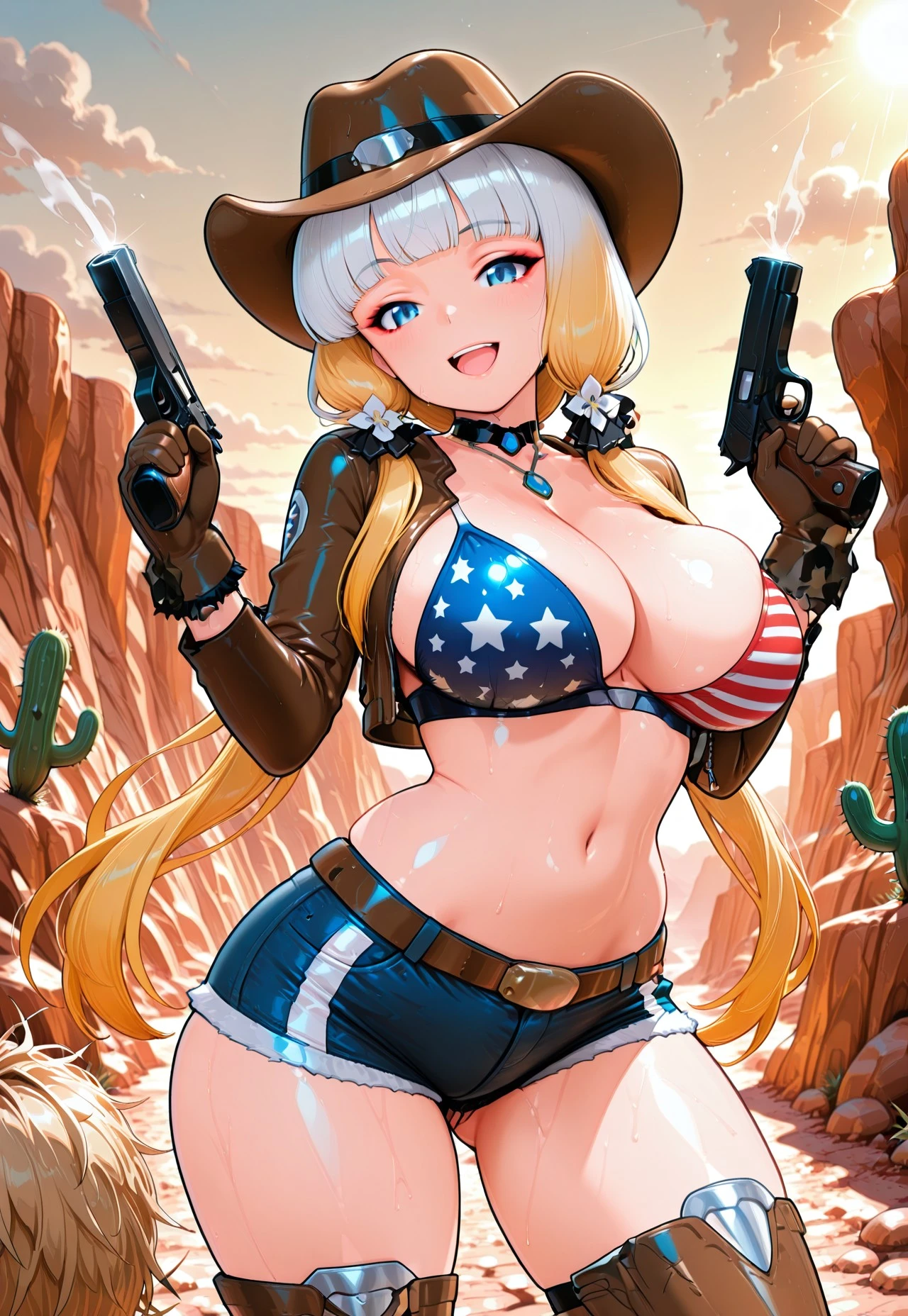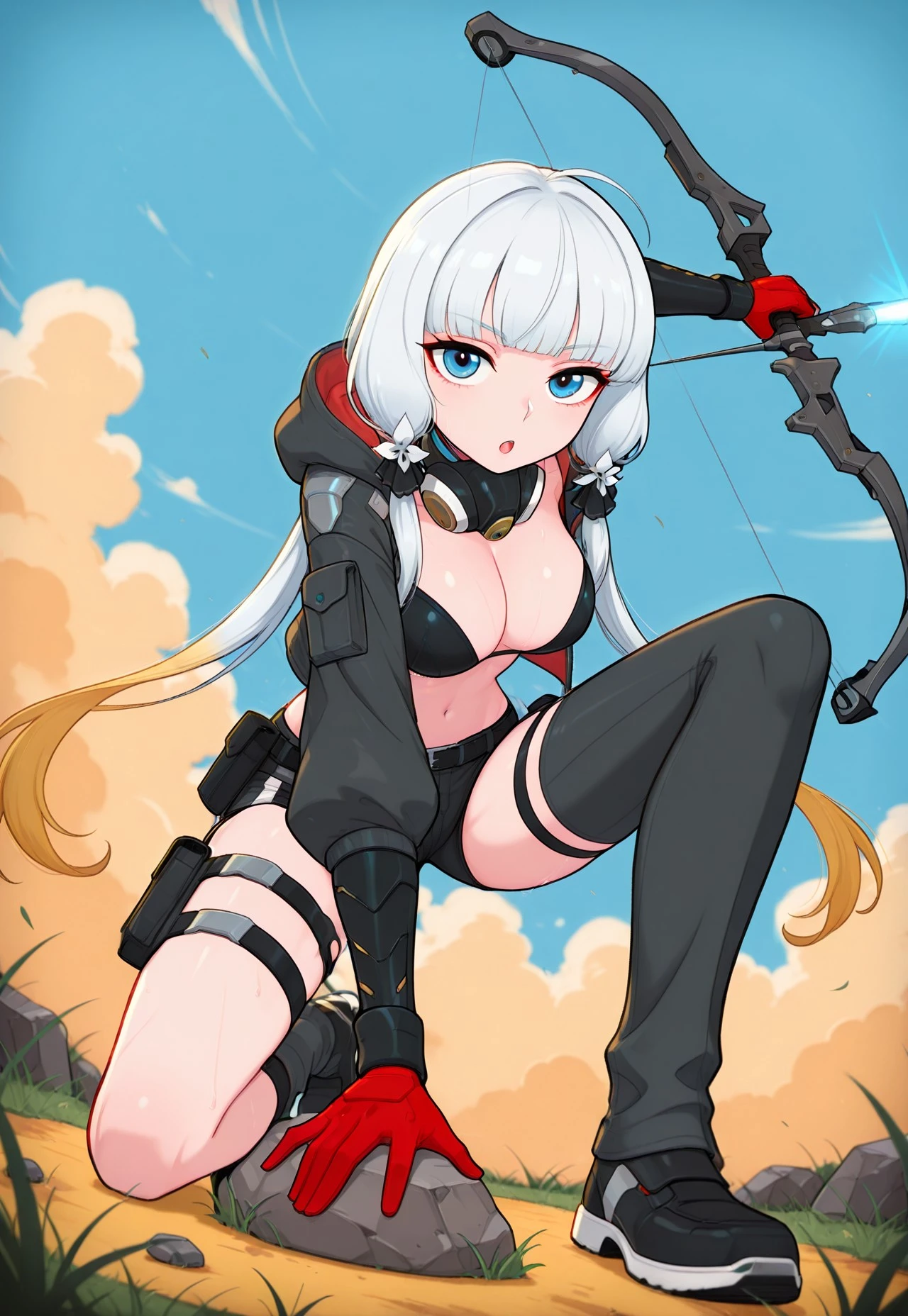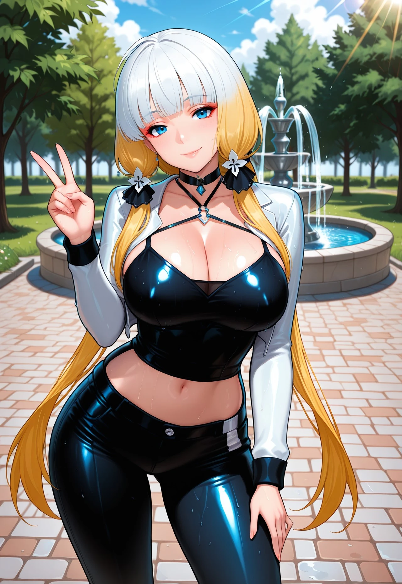 ayminwr,1girl,mature female,low twintails,blue eyes,multicolored hair,white hair,yellow tips,yellow gradient hair,blunt bangs,long hair,Outfit: